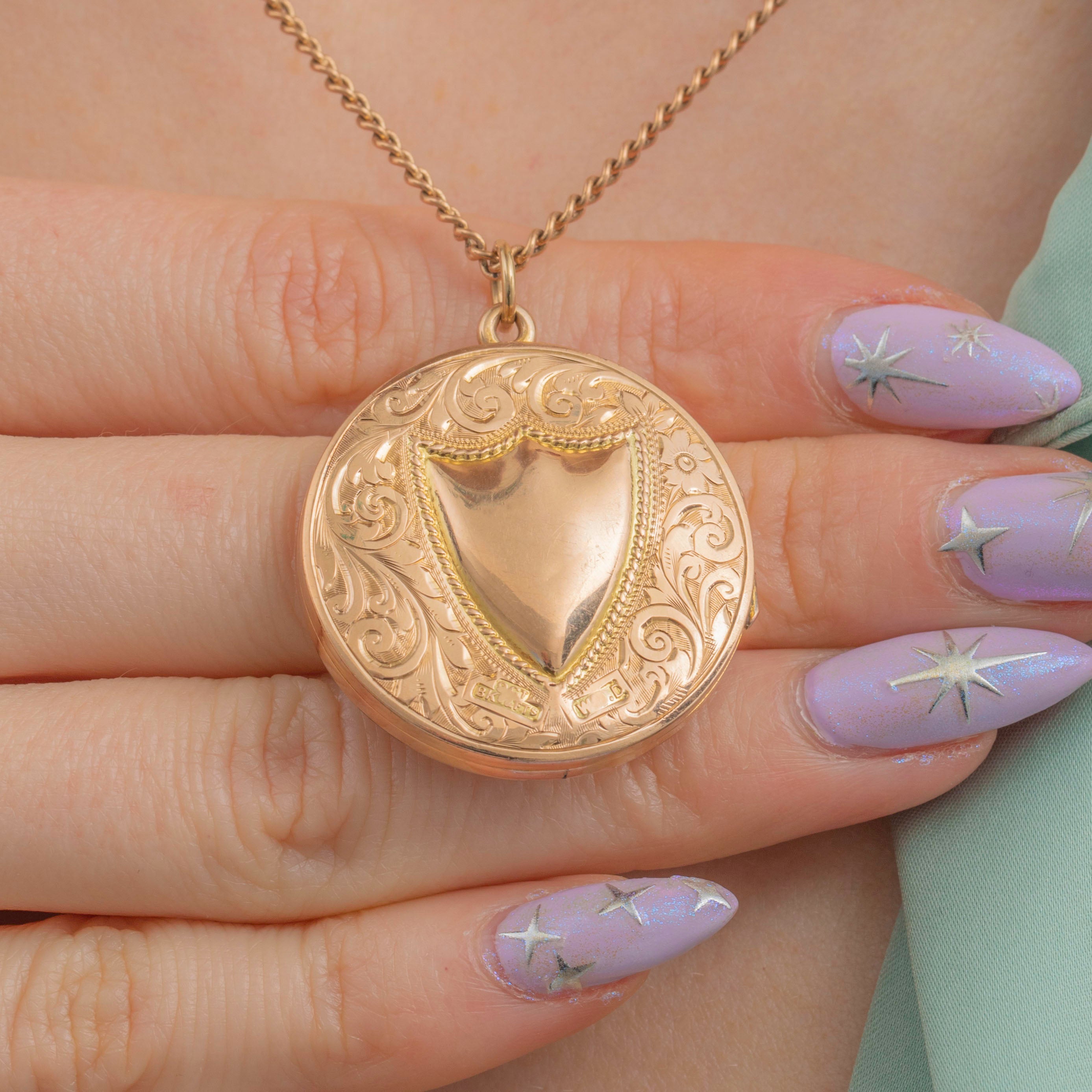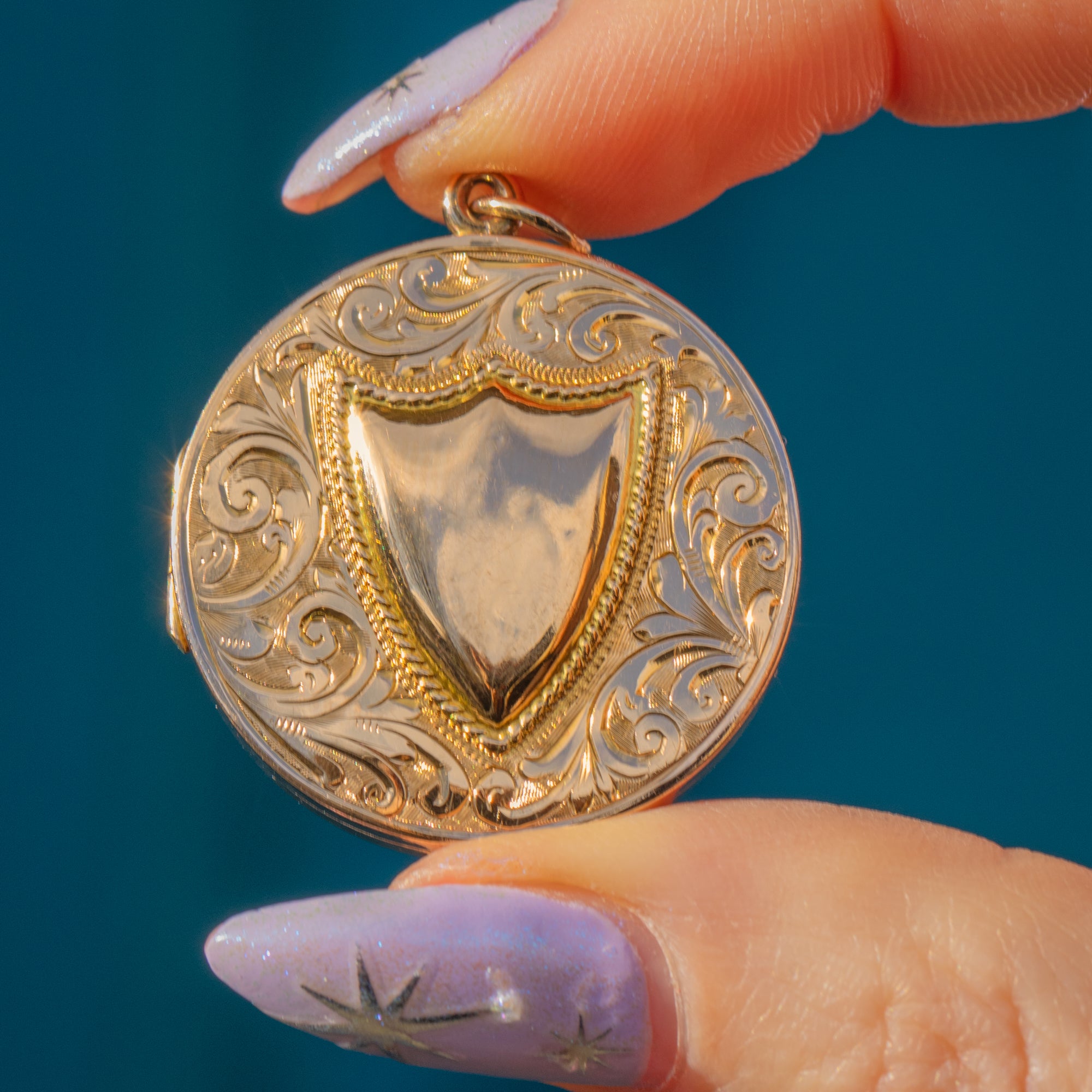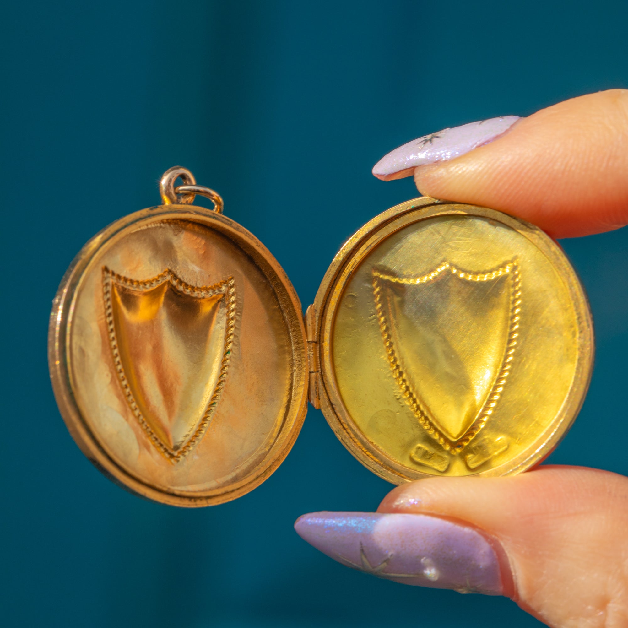 Large Antique 9ct Gold Engraved Round Locket, Shield Motif
