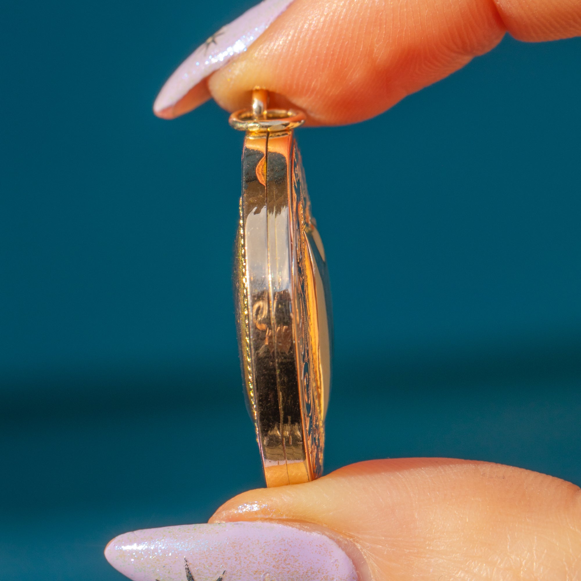 VERY GOOD. This large antique 9ct Gold engraved round locket is in superb condition. The Gold is bright with lovely reflective qualities and the shield motifs and engraved details have all remained defined. There are a couple of dings to the shields, but this is only noticeable under close inspection and can easily be forgiven considering the locket's impressive age! There is one frame present, original to the piece, but if cut to size you could add two photos if you wish. The locket closes securely allowing you to use and enjoy this decorative Victorian Gold locket confidently for years to come!