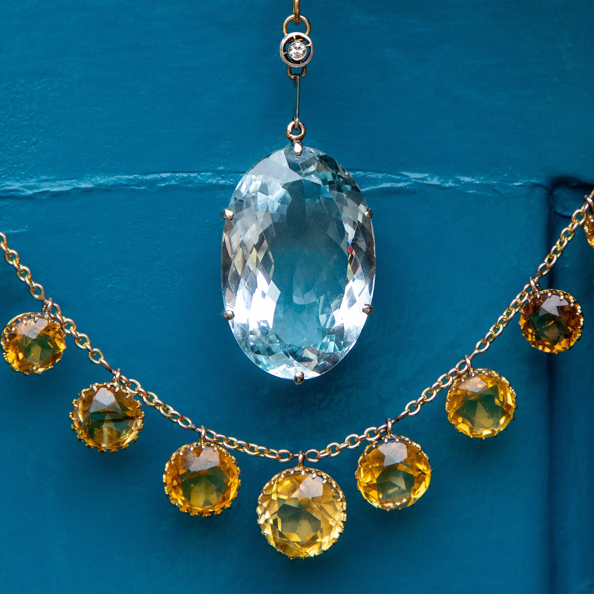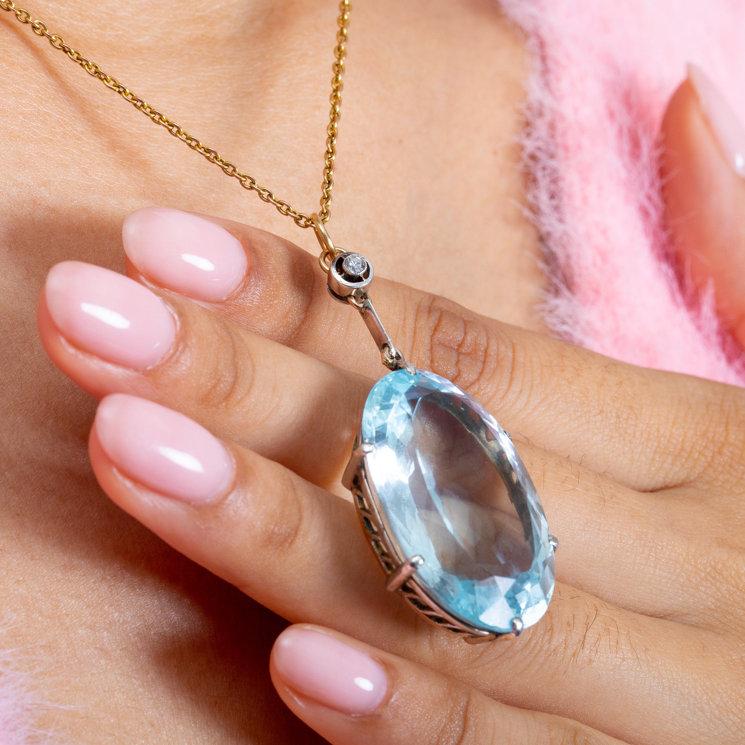 We simply adore this large antique Aquamarine oval pendant! Exuding glacial blue hues from every dazzling facet of her 39.00ct Aquamarine, this splendid Edwardian pendant will charm its way into being your new favourite piece.