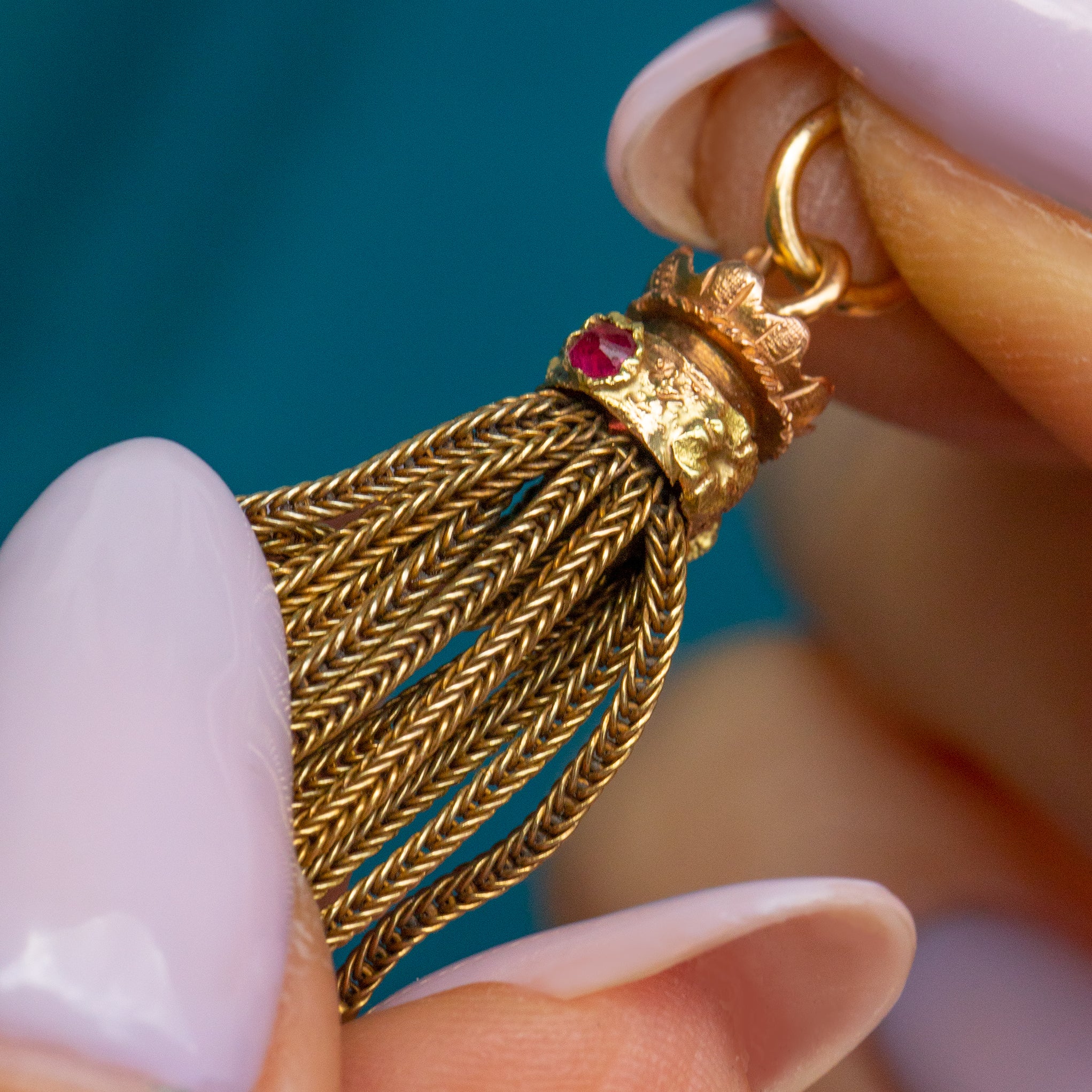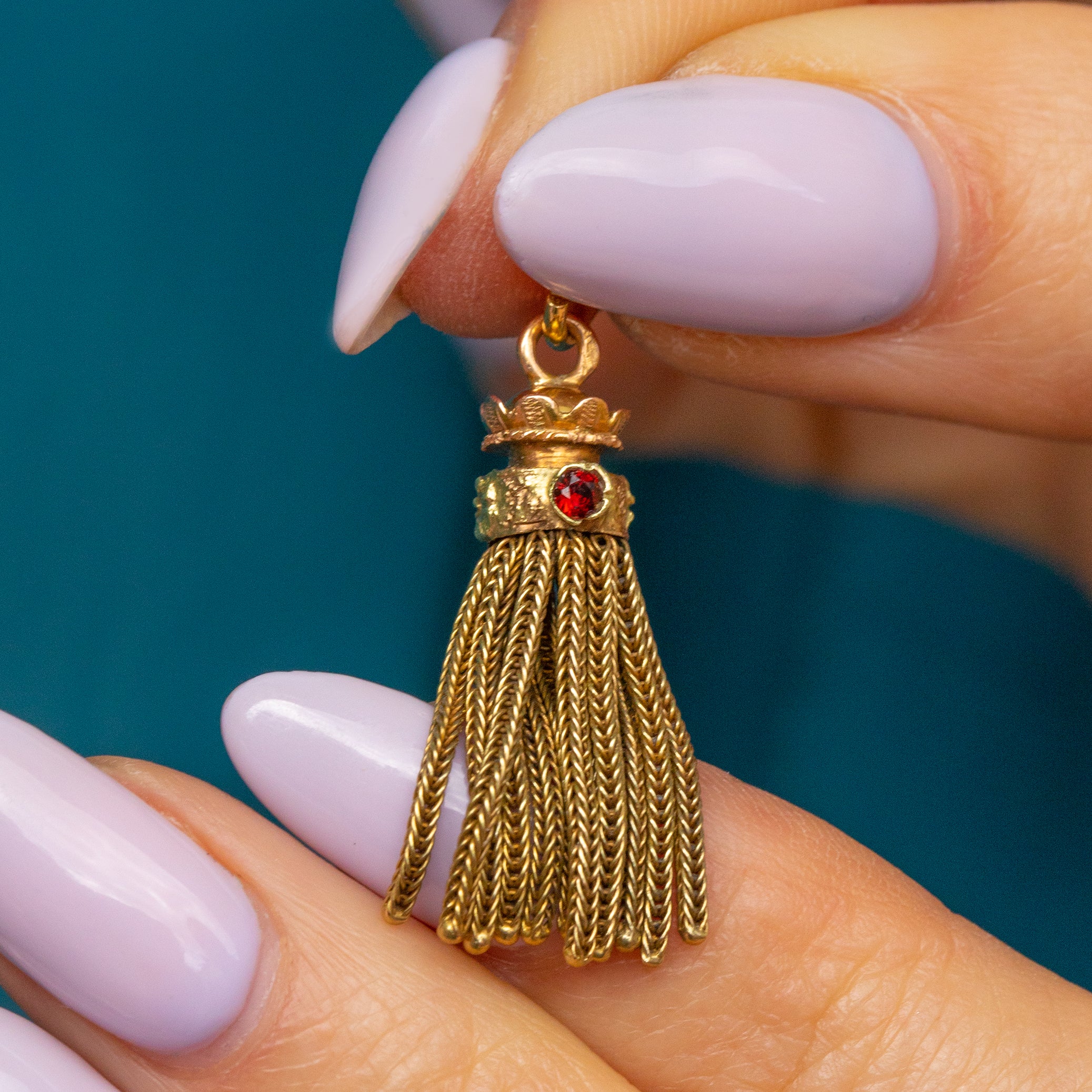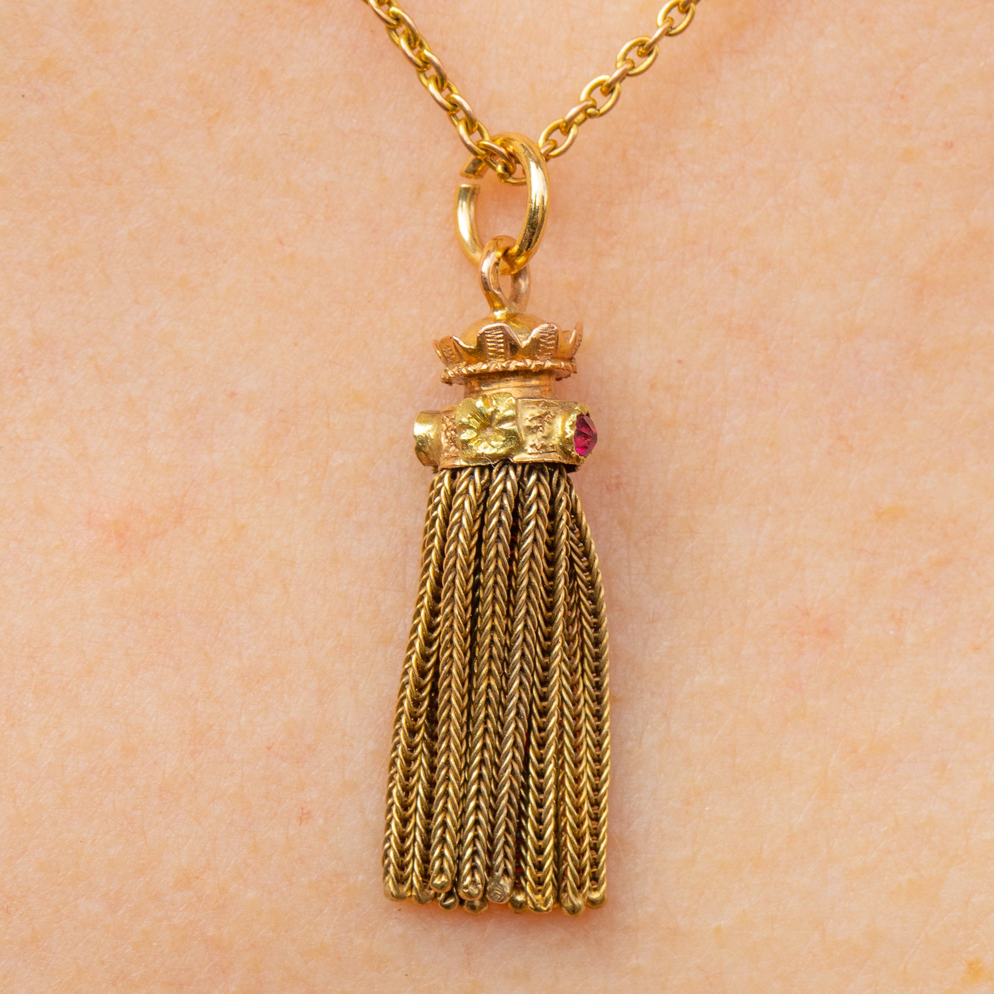 EXCELLENT. This Napoleon III French 18ct Gold tassel pendant is in excellent condition. The Gold is buttery and each foxtail chain tassel is neatly woven and firmly affixed. The Garnets are securely set and free from any signs of wear, with crimson flashes as their rose-cut facets catch the light. Complete with a soldered jump ring, all this pendant needs is a chain to adorn!