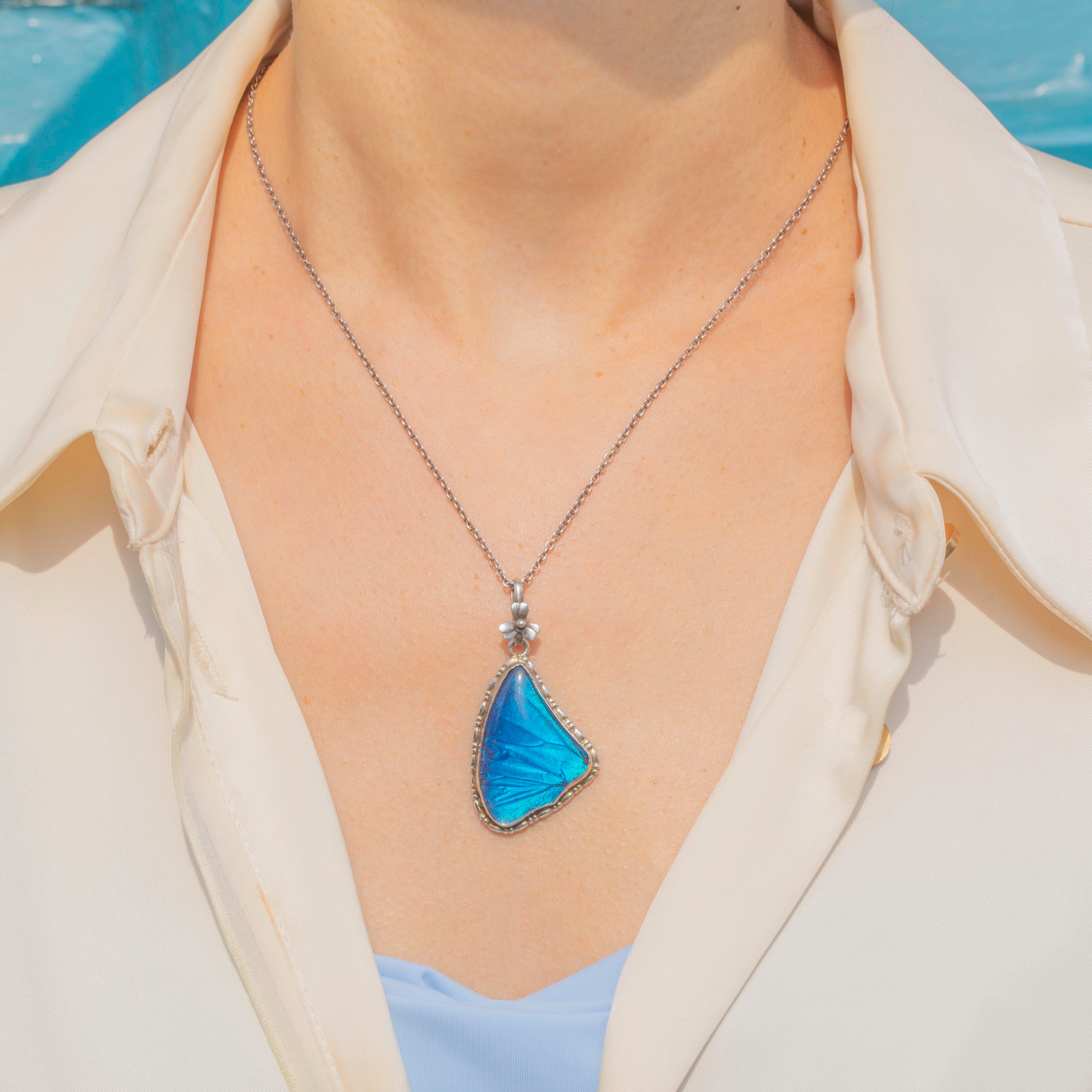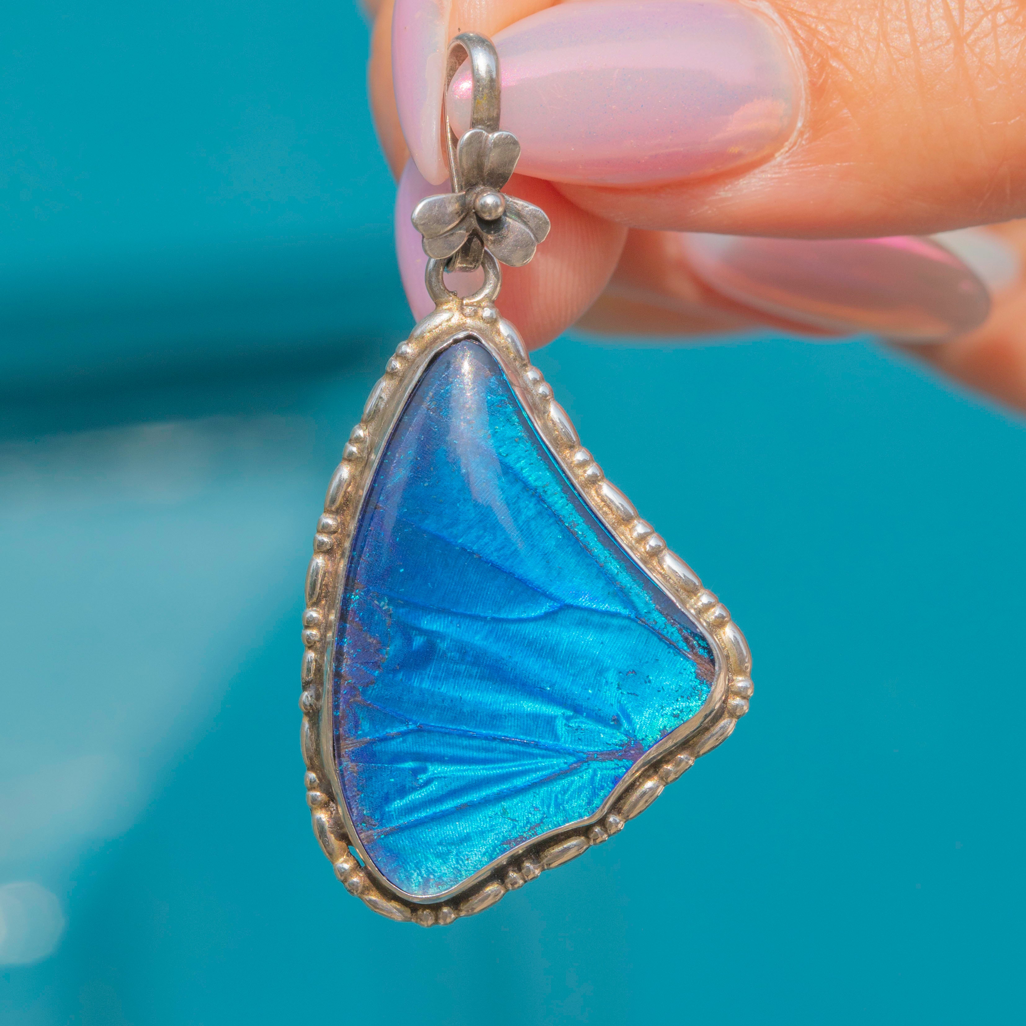 This vibrant Art Deco piece is centred by a bright azure Morpho butterfly wing, radiating a characteristic luminous sheen, and is set beautifully in a lustrous Silver bezel. A motif quintessential to the Art Deco period, this butterfly wing pendant is the perfect large and colourful piece to add antique allure to your collection.