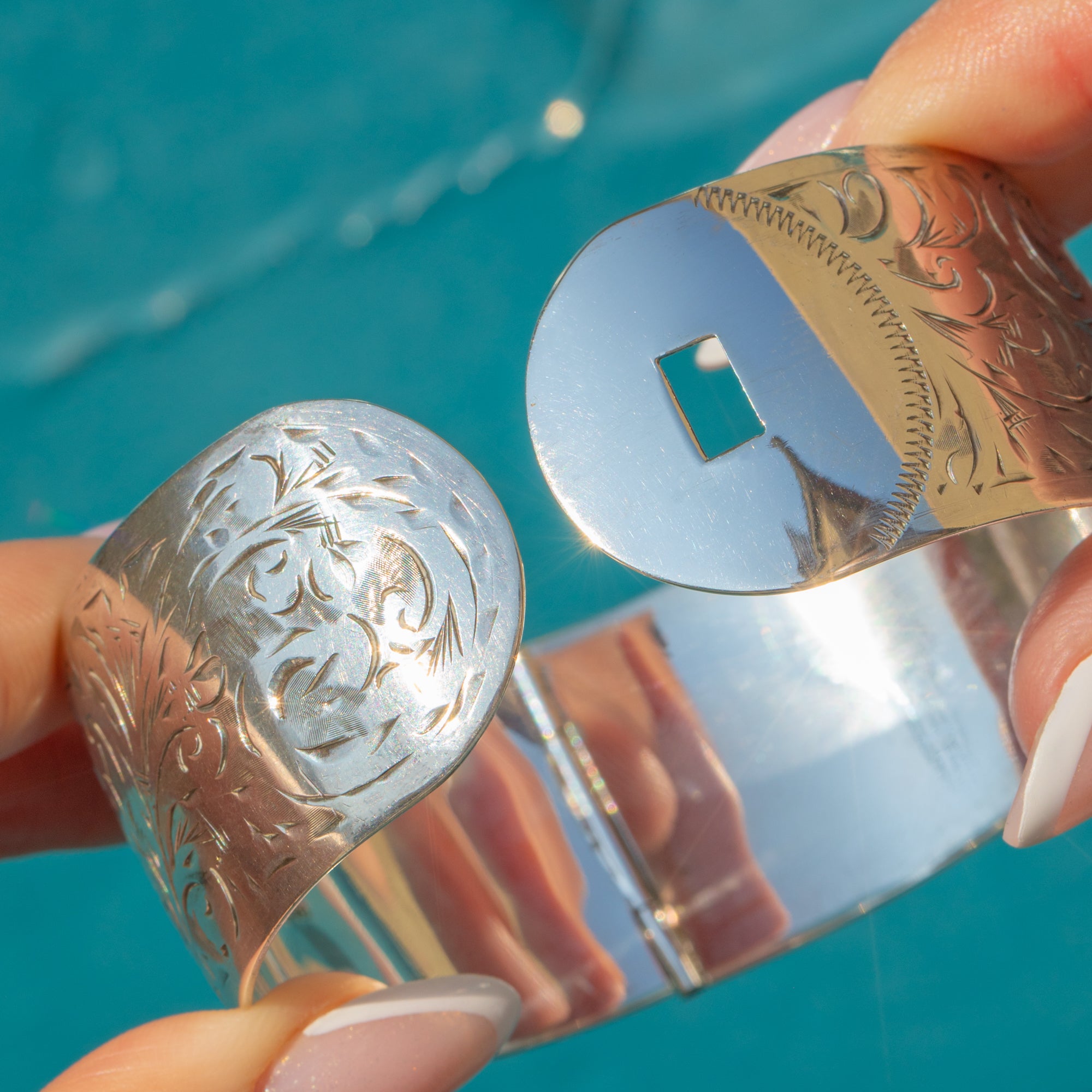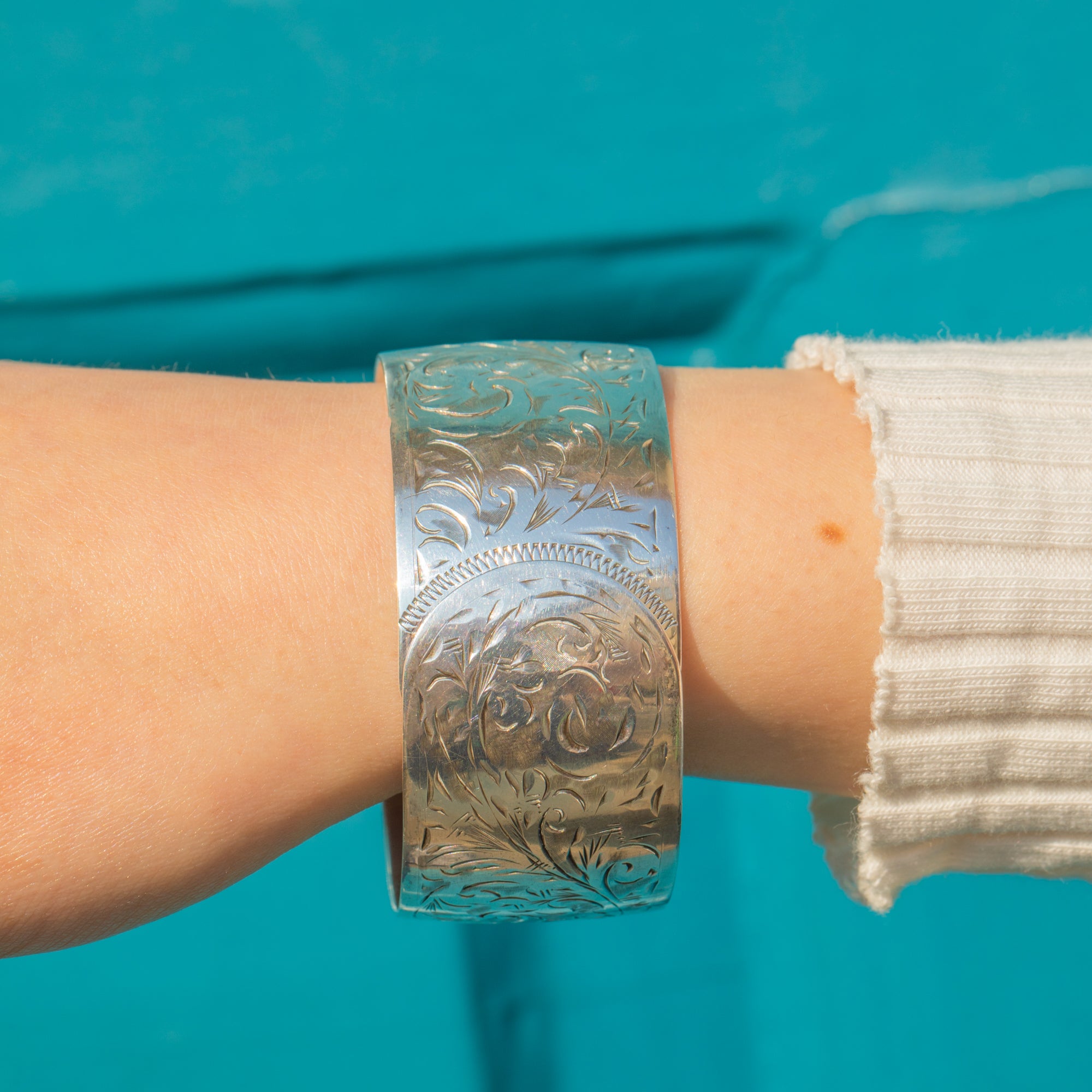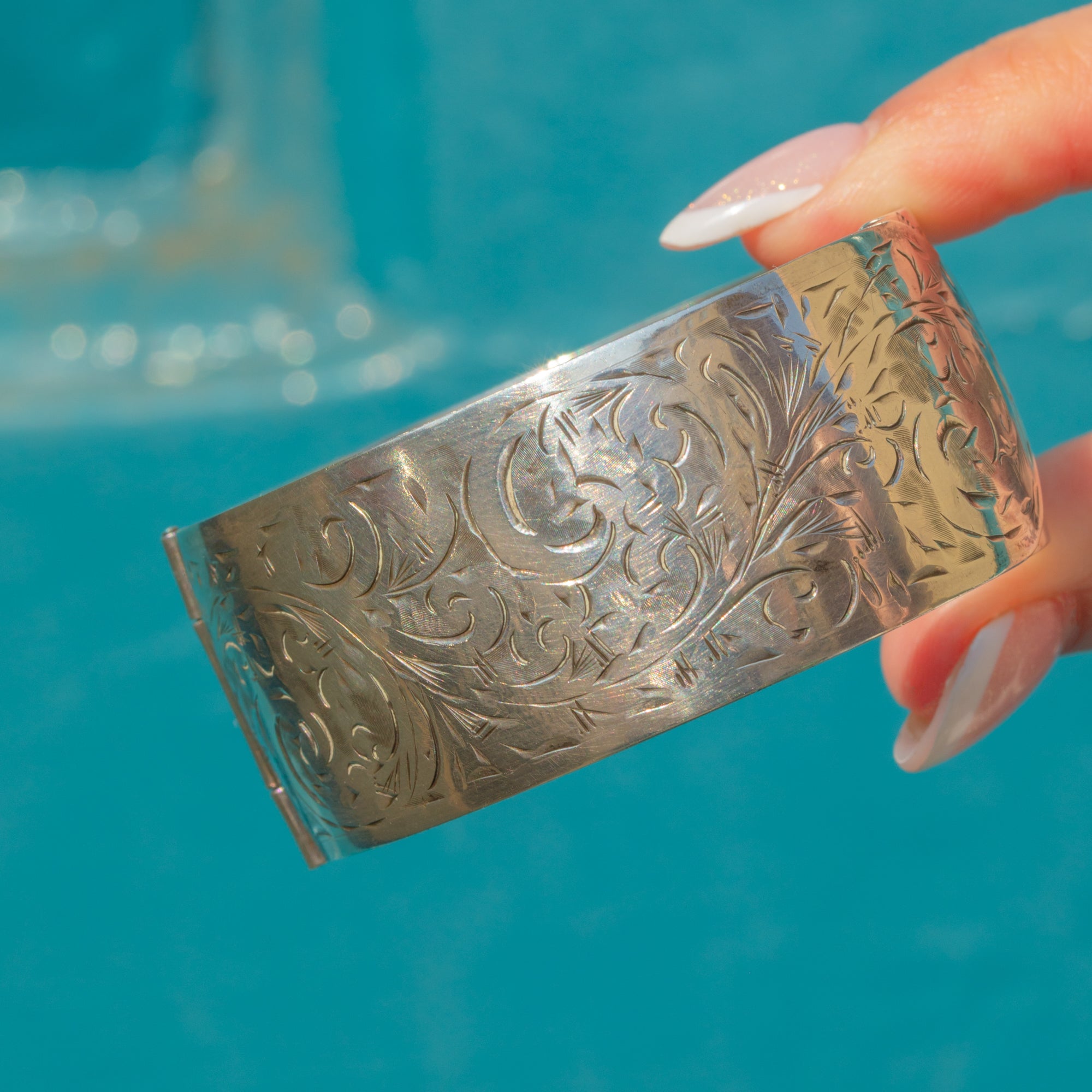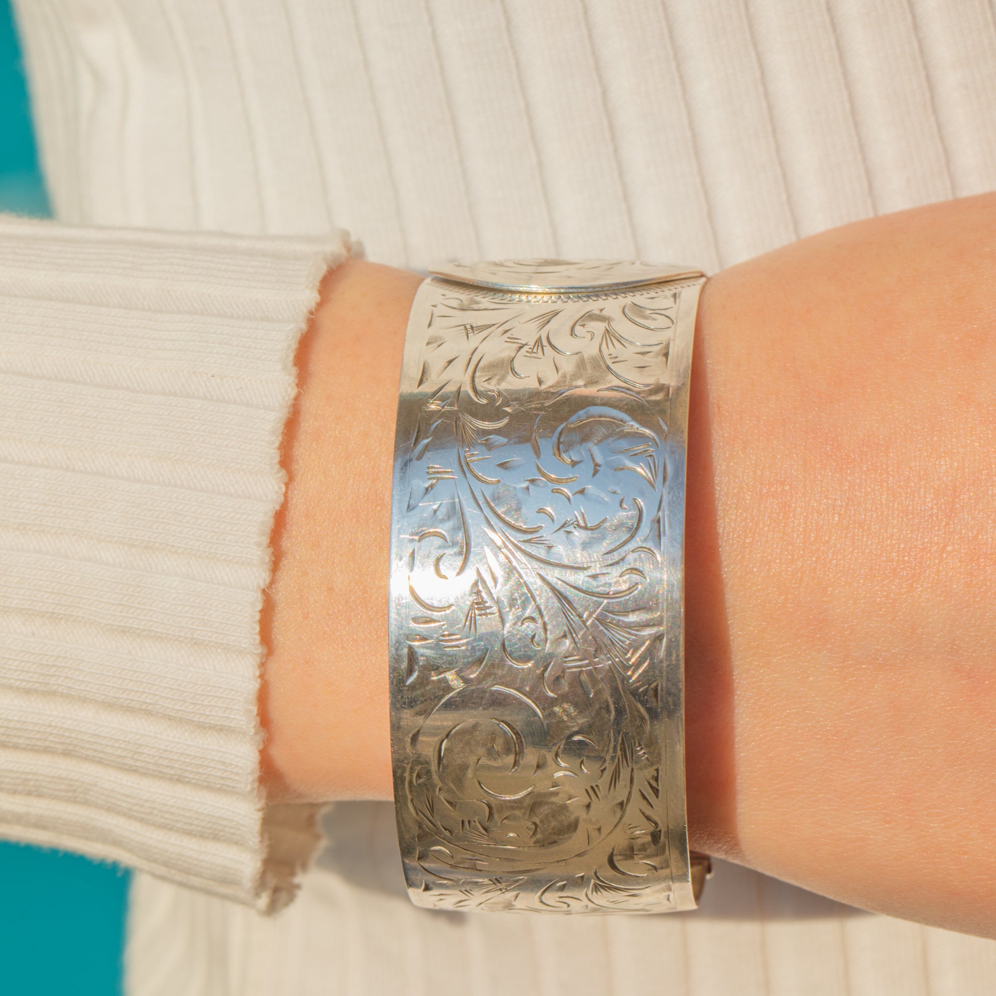 Formed from glossy Sterling Silver, she is adorned with intricate baroque-style engravings, intertwining mesmerising swirls and spirals, providing a lovely texture. This vintage bangle is complete with a unique overlapping clasp, giving her a refined finish.