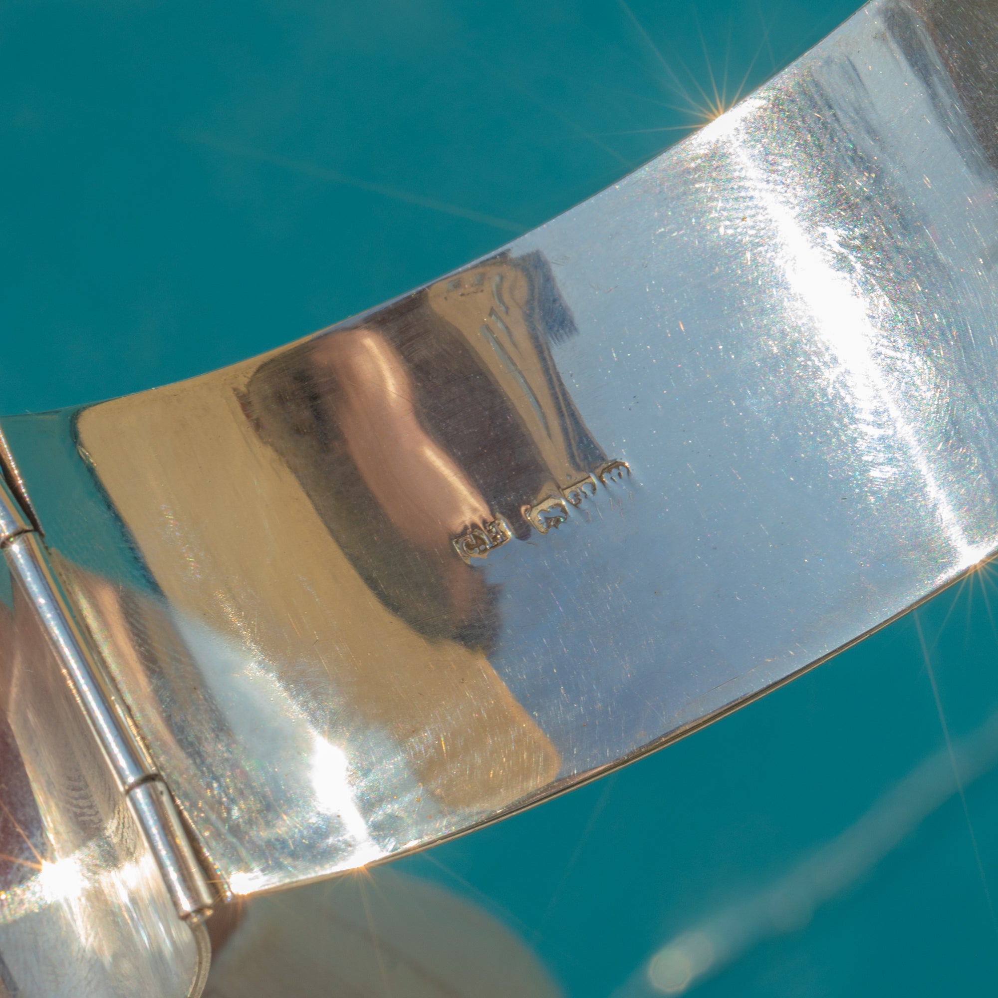 VERY GOOD-EXCELLENT: This rare wrap-around Silver cuff bangle is in lovely condition. Her Silver is glossy with crisp engravings. There are some minor signs of wear on the inside of the bangle, though this can't be seen when wearing. With a secure clasp, she can be worn with confidence!