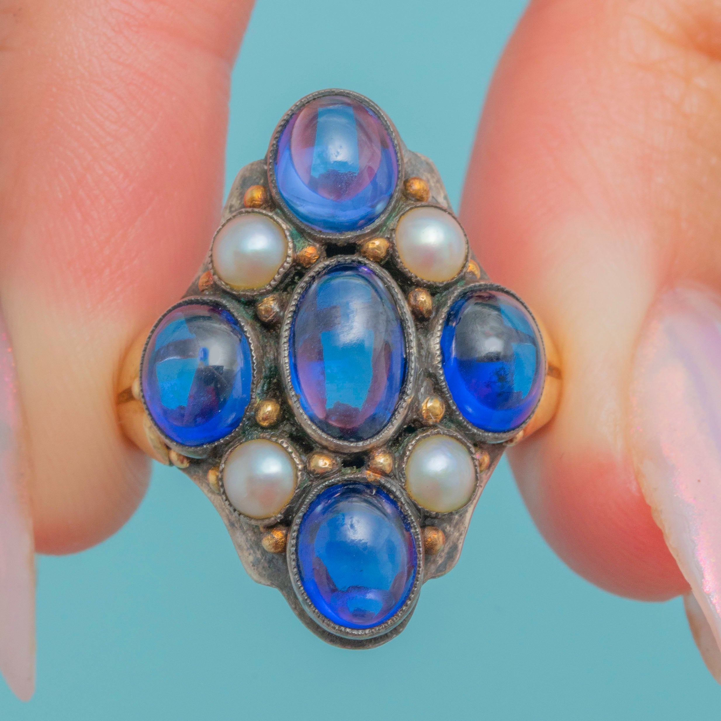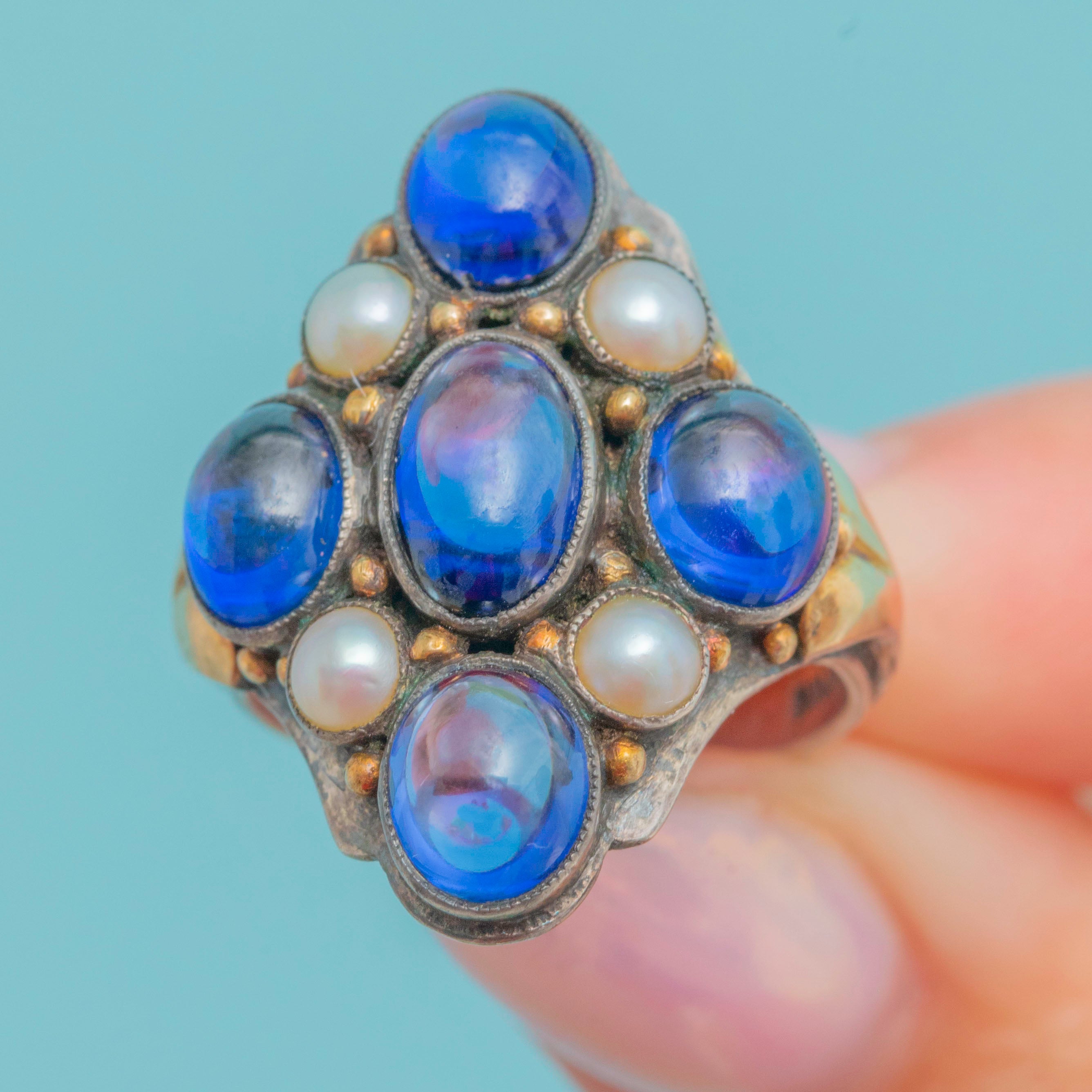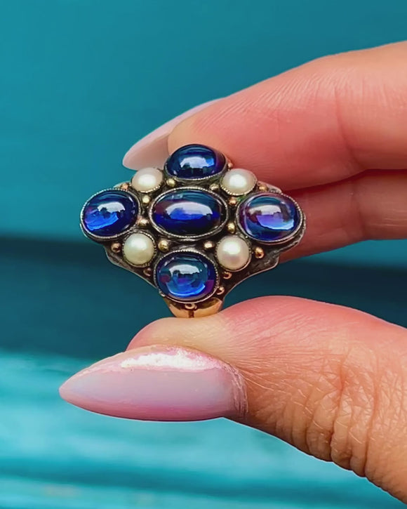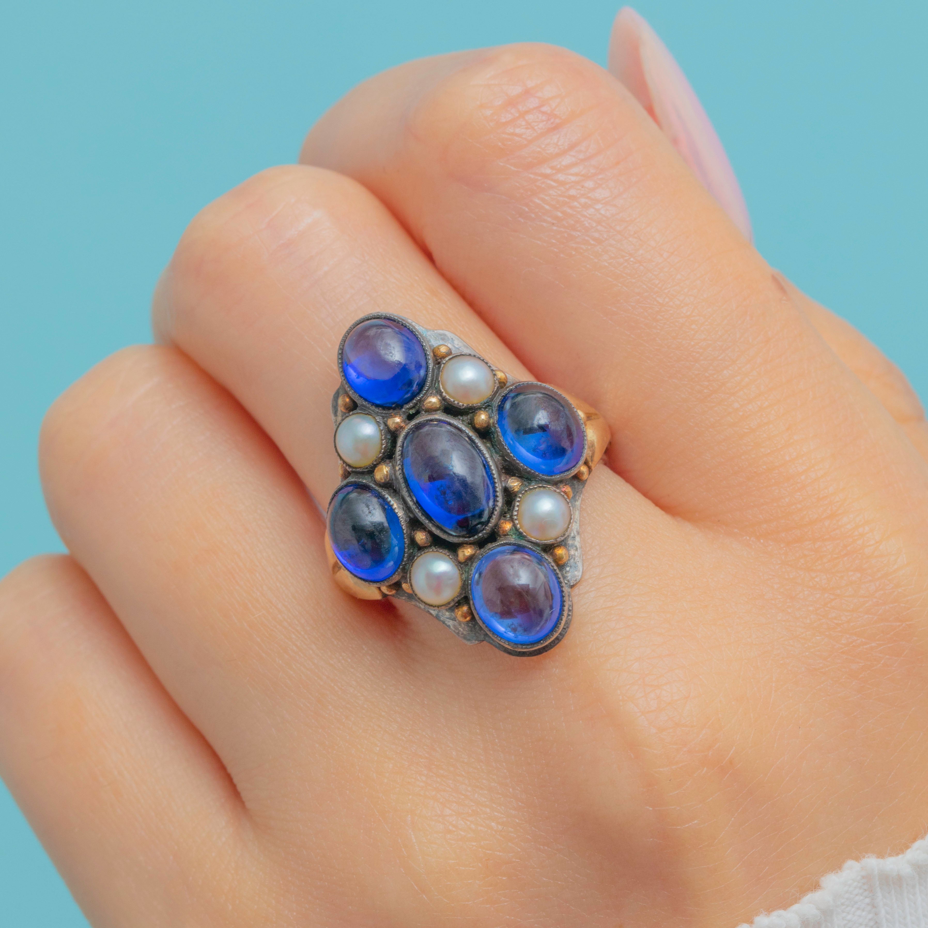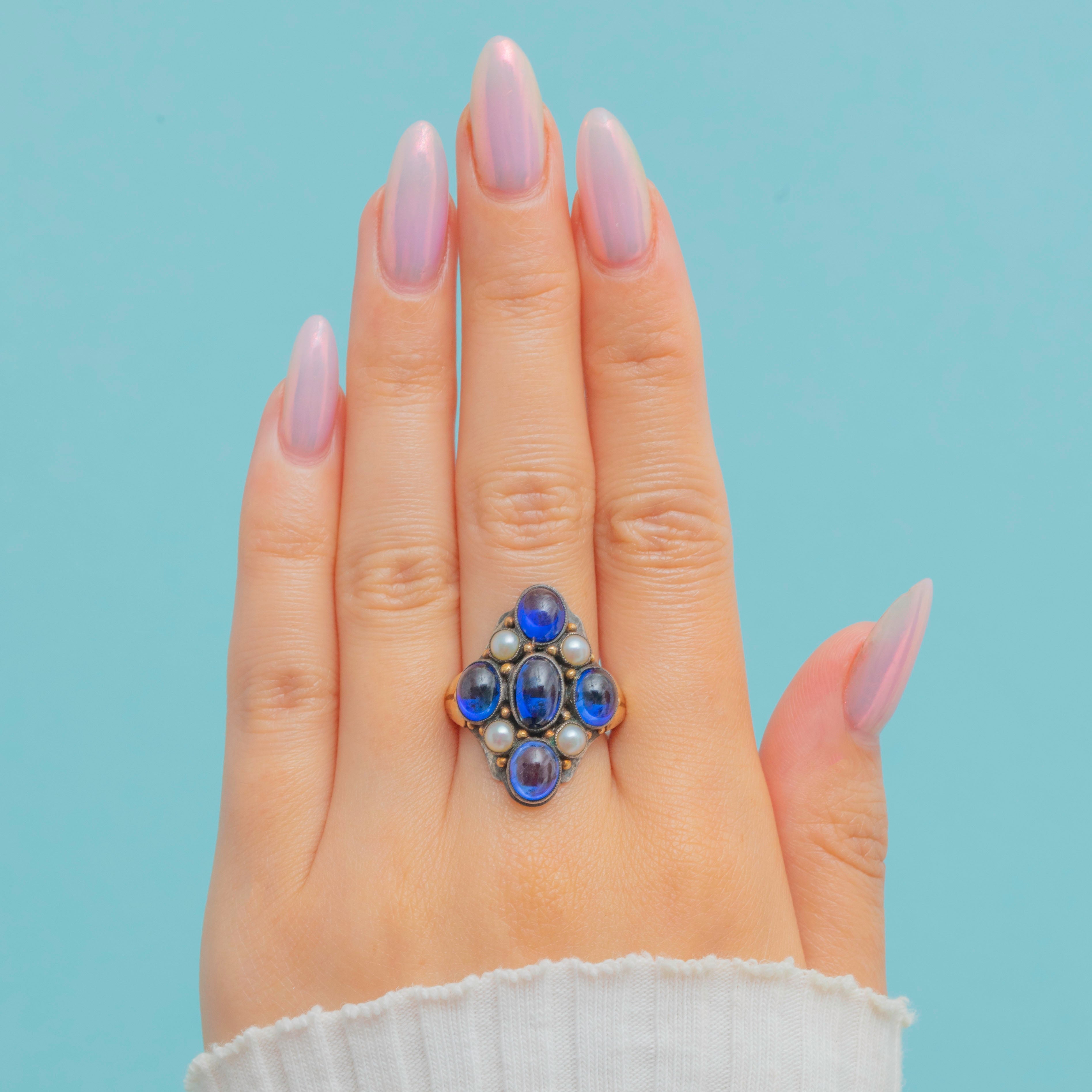Exceptionally crafted by renowned Arts & Crafts jeweller Bernard Instone, this Sapphire Pearl cluster ring will make an outstanding addition to your collection! Bound to make an impact wherever she goes, this antique ring is inlaid with smoothly cut Sapphire cabochons and iridescent Pearls that provide the finger with impressive coverage.