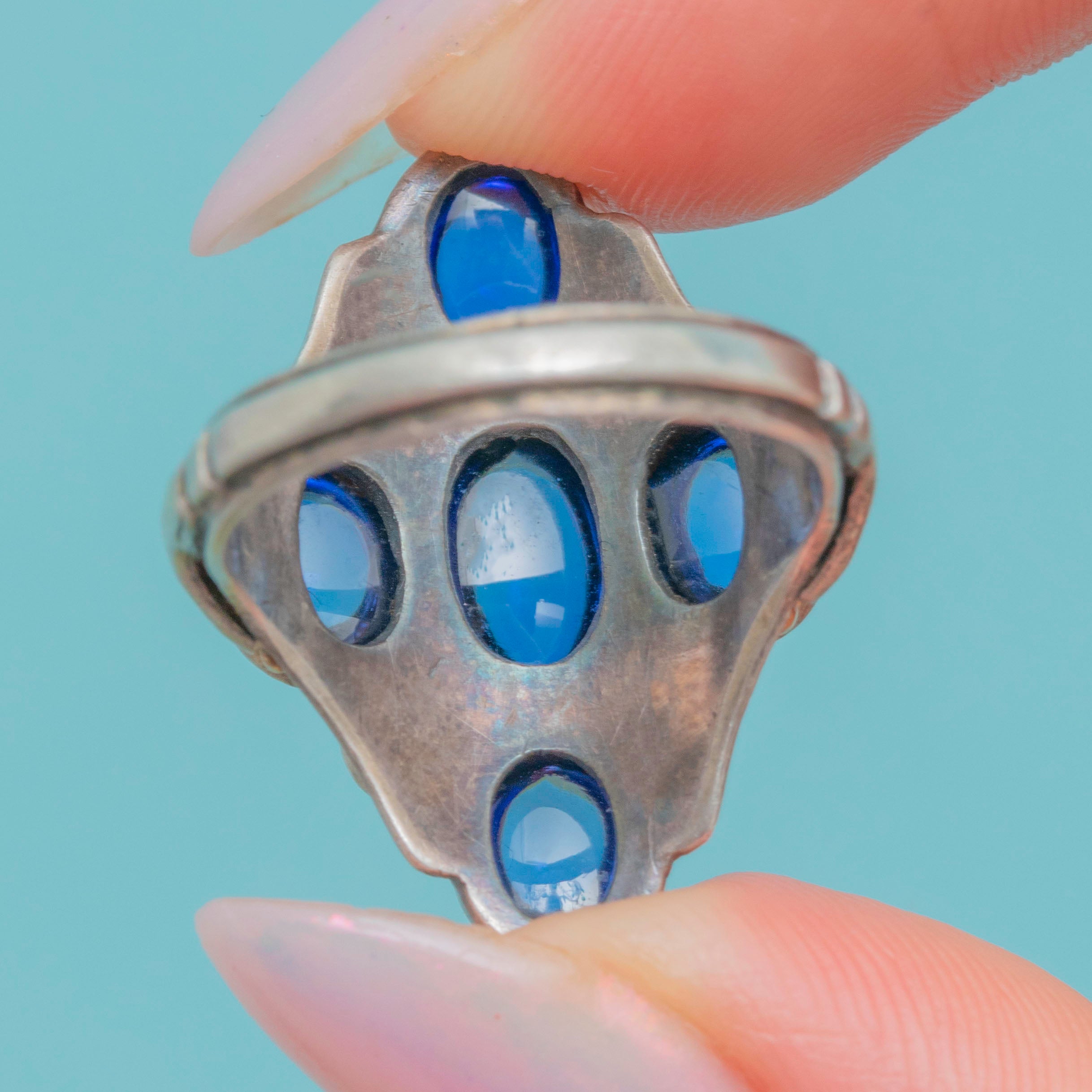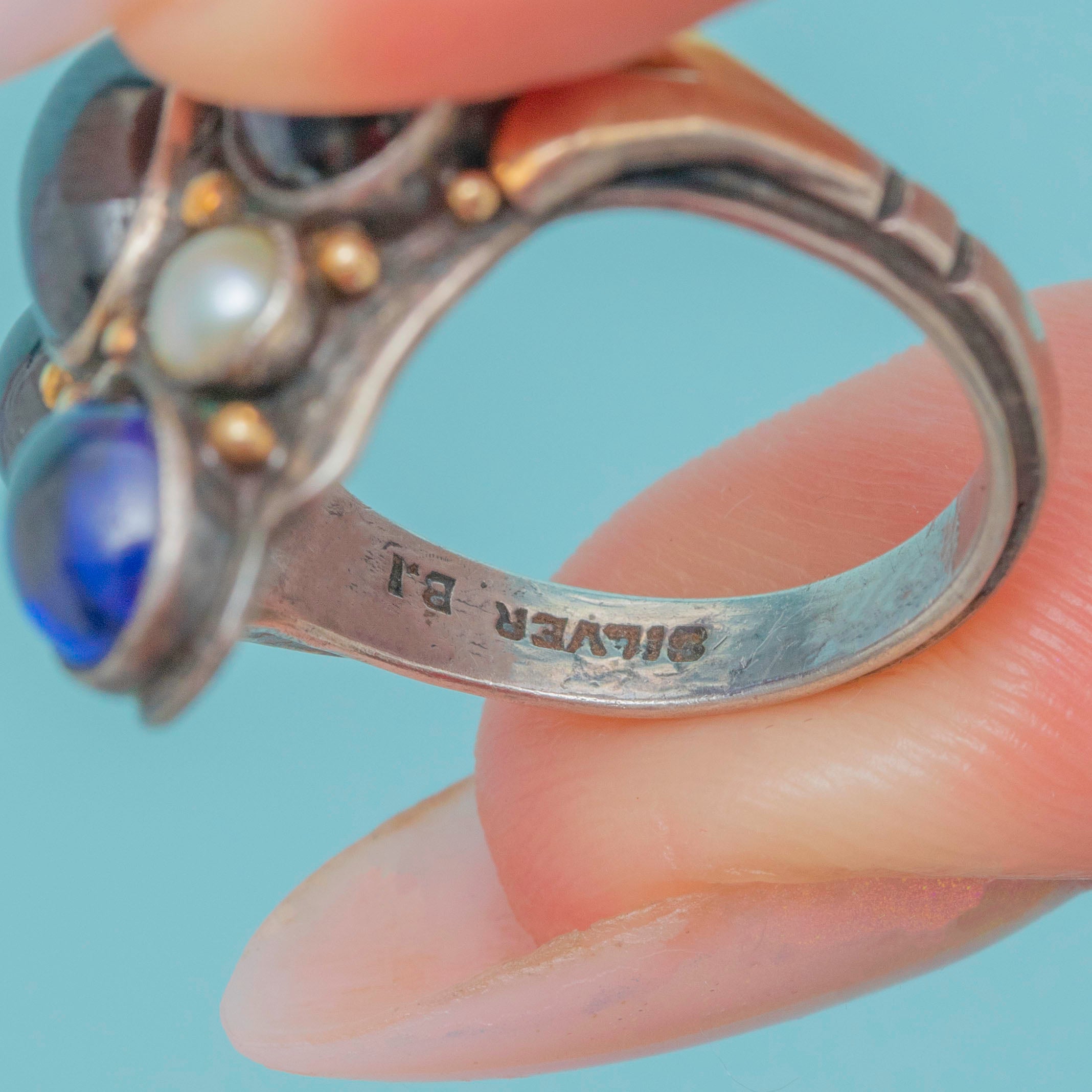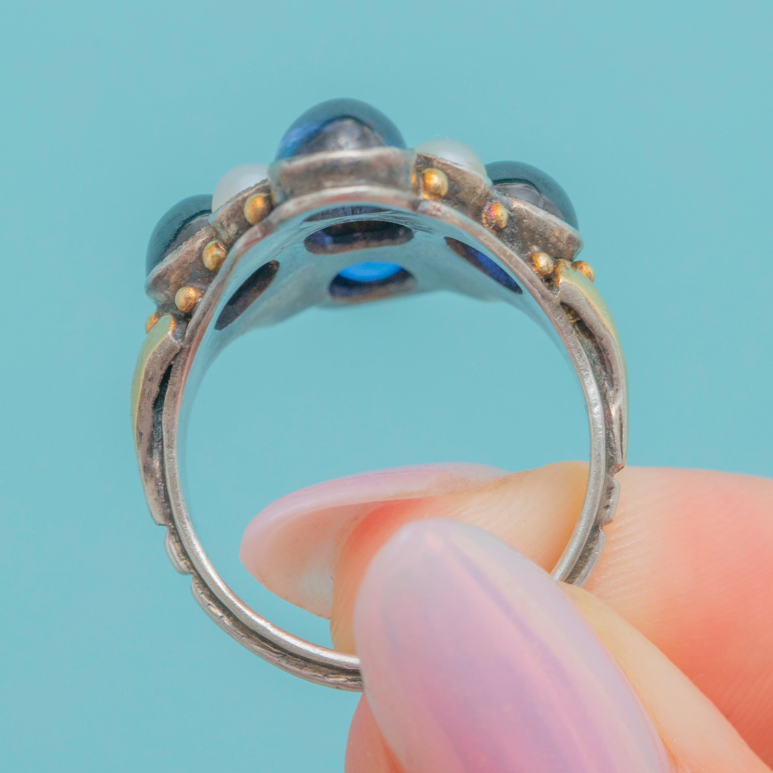 Signed Bernard Instone Arts & Crafts Sapphire Pearl Cluster Ring