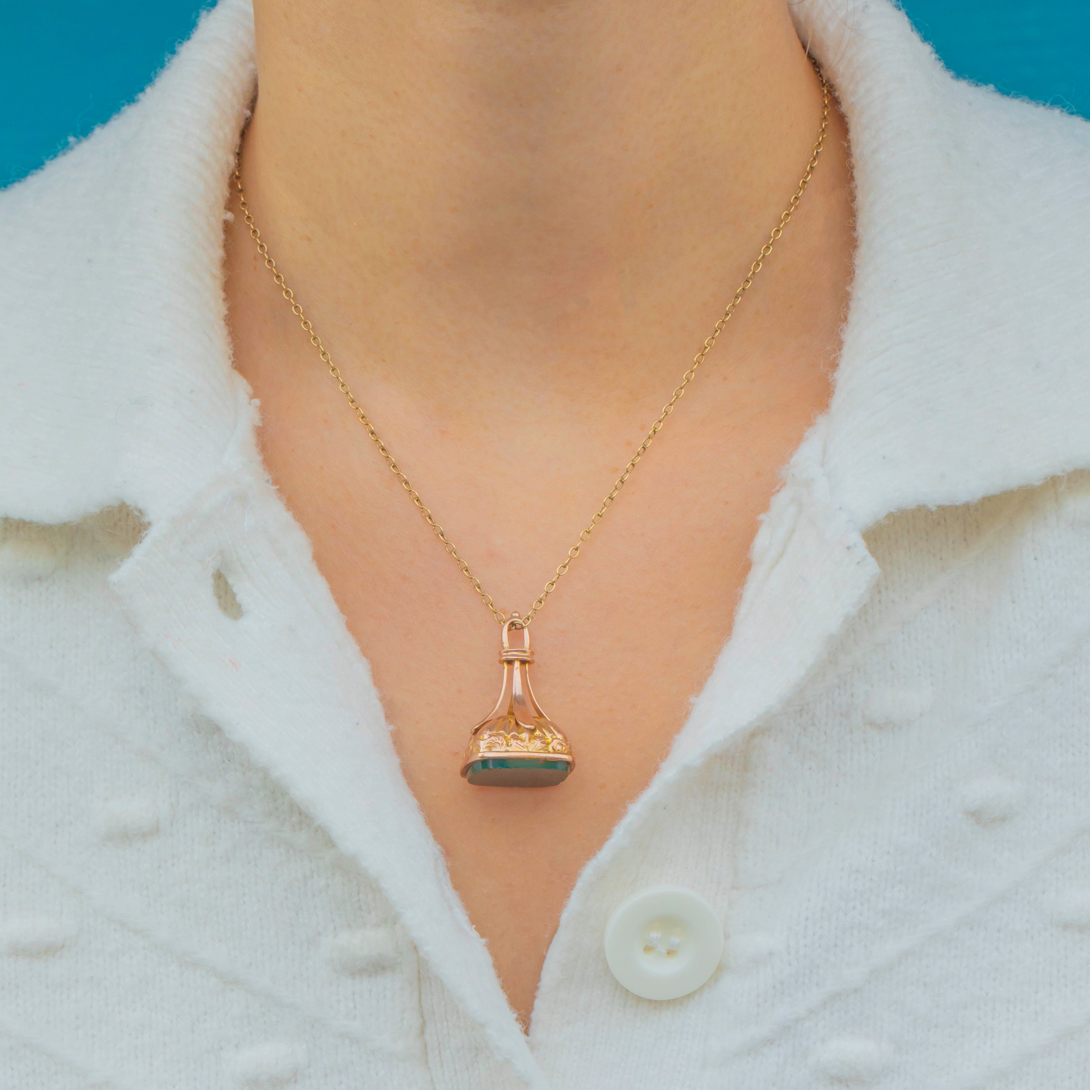 EXCELLENT: This antique 9ct Gold Bloodstone fob is in excellent condition. With clear hallmarks for solid 9ct Gold and assayed in the year 1920, these lovely details have been well preserved for over a hundred years! The Bloodstone is an attractive deep forest green with bright red flecks, with only minor wear to note the the very edges of the stone. It is set securely and the ornate textured Gold is smooth and lustrous with no dings or damage.