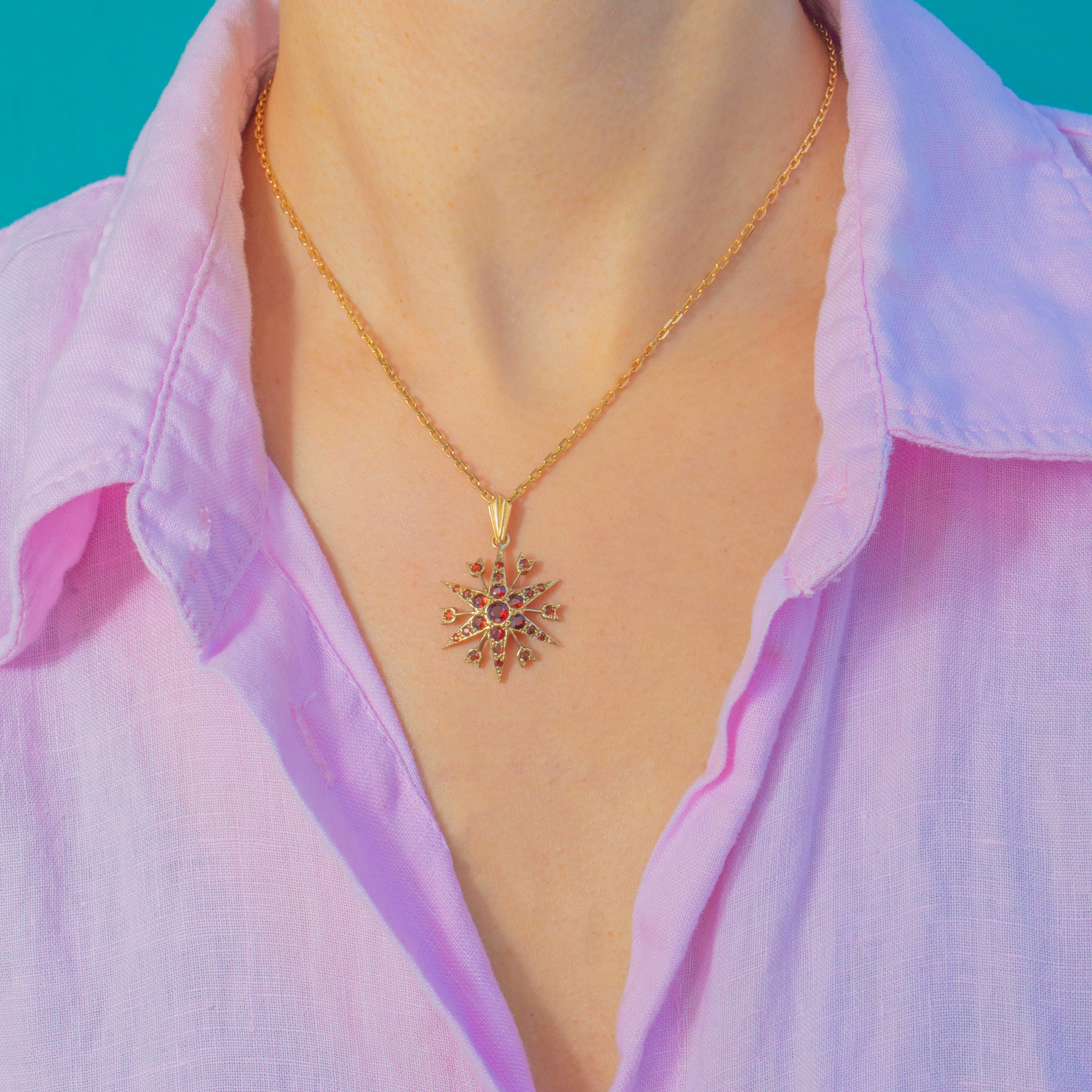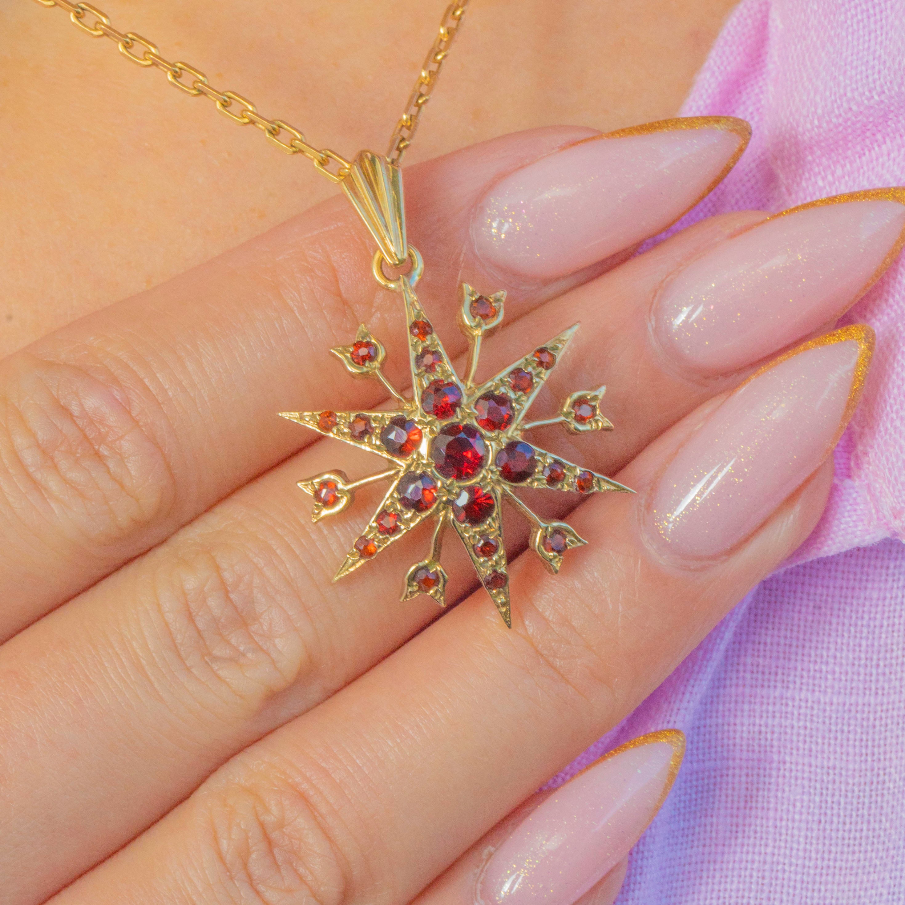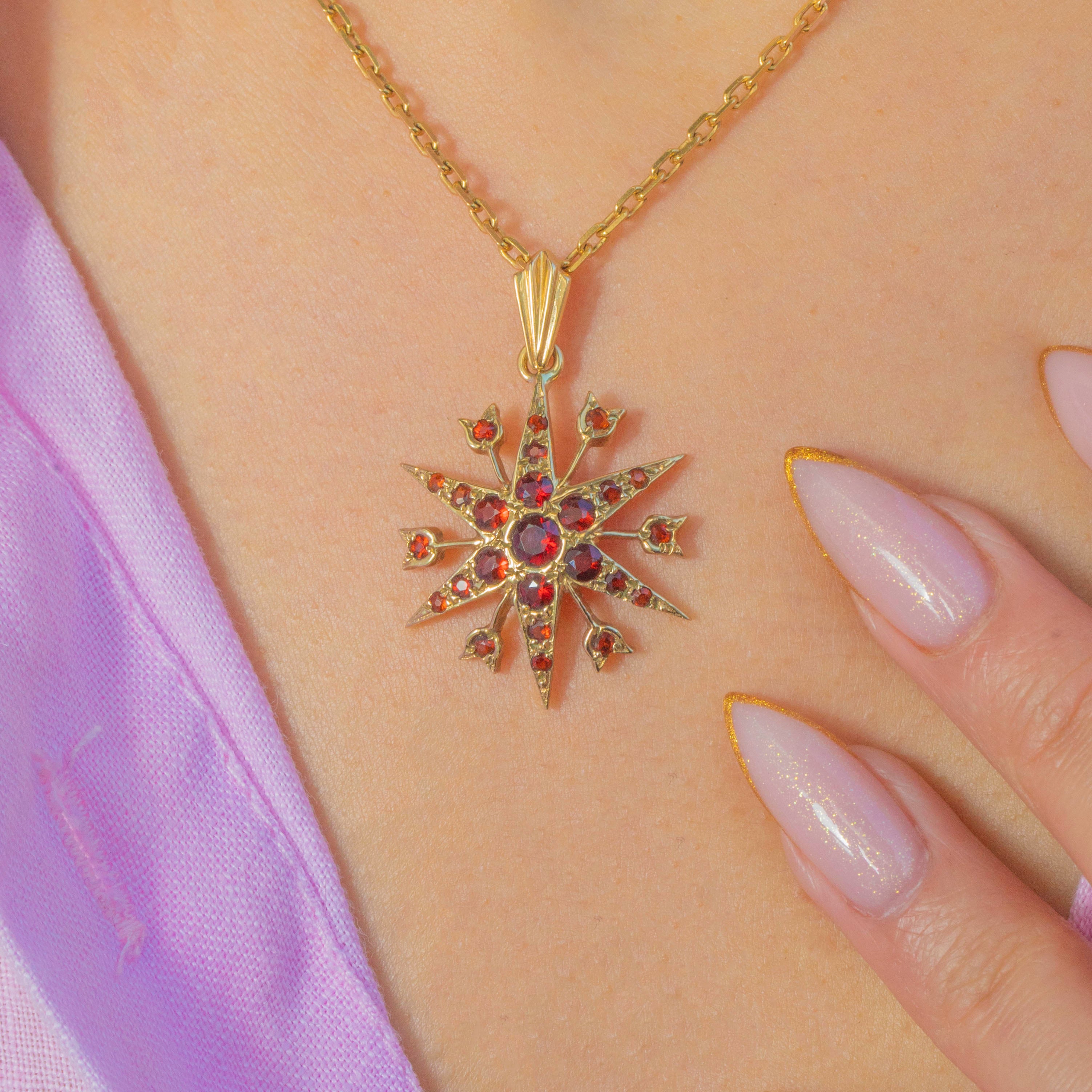 A vibrant Vintage star pendant crafted in solid 9ct Yellow Gold and set with rich, glowing red Garnets. Made in 1982 and fully hallmarked, this dramatic starburst design features layered rays and heart-shaped tips, each adorned with sparkling faceted Garnets that catch the light beautifully.