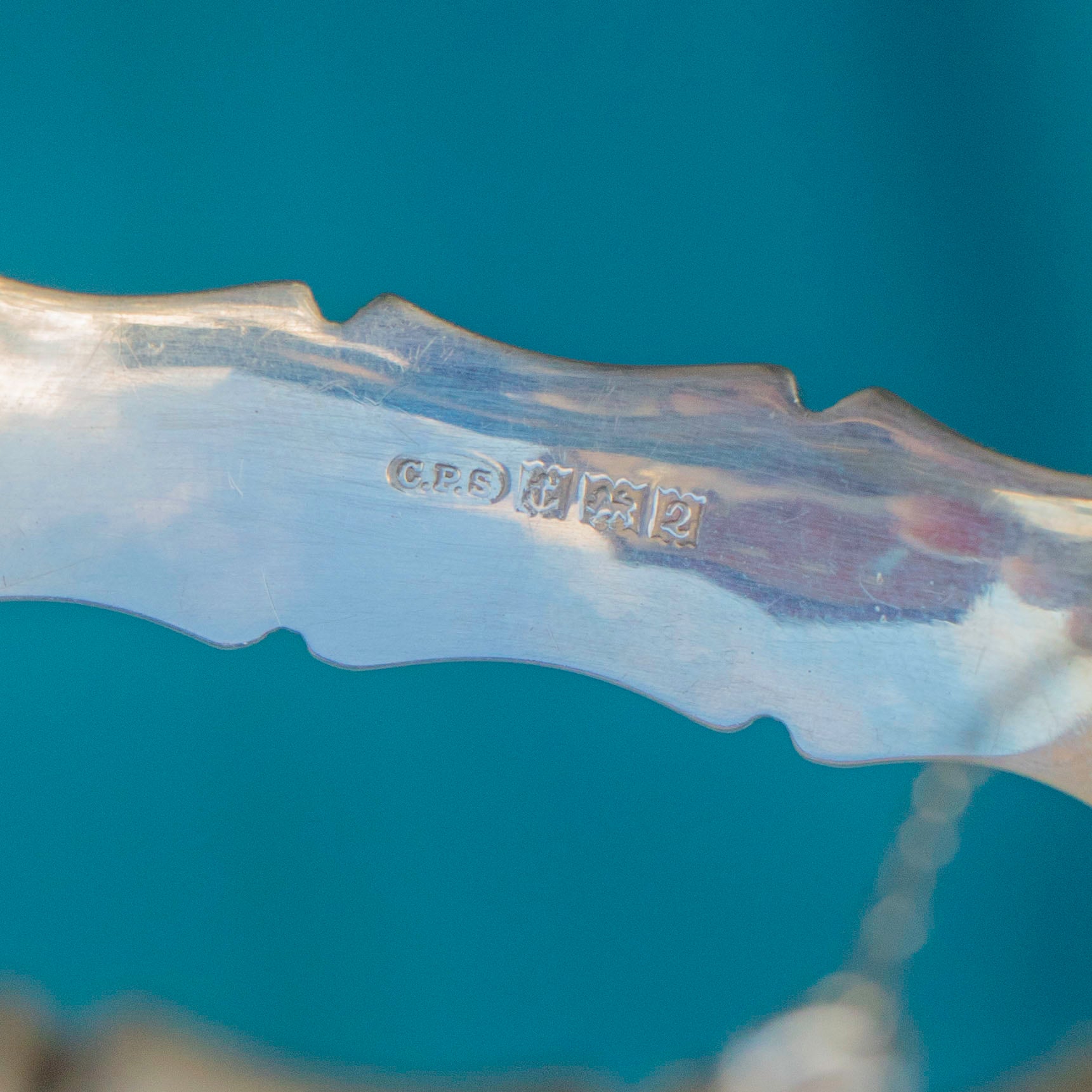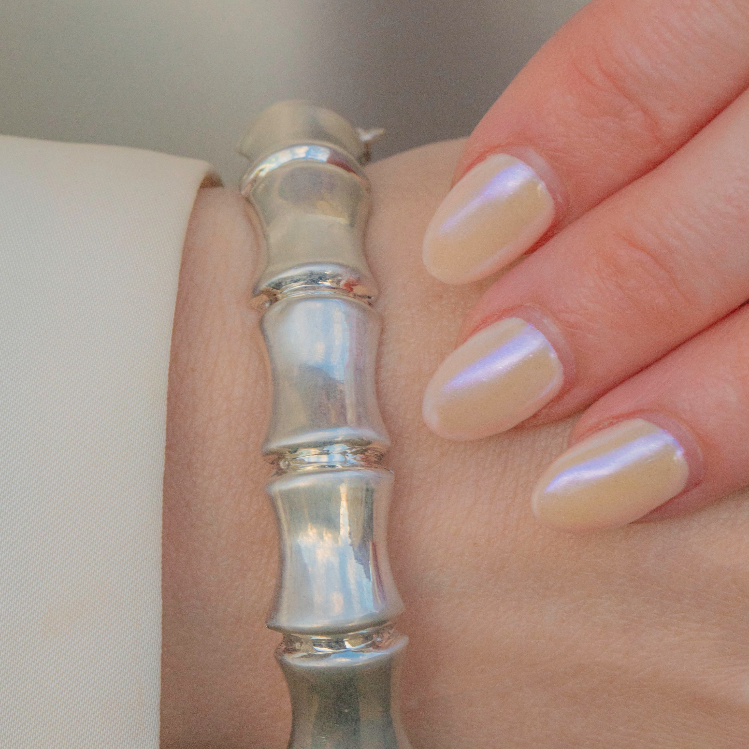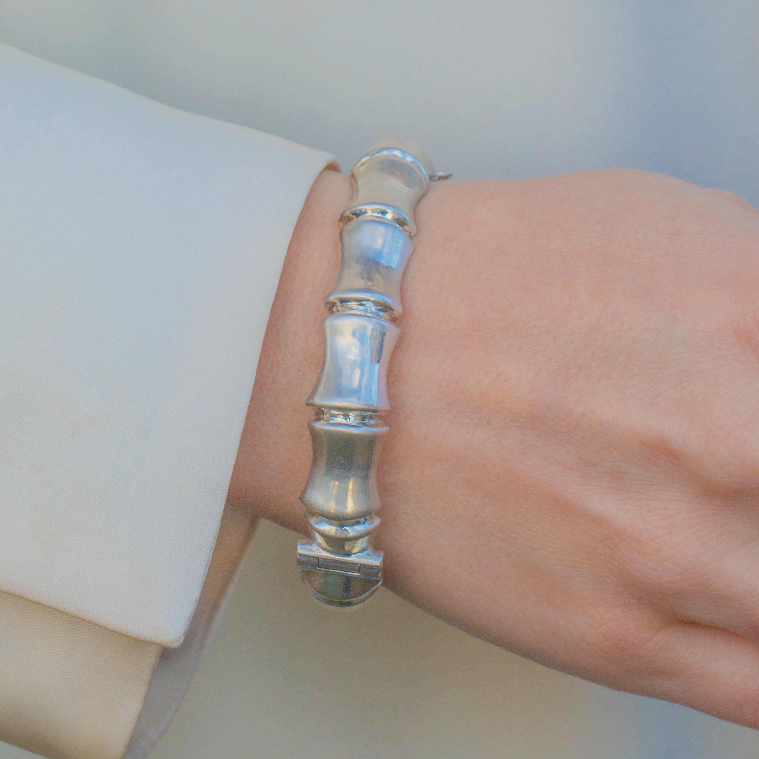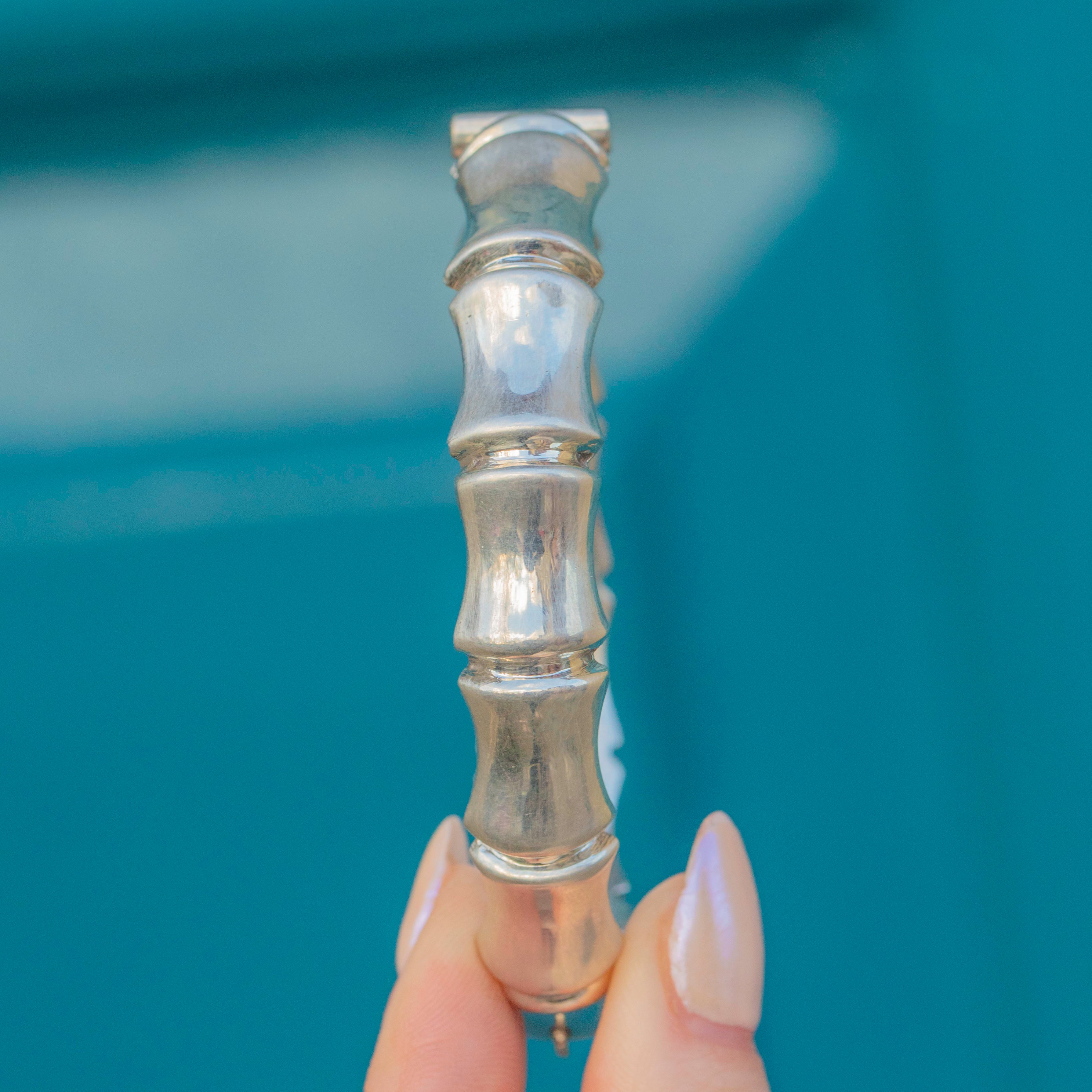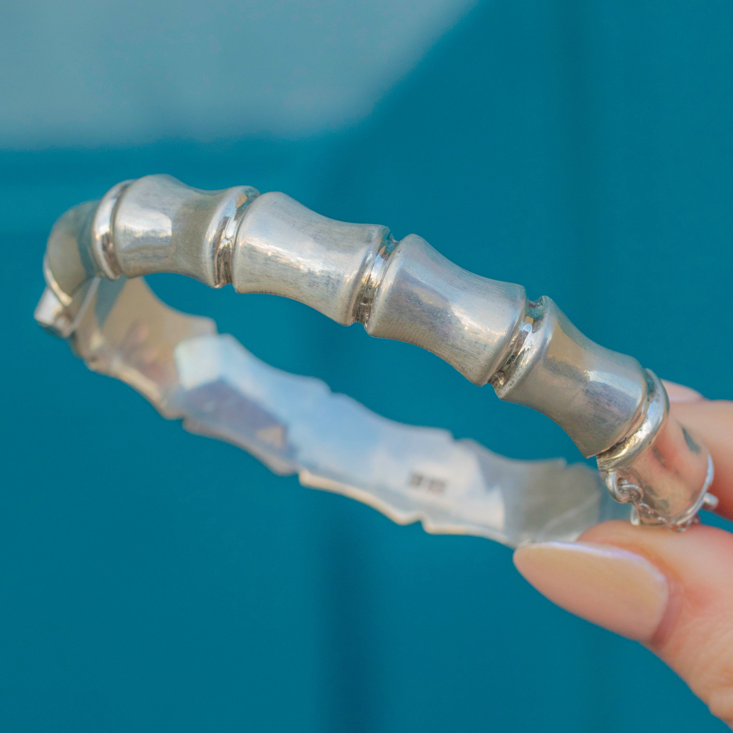 EXCELLENT. This Sterling Silver bamboo bangle is in wonderful condition. Her Silver is bright and lustrous, and she closes securely with a safety chain for extra peace of mind. The hallmarks are crisp and date this piece to 1965. In excellent condition, she is a must-have!