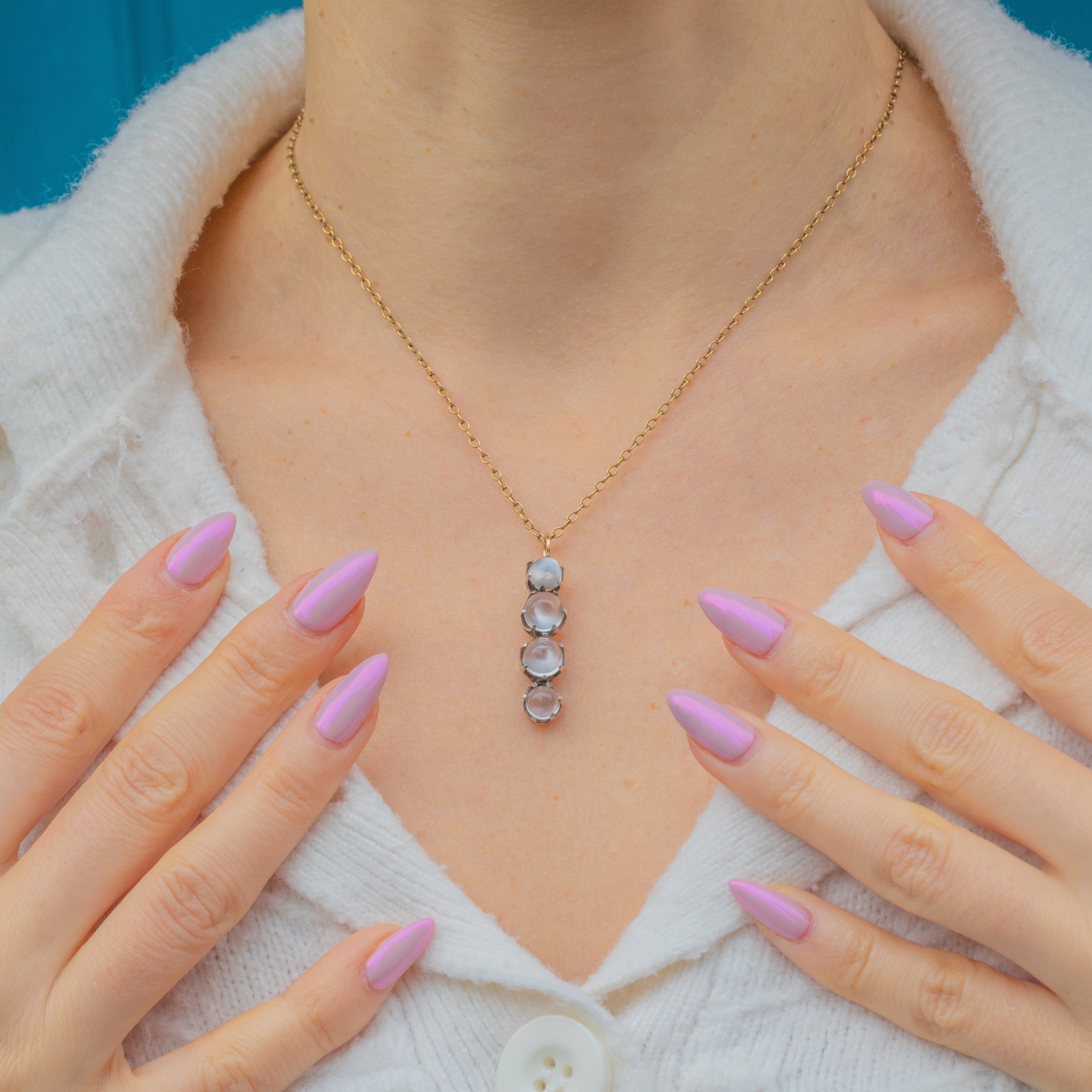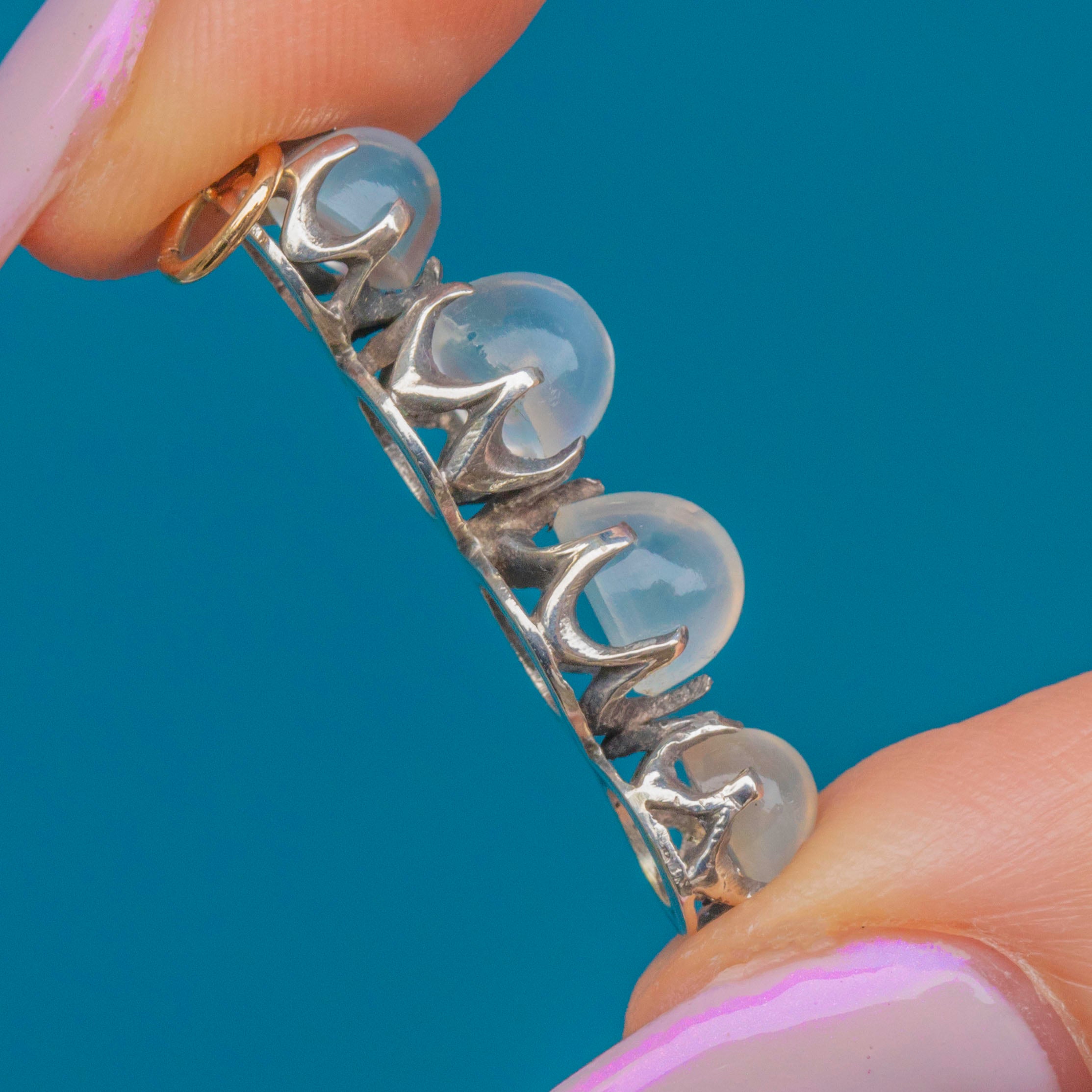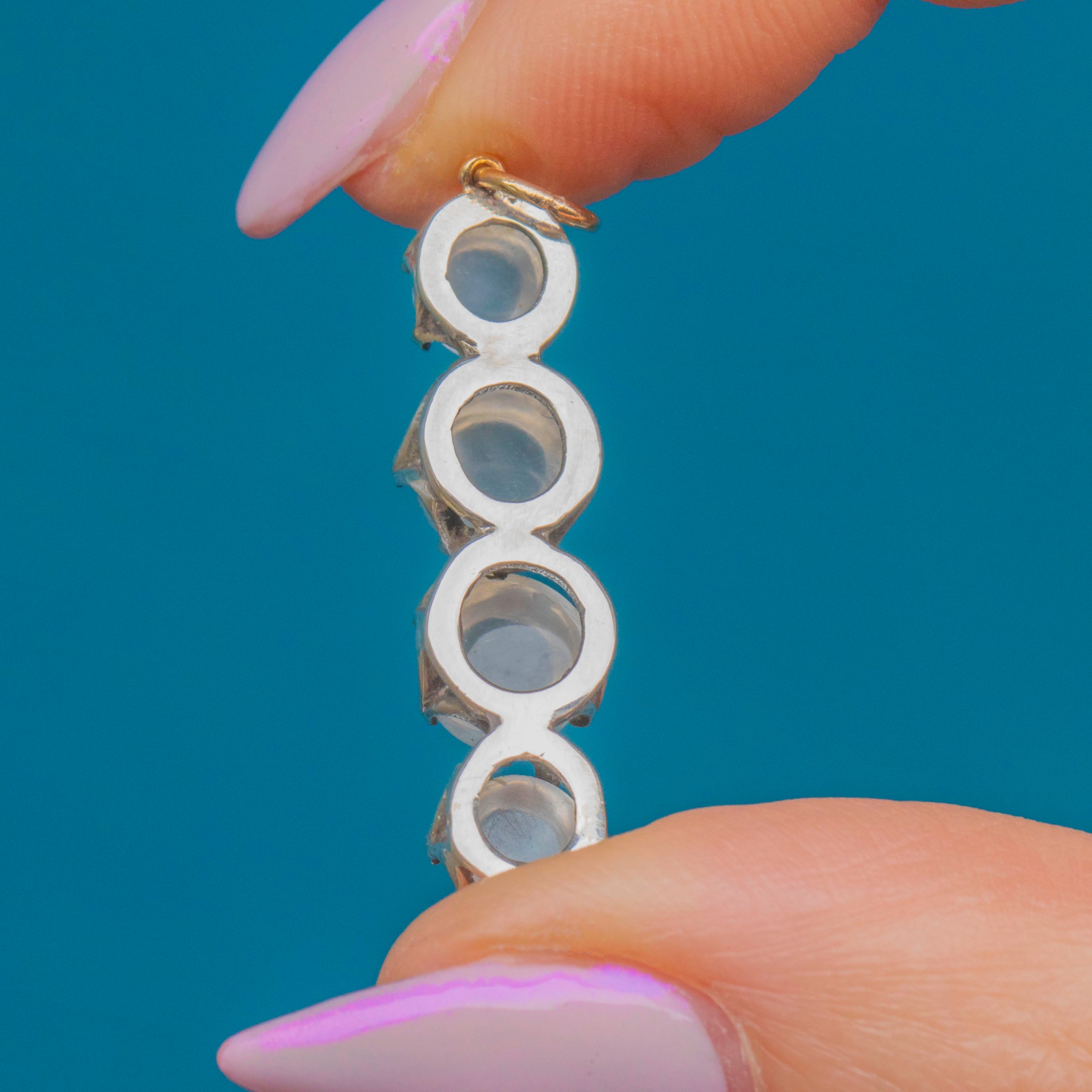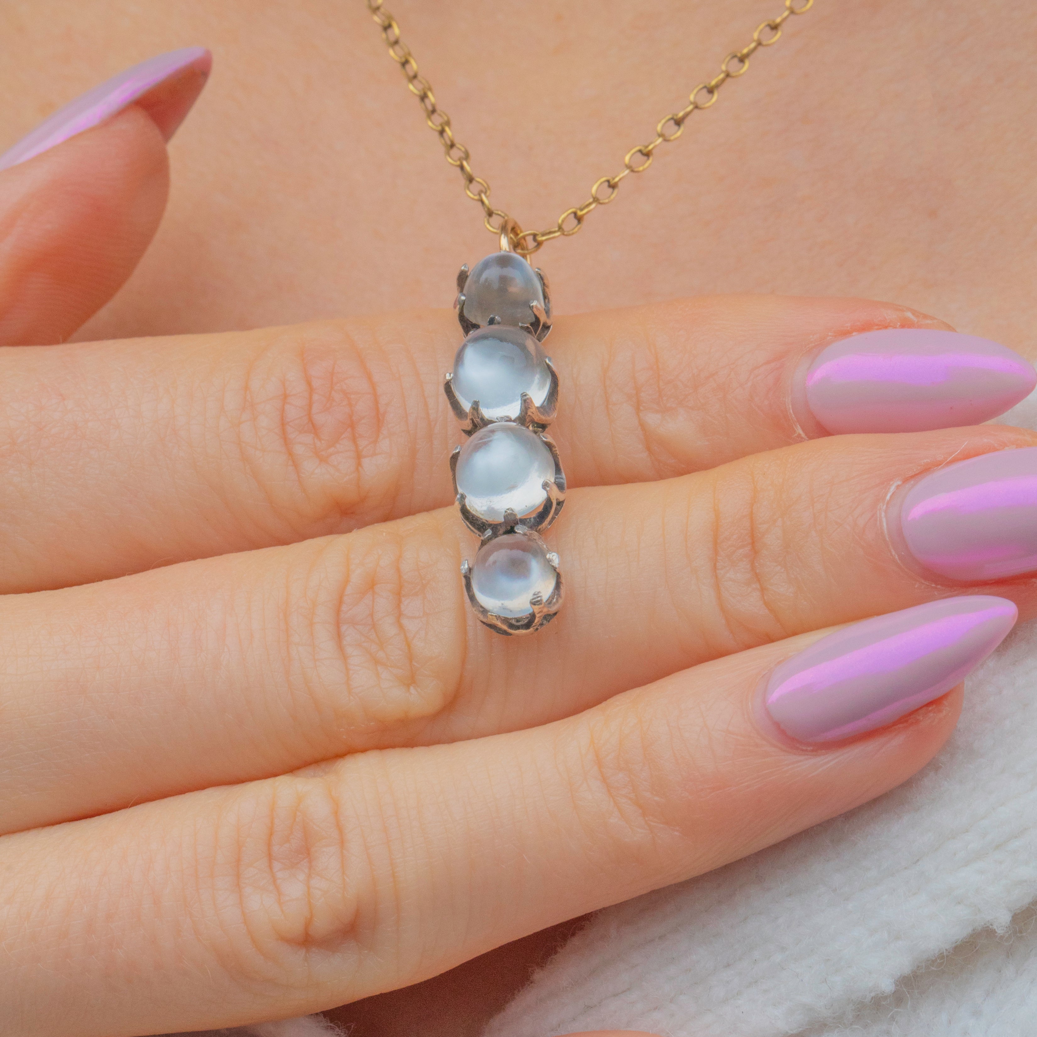 A charming Vintage Sterling Silver pendant set with four luminous Moonstones. Each stone glows with ethereal blue adularescence, shifting with the light for a soft, magical effect. The clean, linear design allows the natural beauty of the Moonstones to take centre stage.