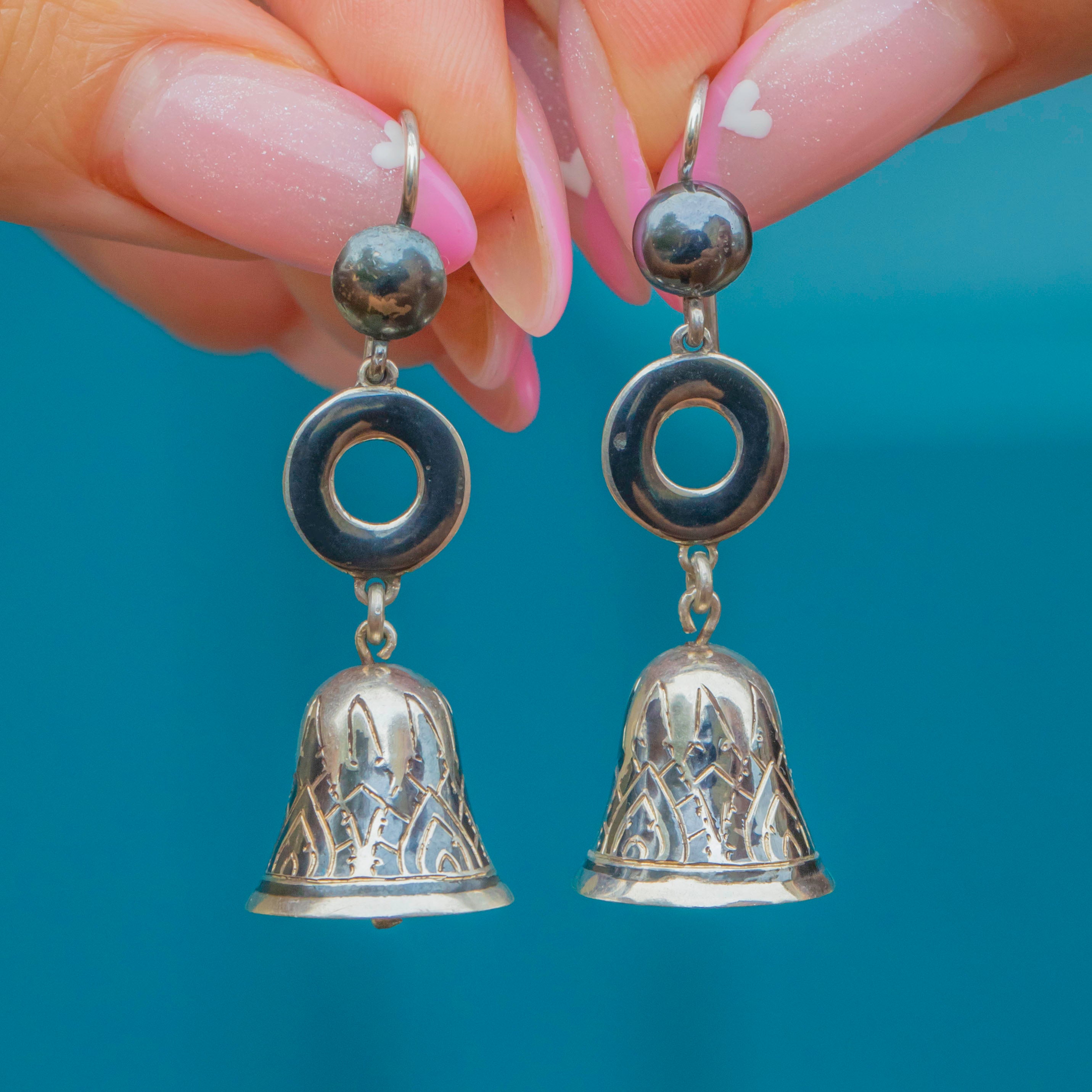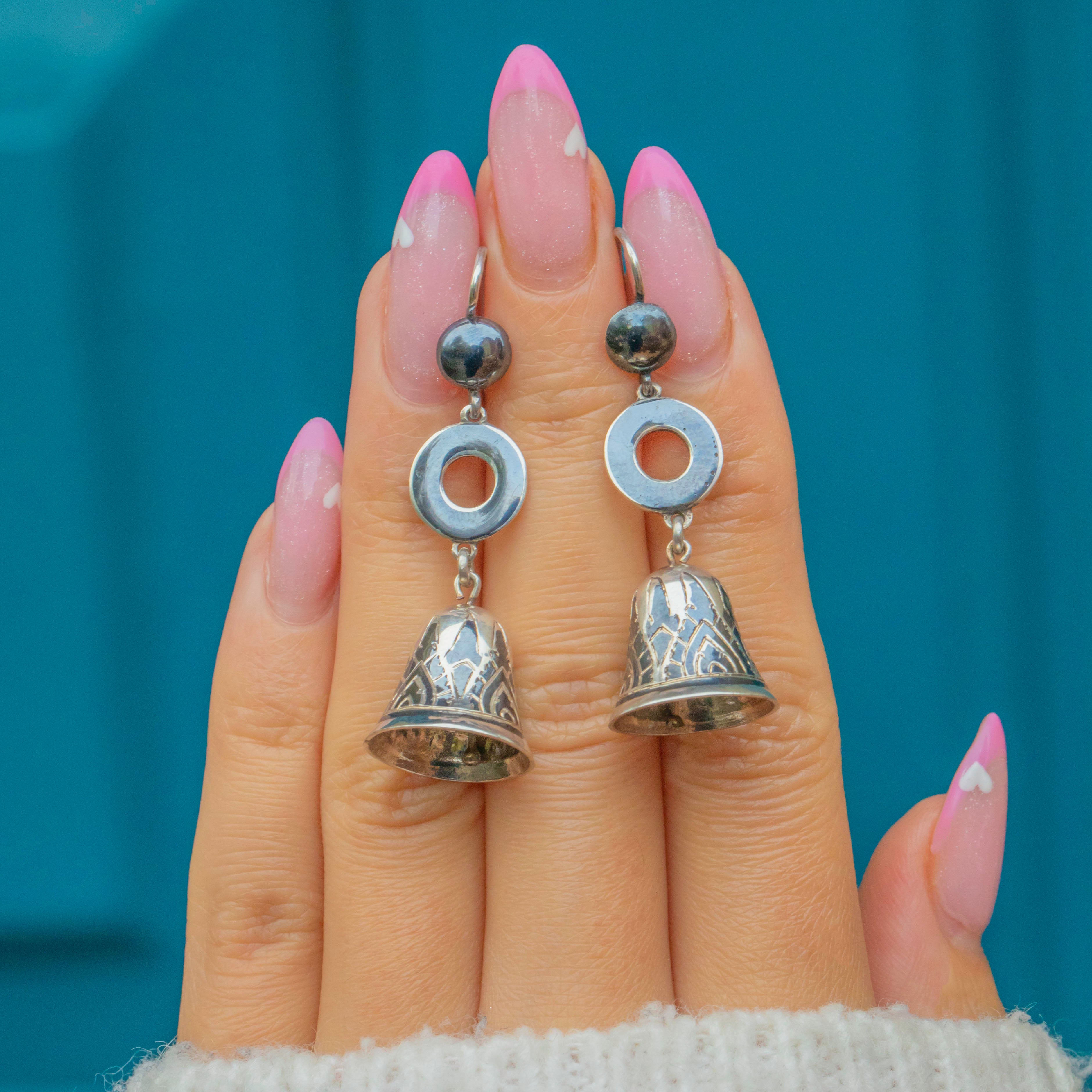 These delightful Victorian earrings are crafted in Sterling Silver with striking black Niello Enamel detailing. Shaped as tiny bells, their intricate Gothic-style engravings and contrasting dark inlay make them a wonderful example of 19th-century Continental artistry.