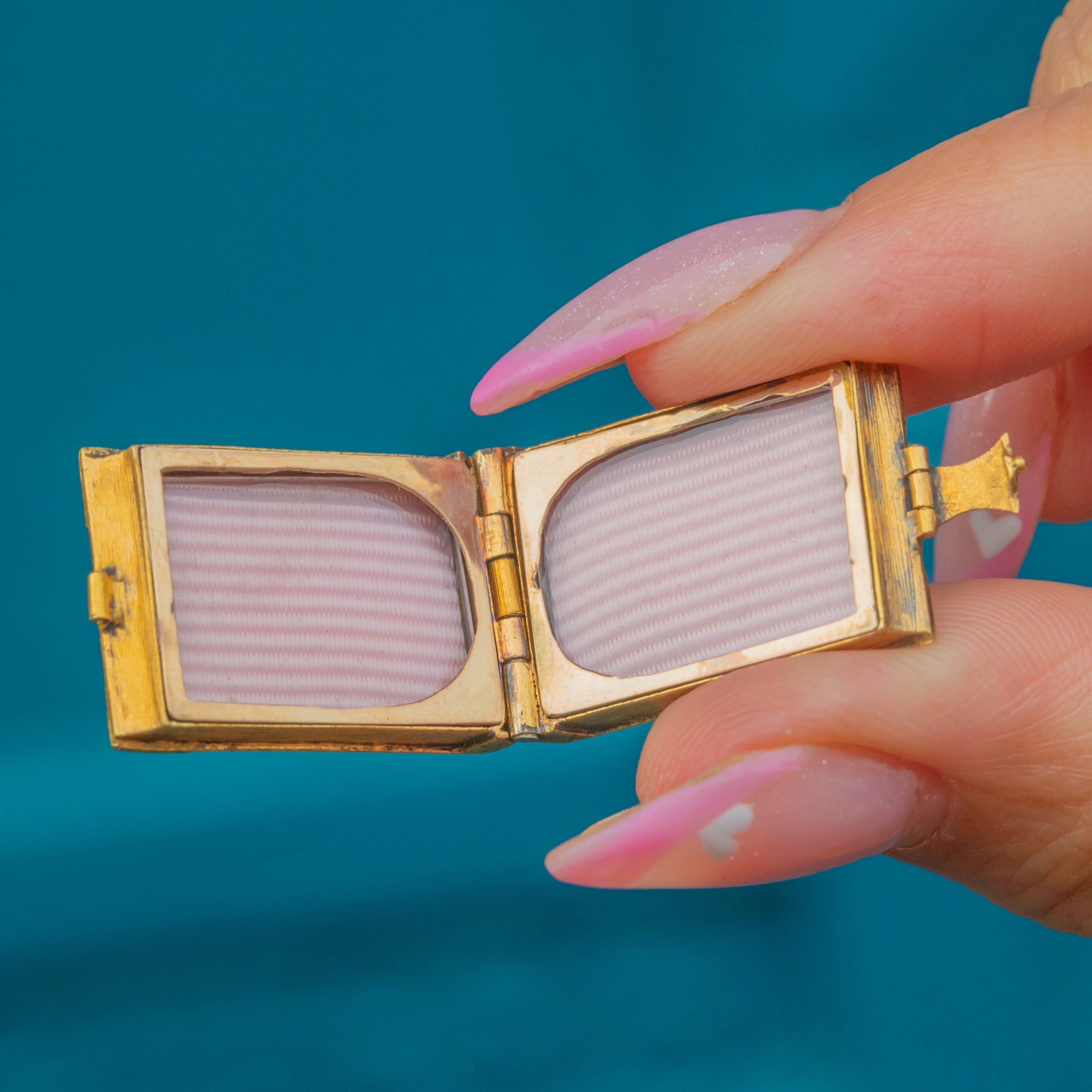 A quirky little locket, she opens up to reveal two frames inside for you to place a couple of precious photographs! With a blank cartouche on her back, you could even personalise her with your own engravings. This delightful antique Gold locket will be the perfect conversation starter.