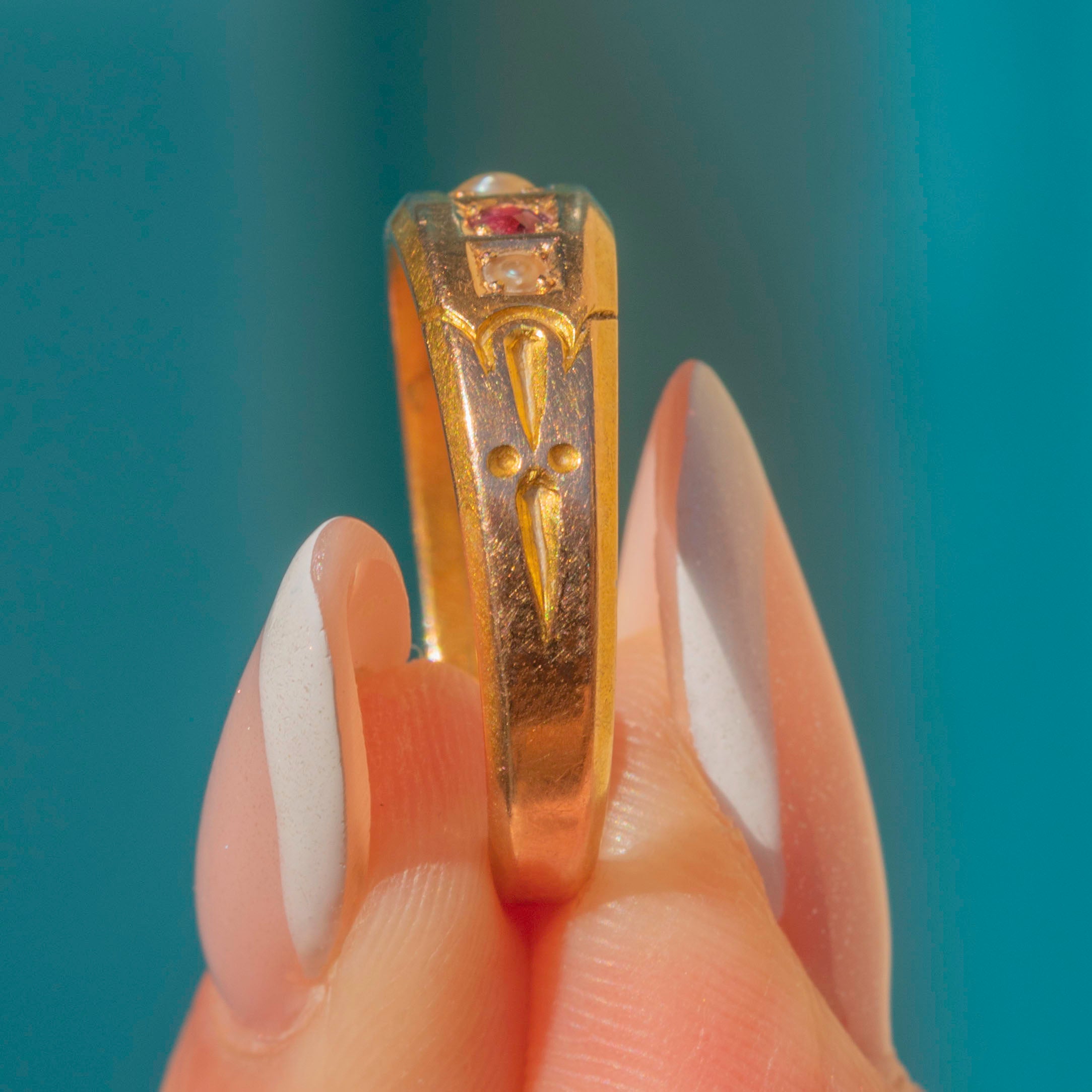 Add a touch of antique charm to your attire with this 15ct Gold Ruby Pearl gypsy ring!