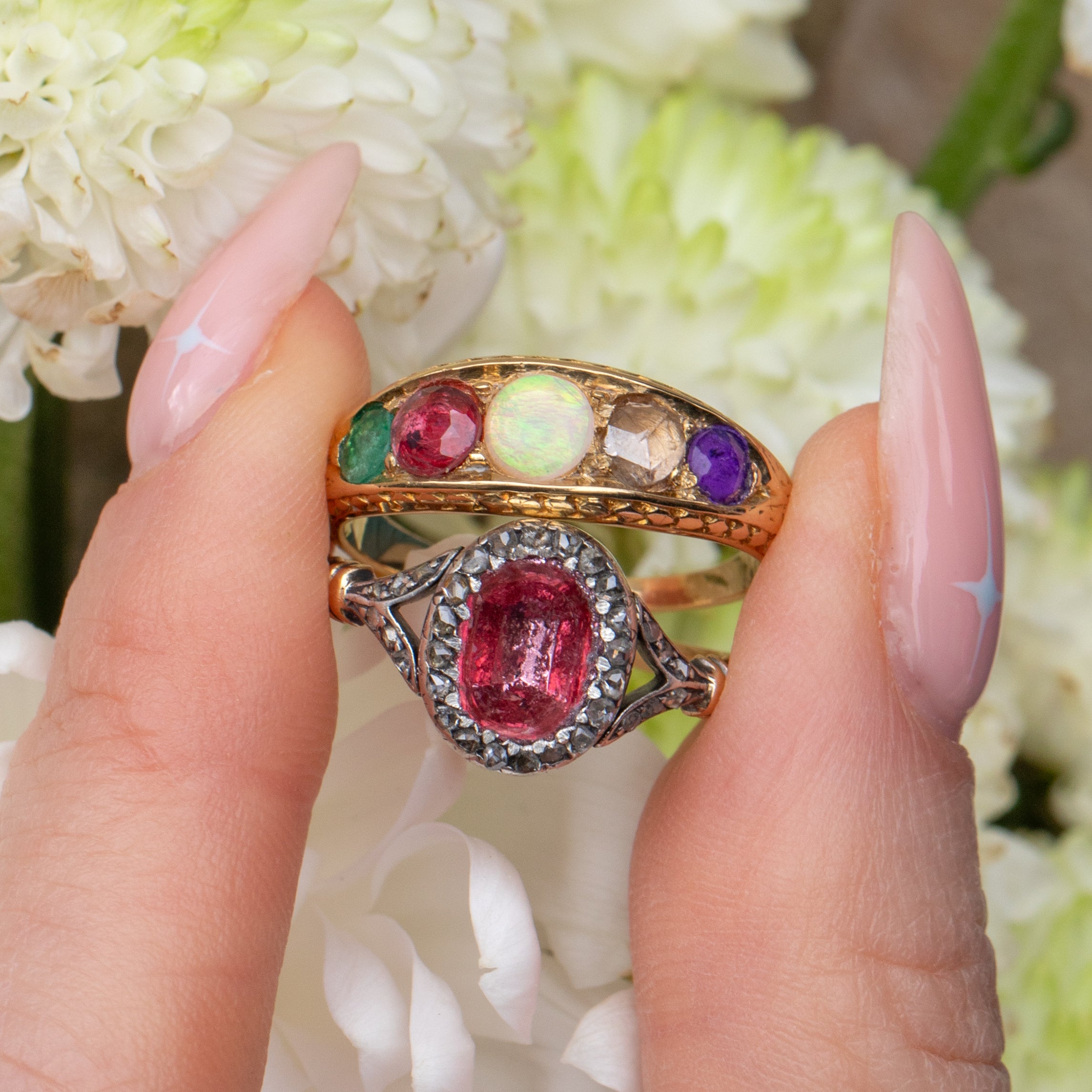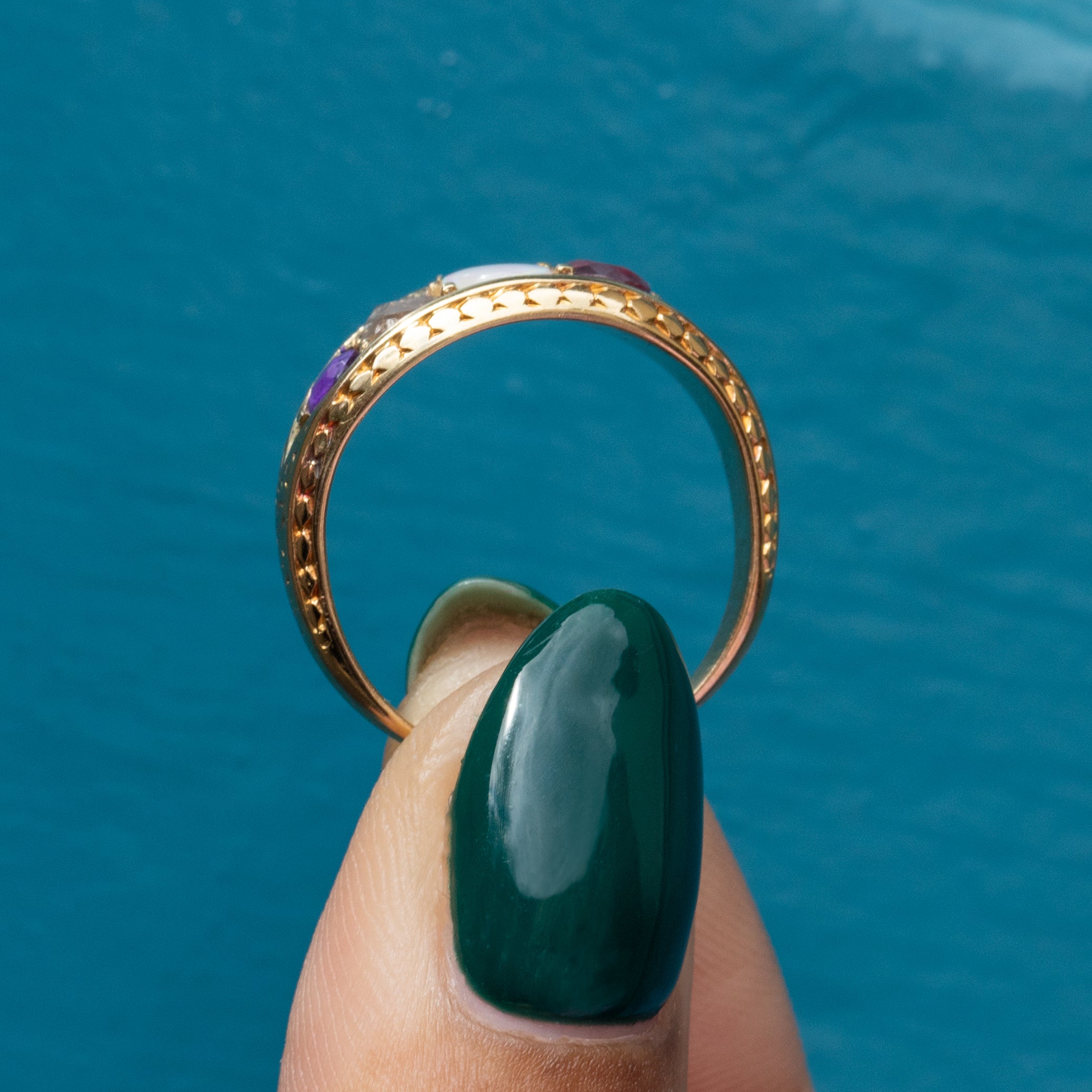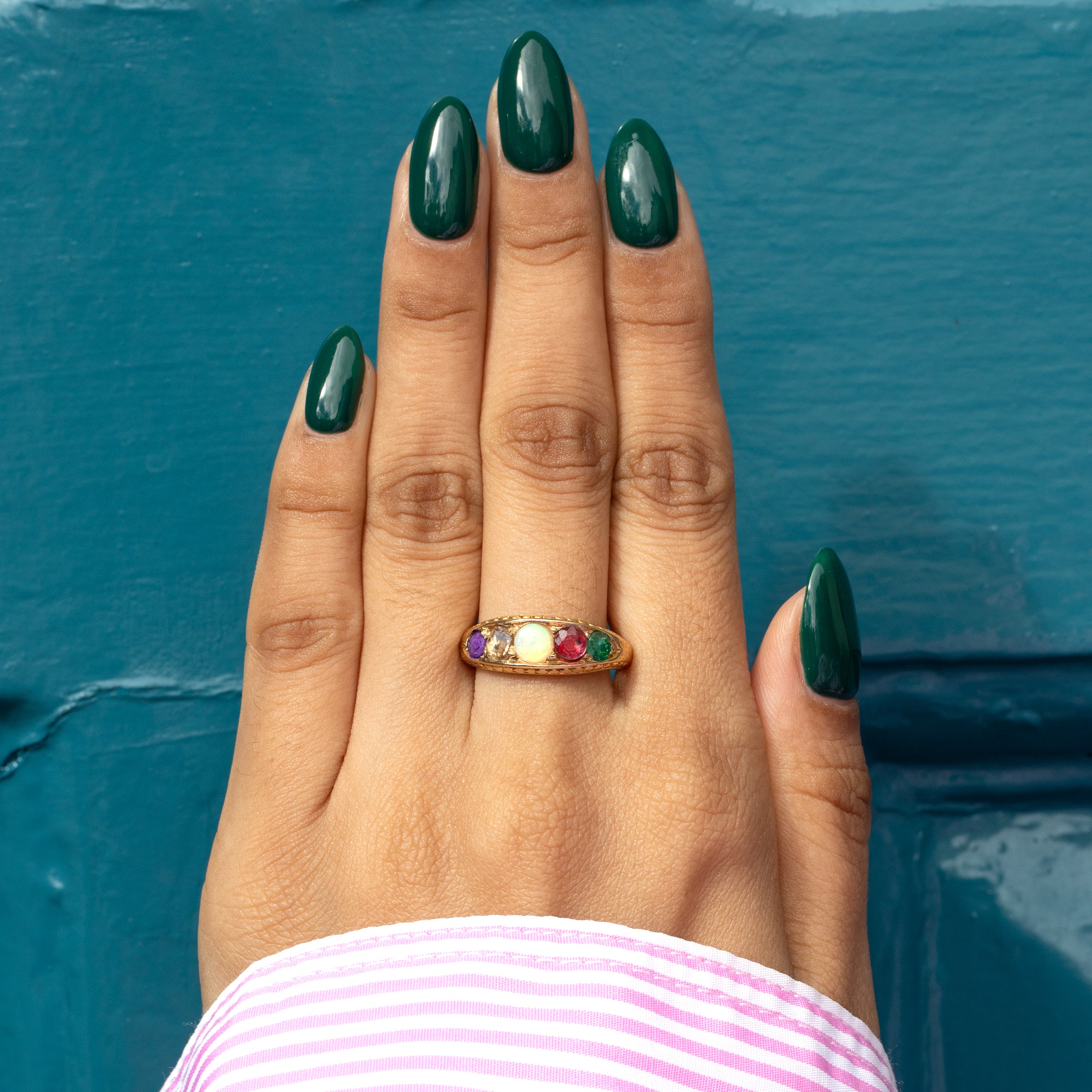 This Victorian 18ct Gold Adore acrostic ring is a definite crowd-pleaser! Made with romance in mind, Acrostic rings use gemstones to spell out a special message; this one in particular flaunts an Amethyst, Rose-cut Diamond, vivid Opal, Ruby and Emerald to spell out the word 'adore'!