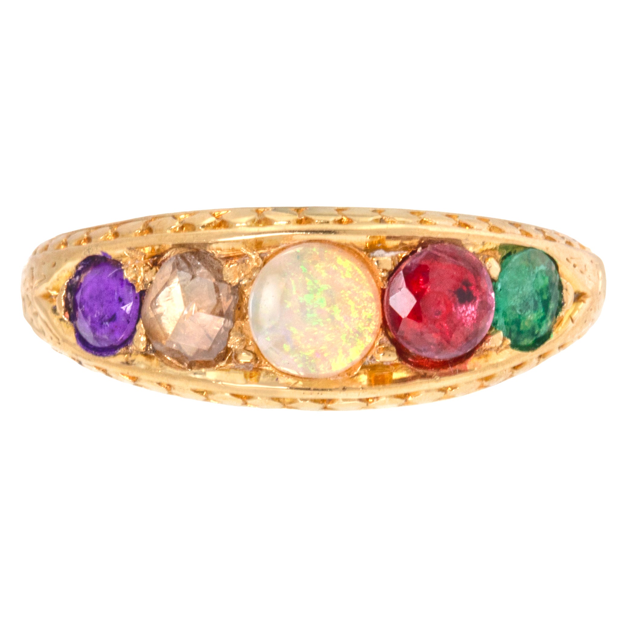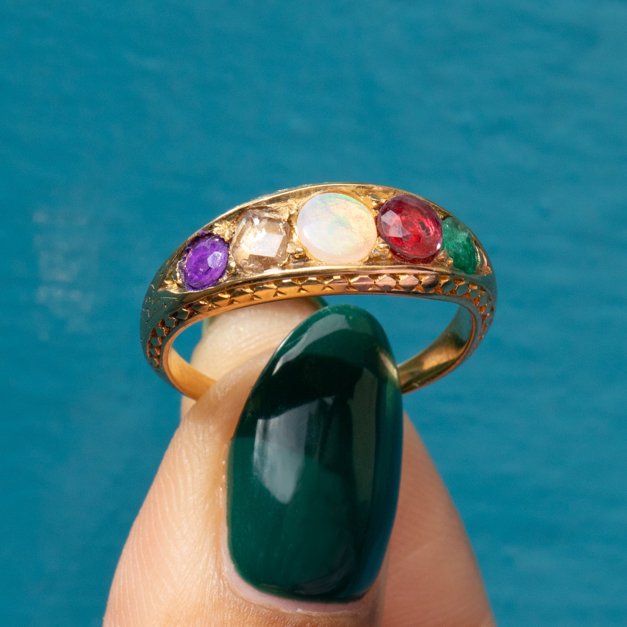 Victorian 18ct Gold Adore Acrostic Ring, Amethyst, Diamond, Opal, Ruby, Emerald