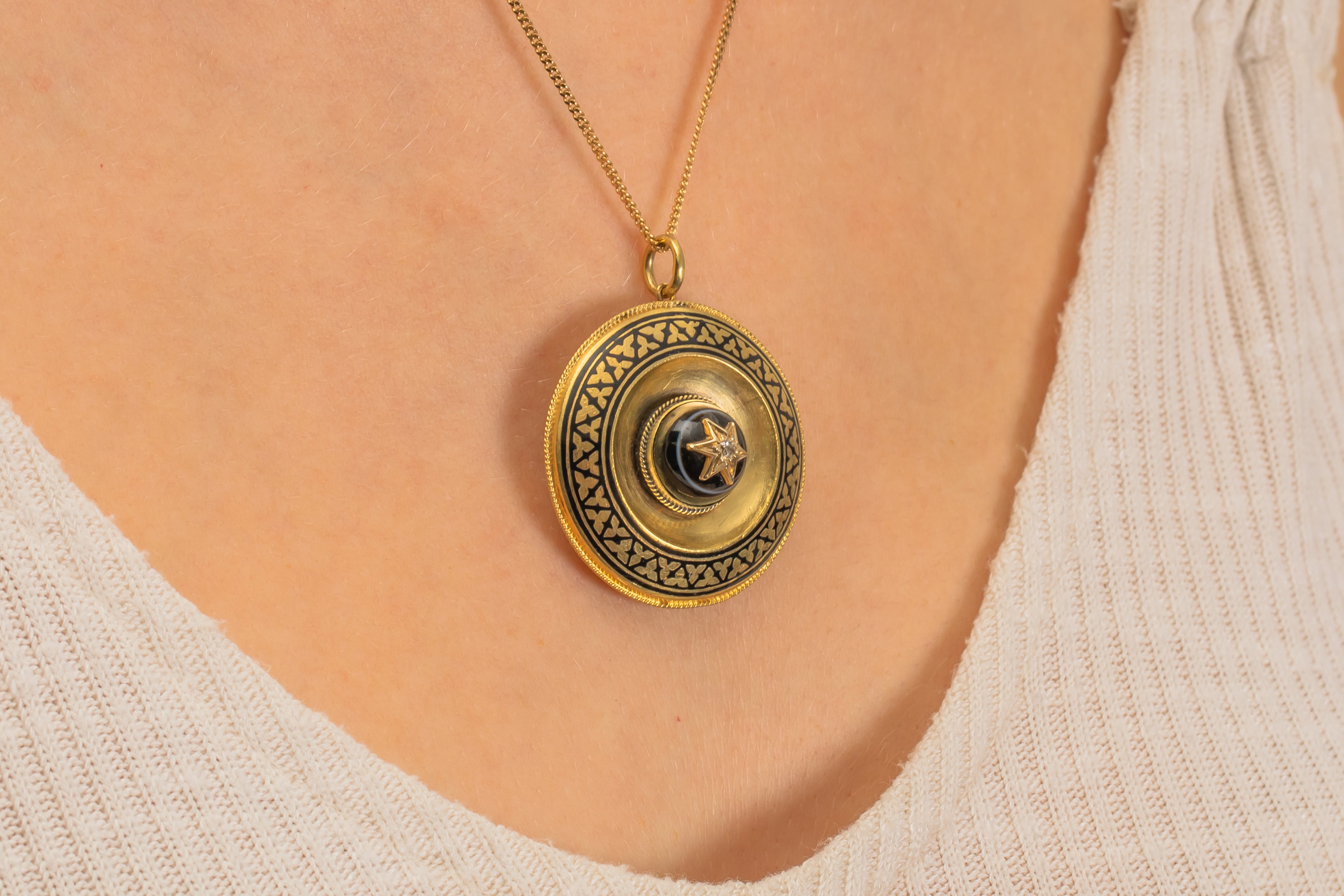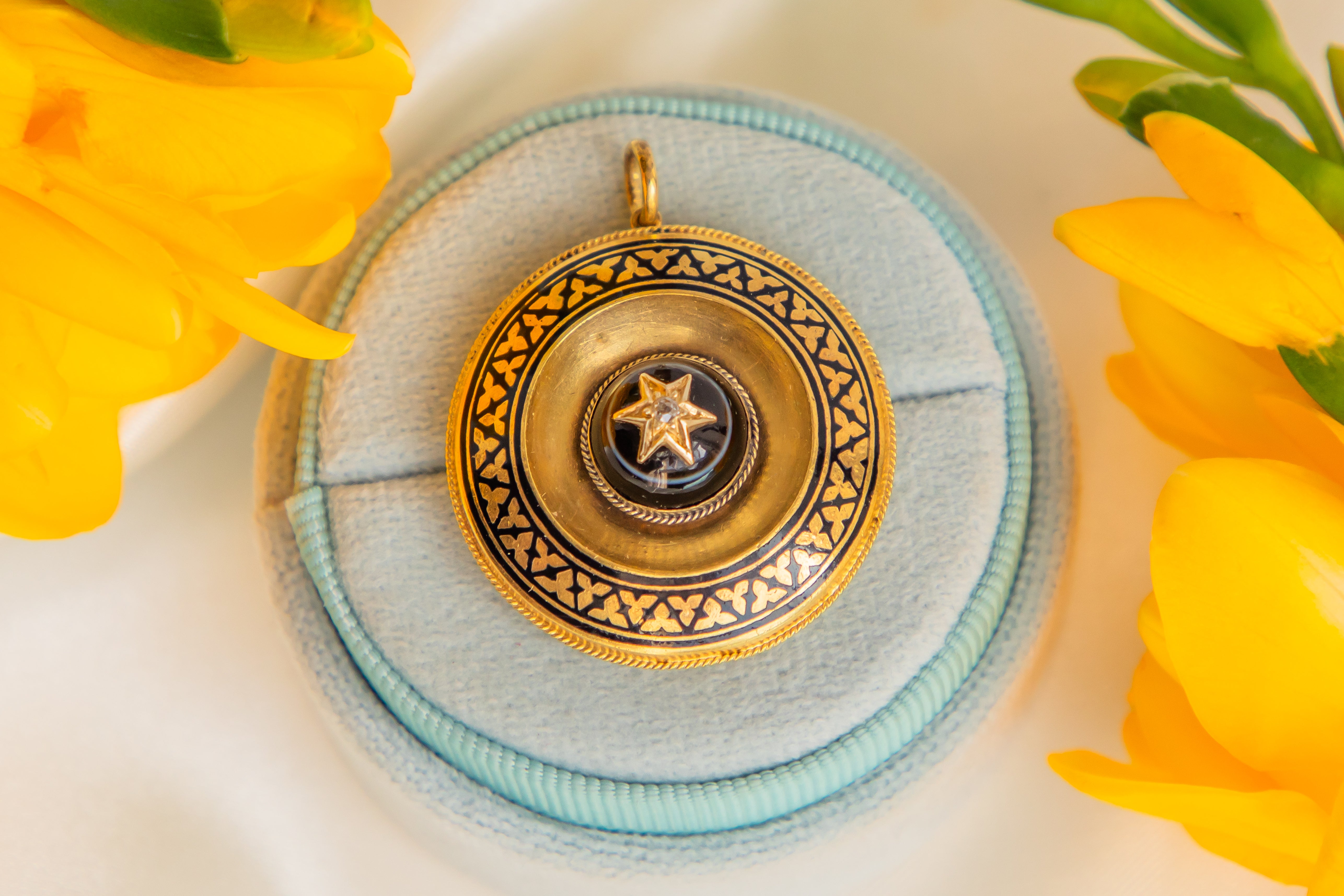 Your favourite part of this jewel will be the meticulously hand-painted black Enamel details on her rich 18ct Gold, adding another flourish of elegance. Complete with a locket back, she will also be home to your most precious photograph!
