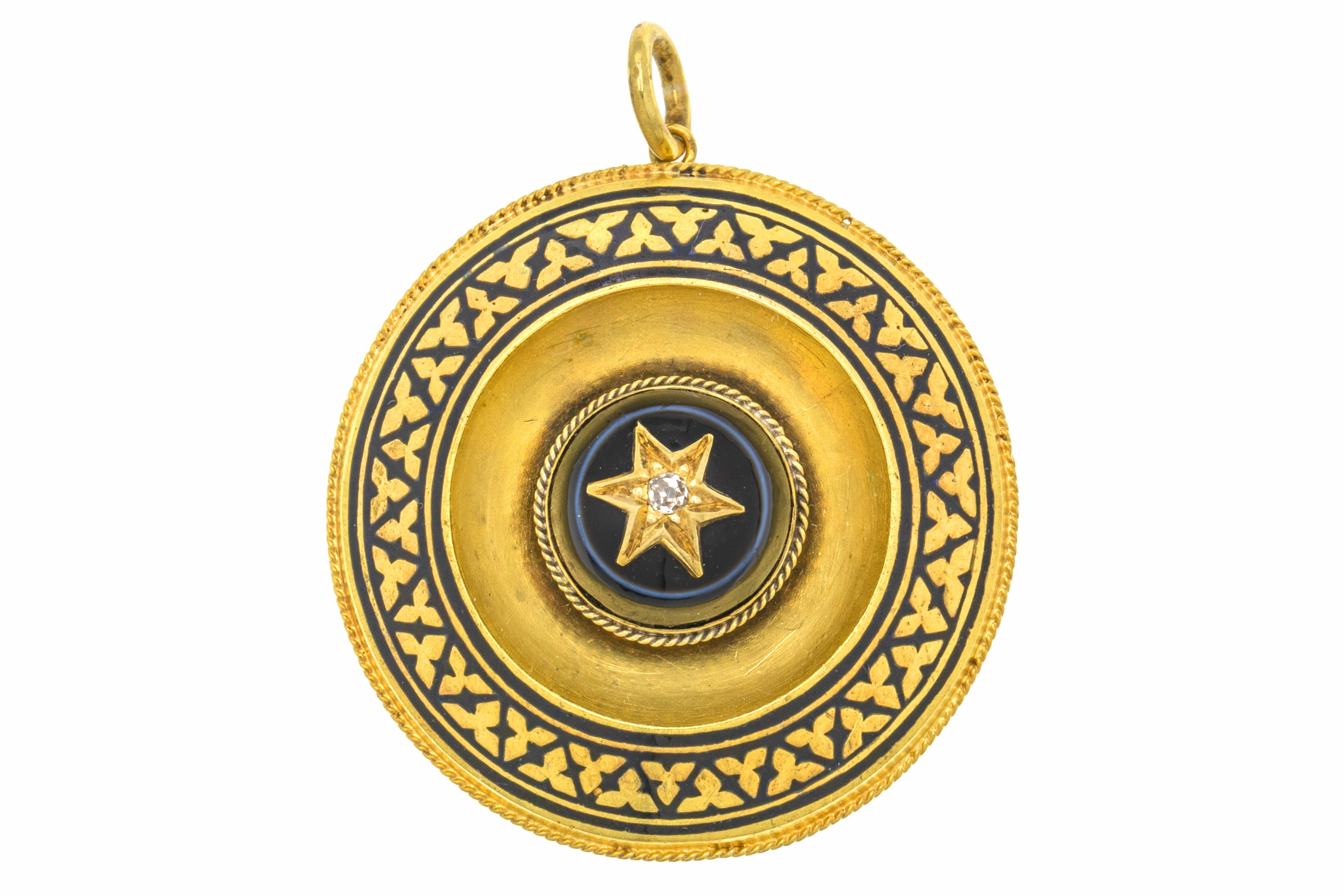This Victorian 18ct Gold Banded Agate Enamel Diamond pendant is a striking jewel! Inlaid with a domed Banded Agate and an old-cut antique Diamond star accent, this incredible Etruscan revival pendant will transform you into a warrior queen.