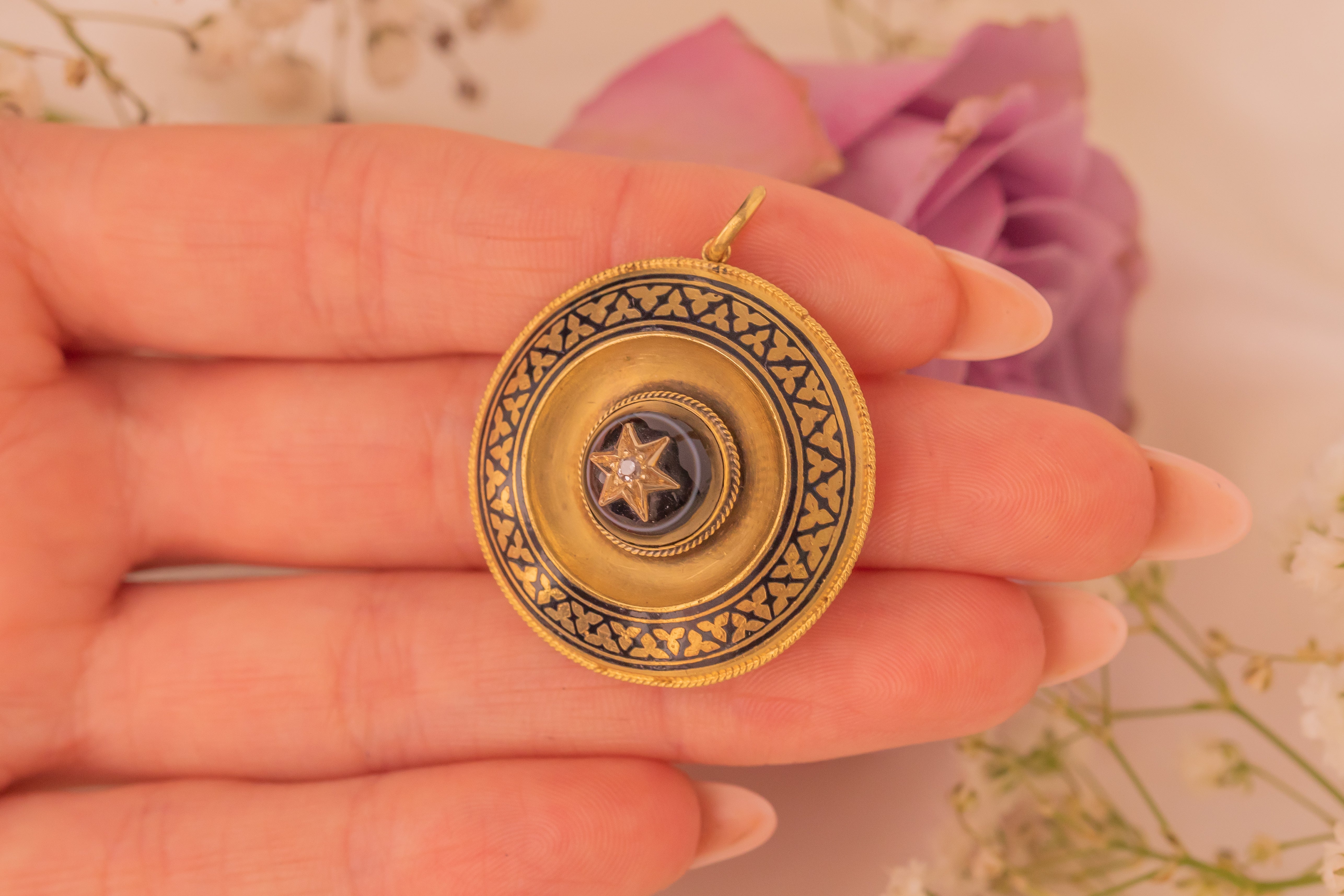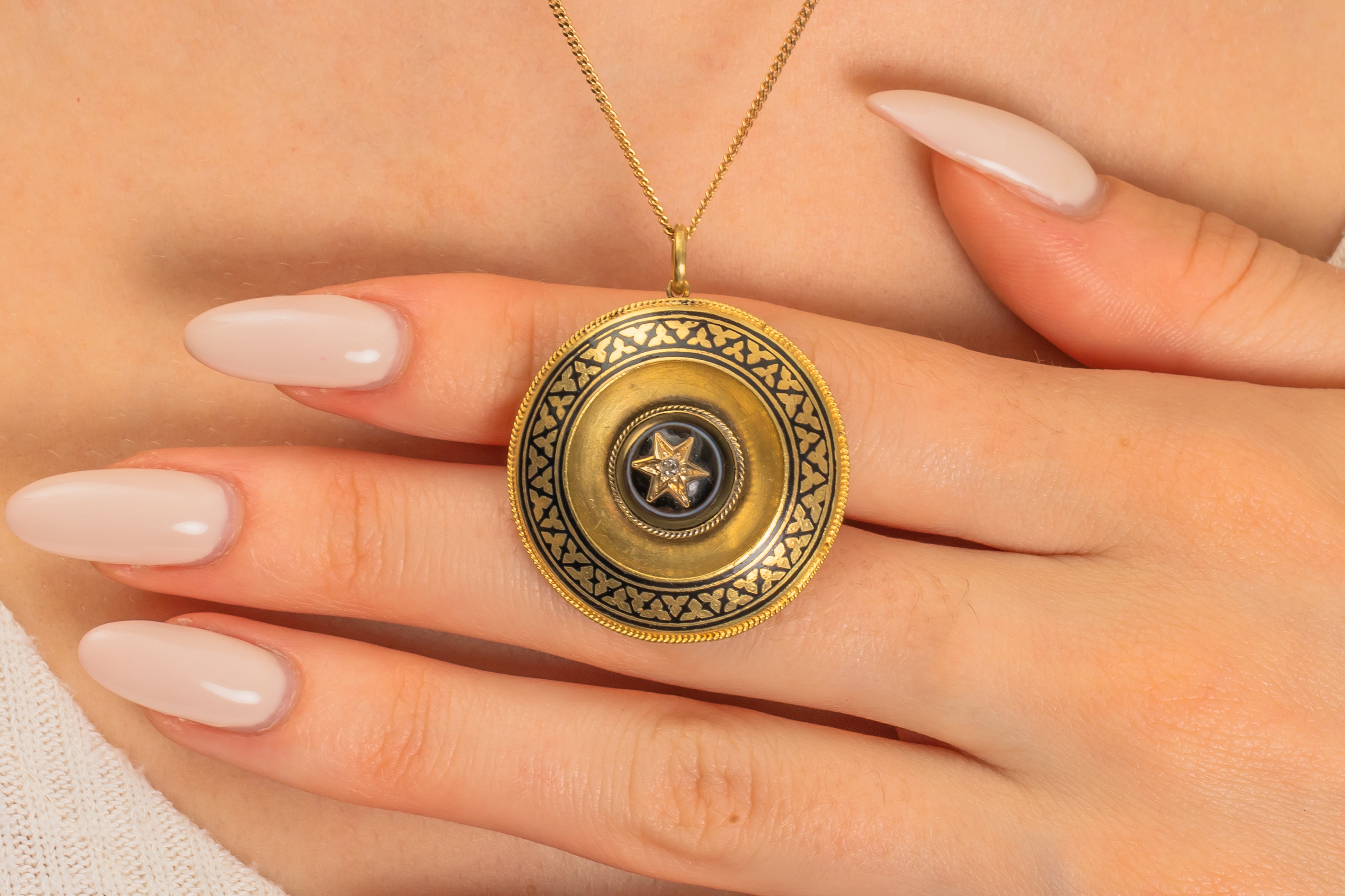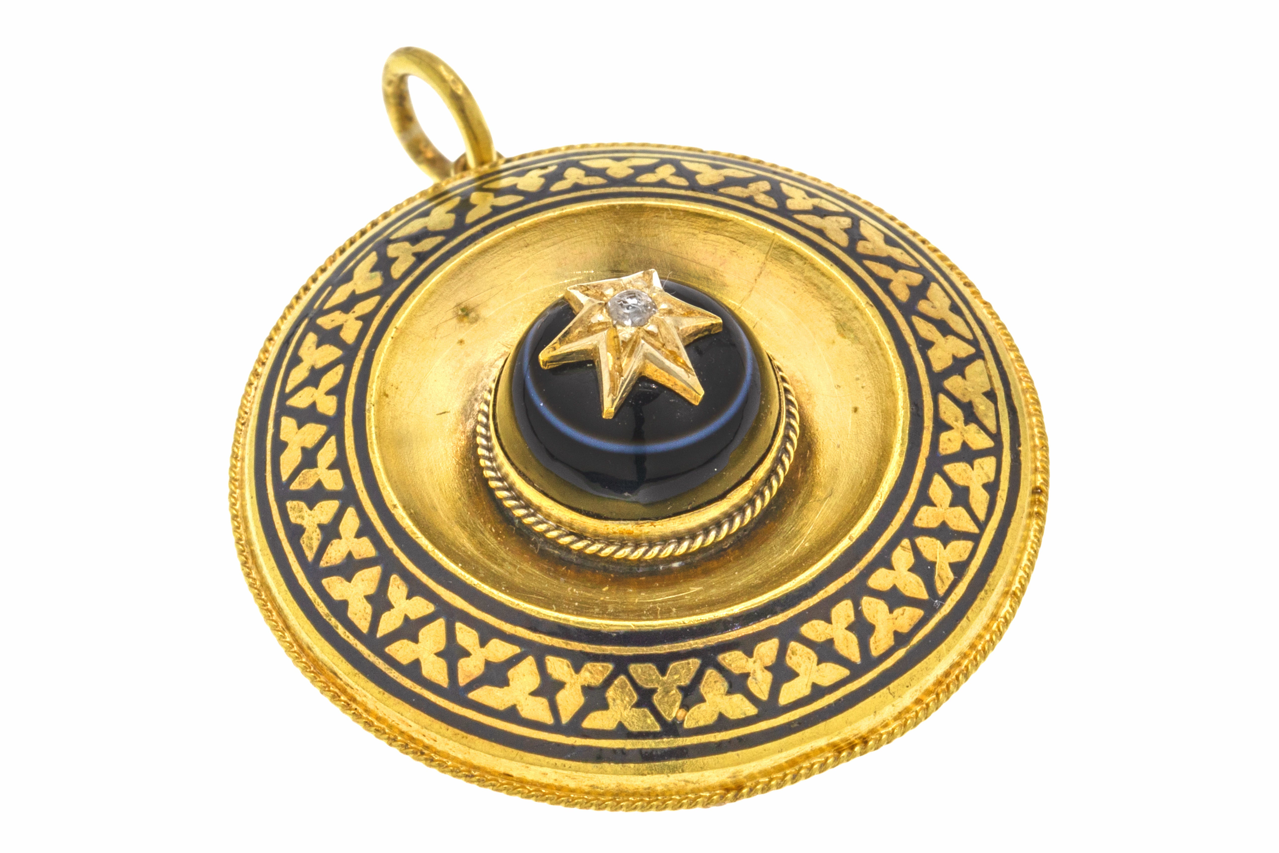 VERY GOOD-EXCELLENT: This Victorian 18ct Gold banded Agate Enamel Diamond pendant is in wonderful condition. Starting life as a brooch, she has been expertly converted into a pendant locket, where you can remove the back and place your own photos. With such minimal signs of this conversion, it's as though she has always been destined to be a pendant. Under close inspection, you will see abrasions around where the jump ring has been added. The jump ring is soldered ensuring secure wear at all times. This Etruscan revival pendant will add bundles of character to your jewellery box.