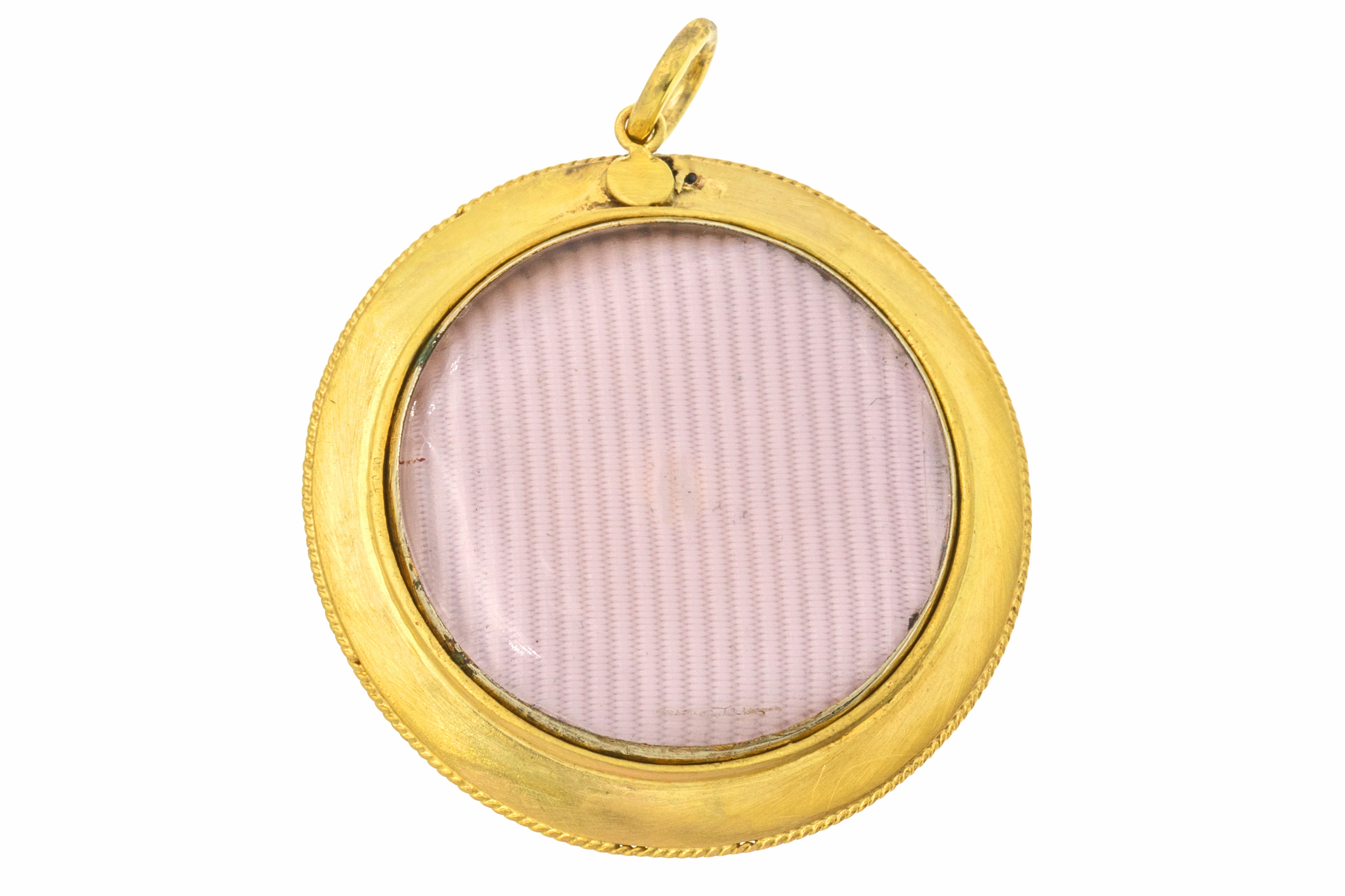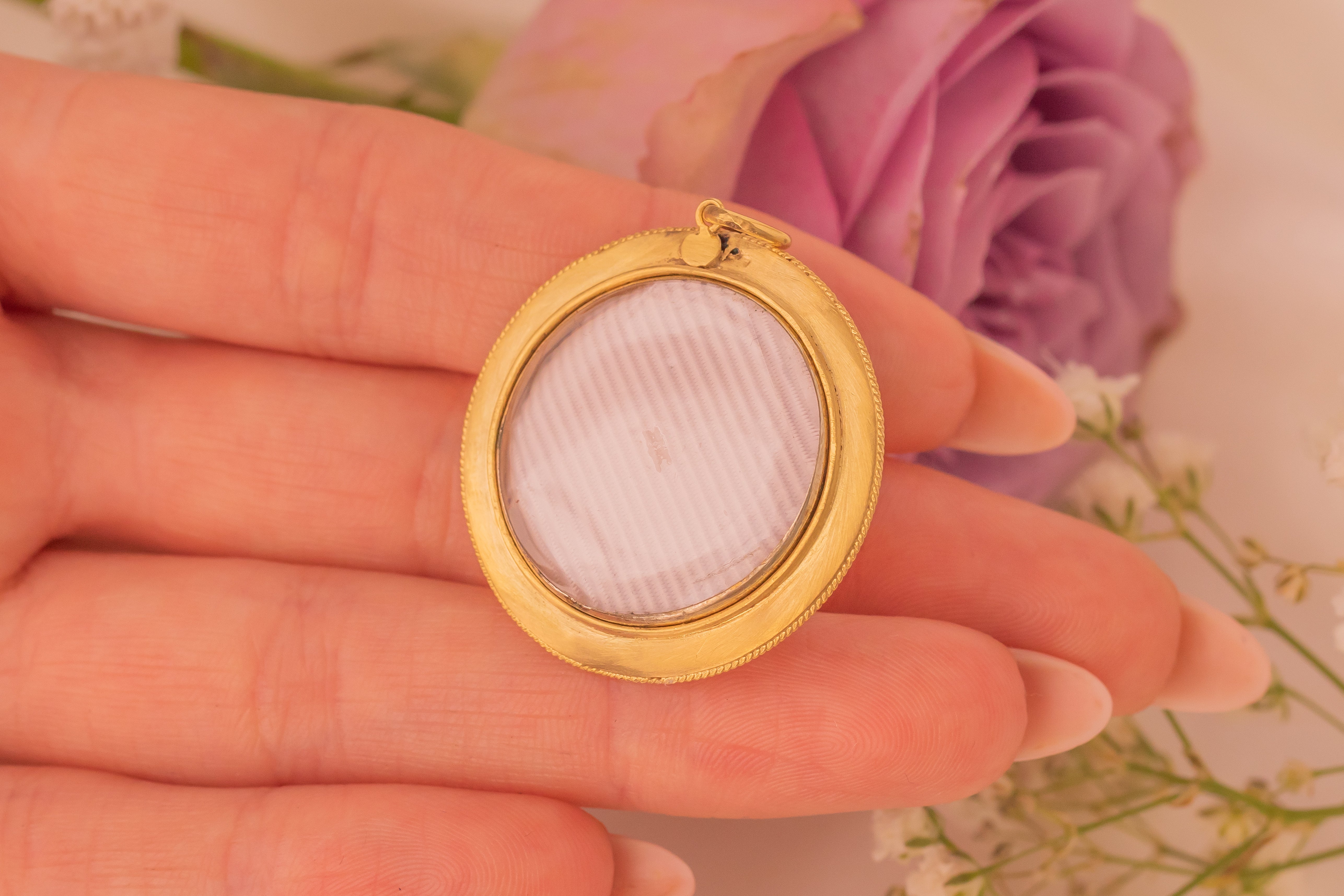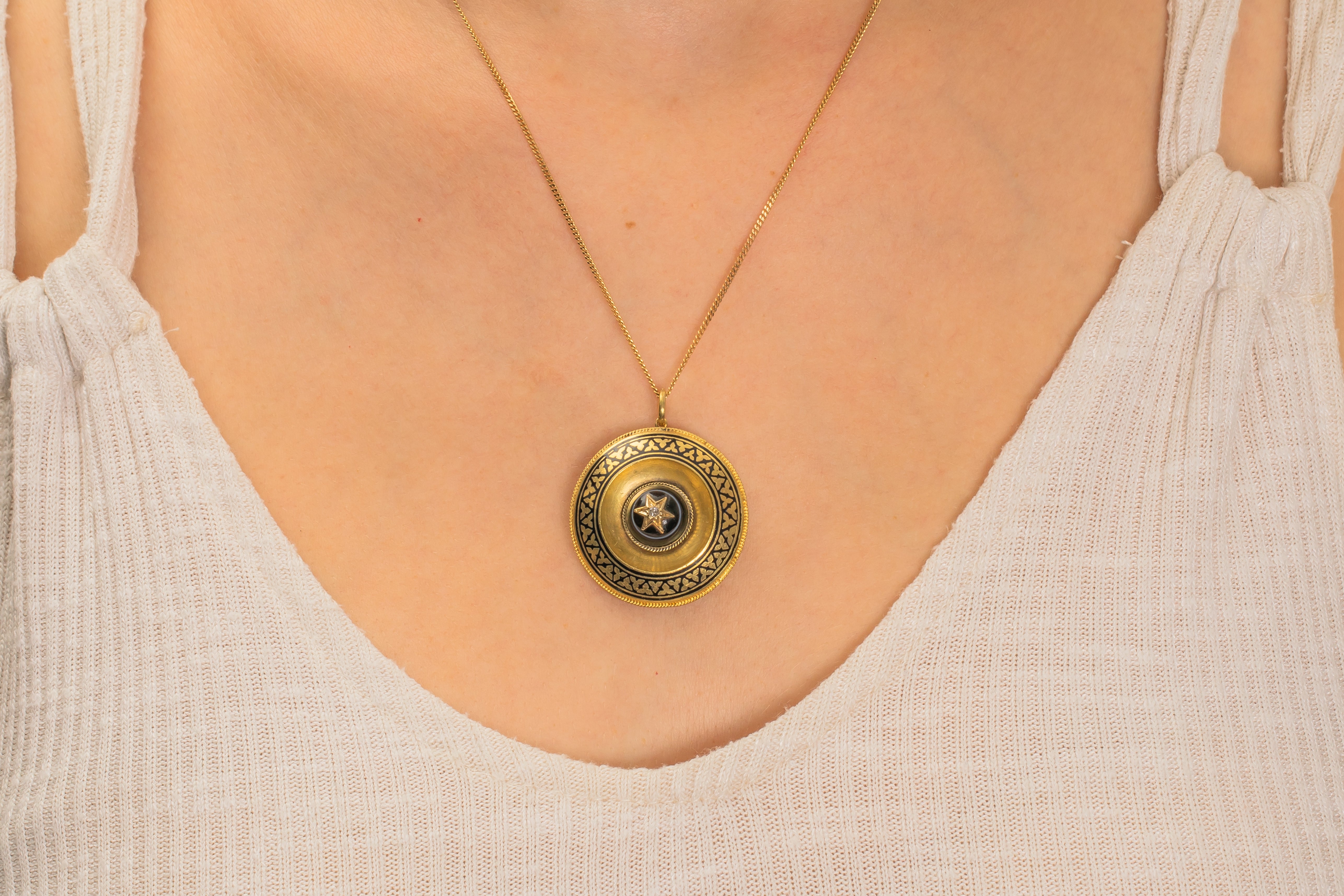 VERY GOOD-EXCELLENT: This Victorian 18ct Gold banded Agate Enamel Diamond pendant is in wonderful condition. Starting life as a brooch, she has been expertly converted into a pendant locket, where you can remove the back and place your own photos. With such minimal signs of this conversion, it's as though she has always been destined to be a pendant. Under close inspection, you will see abrasions around where the jump ring has been added. The jump ring is soldered ensuring secure wear at all times. This Etruscan revival pendant will add bundles of character to your jewellery box.