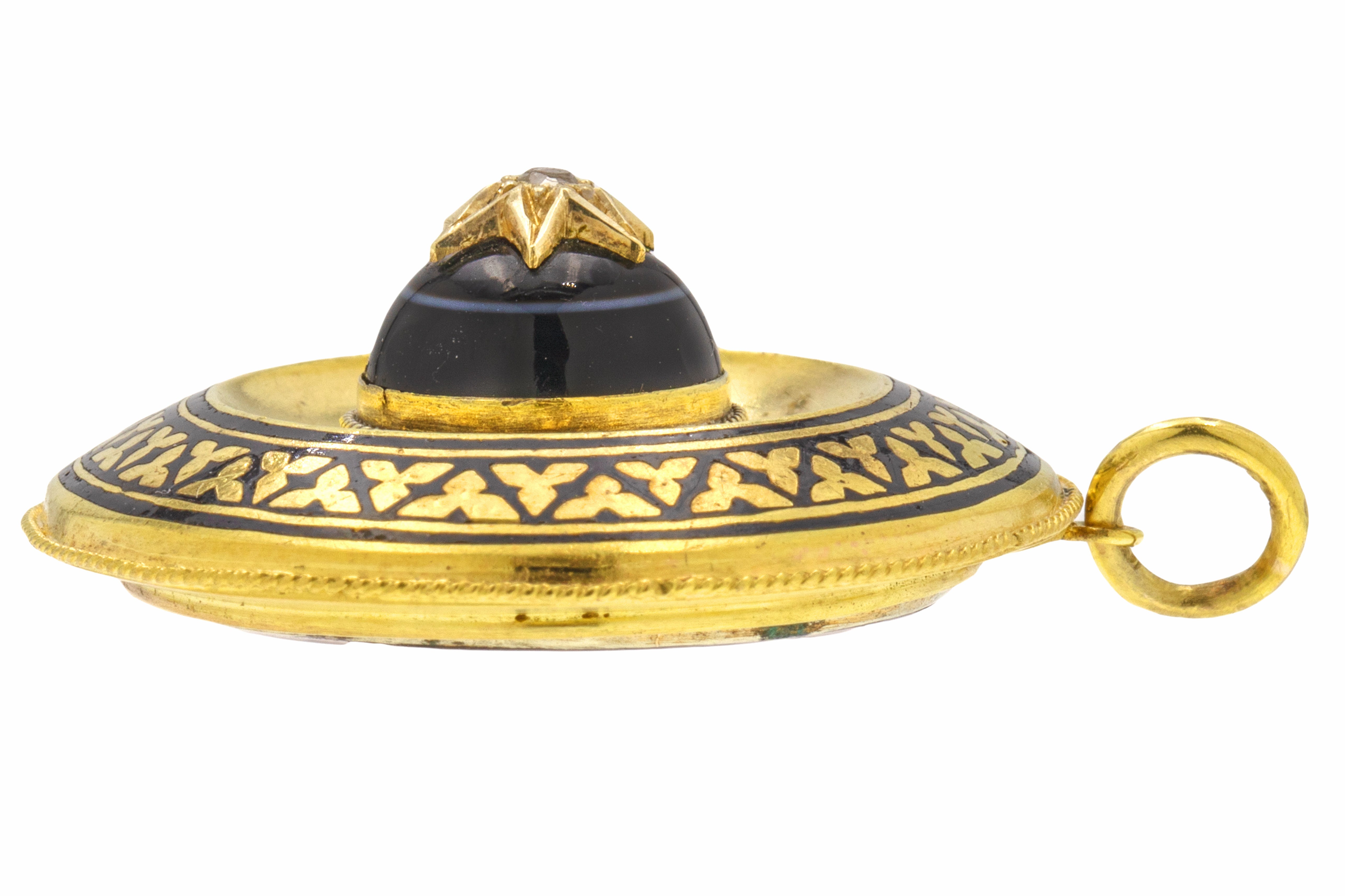 MATERIALS: Solid 18ct Gold, Black Enamel, Banded Agate, old-cut antique Diamond.