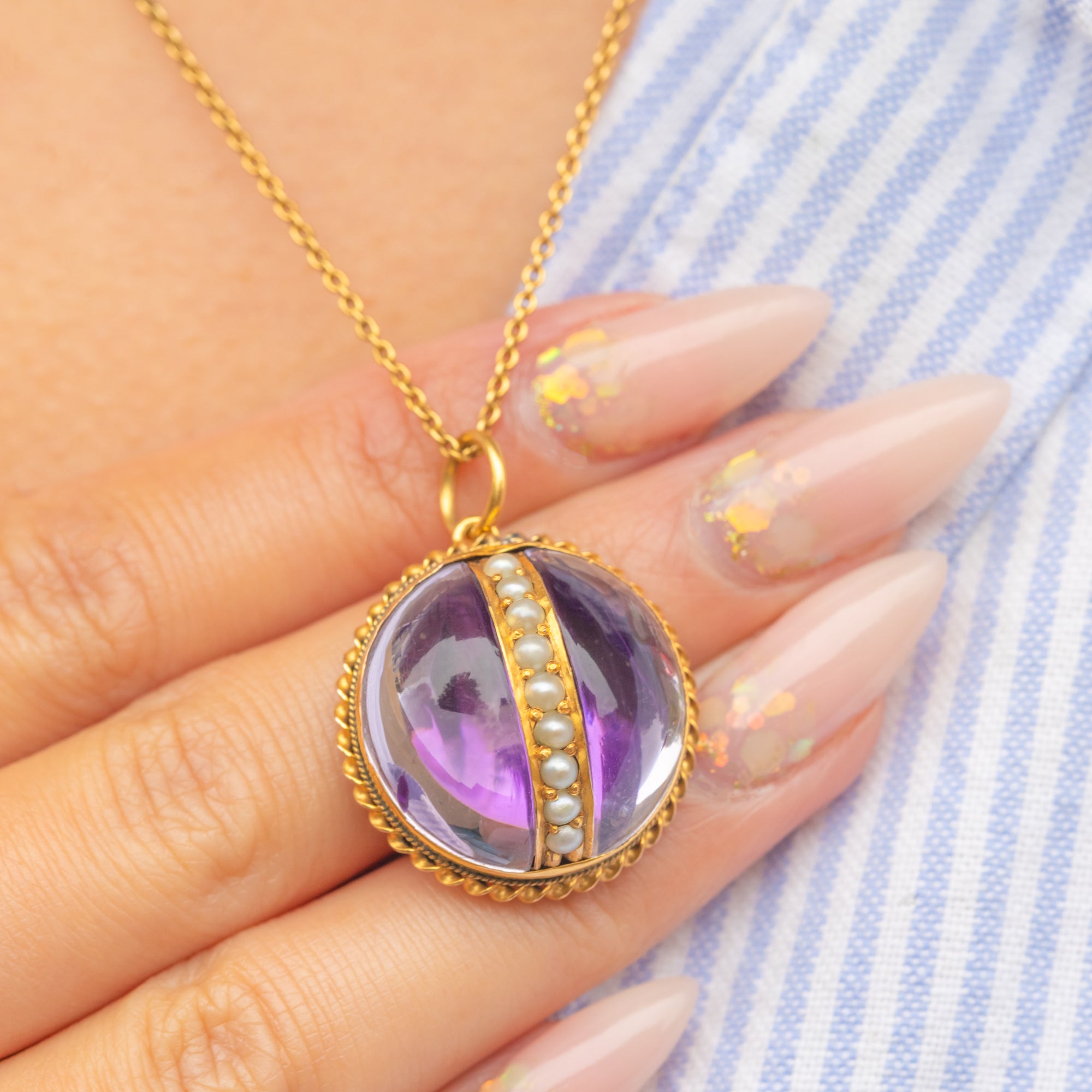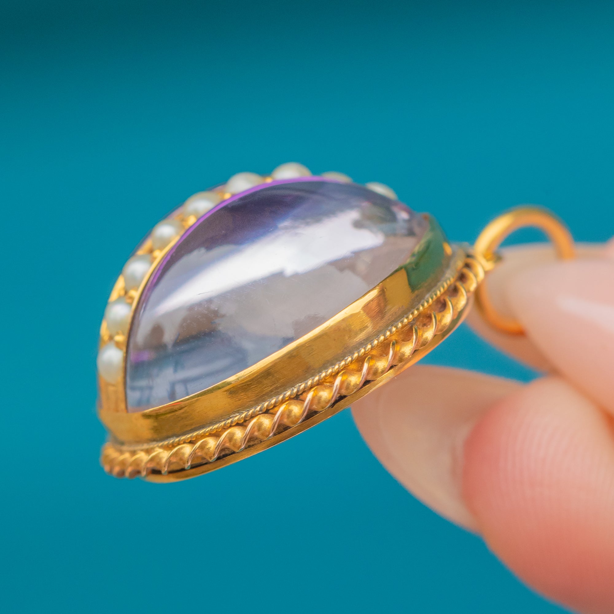 A single 2mm Pearl accents the design, adding a delicate contrast against the glowing Quartz. Bold in scale yet refined in detail, this pendant is a wonderful example of Victorian gemstone jewellery and makes a dramatic statement when worn on a fine chain or layered with other antique pieces.