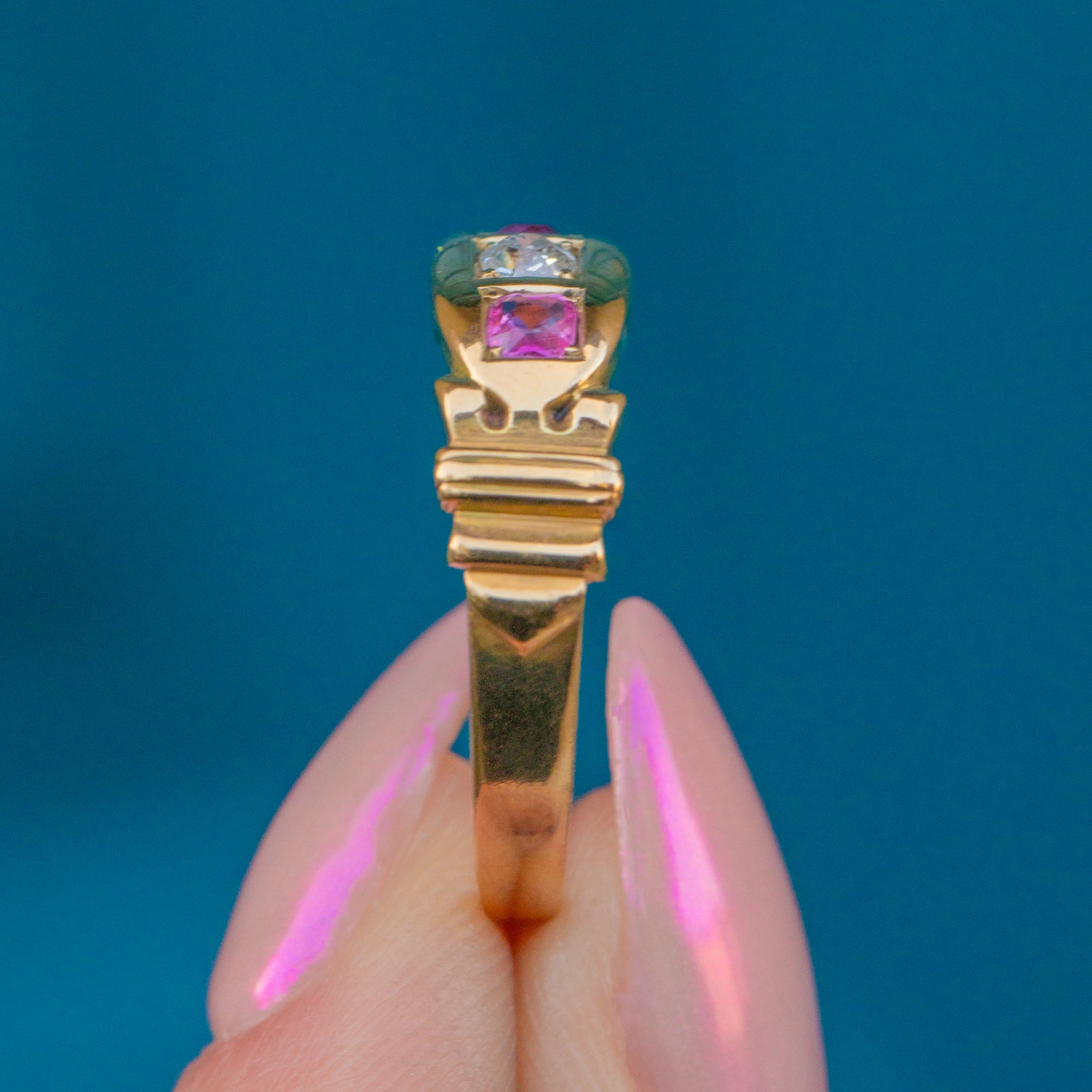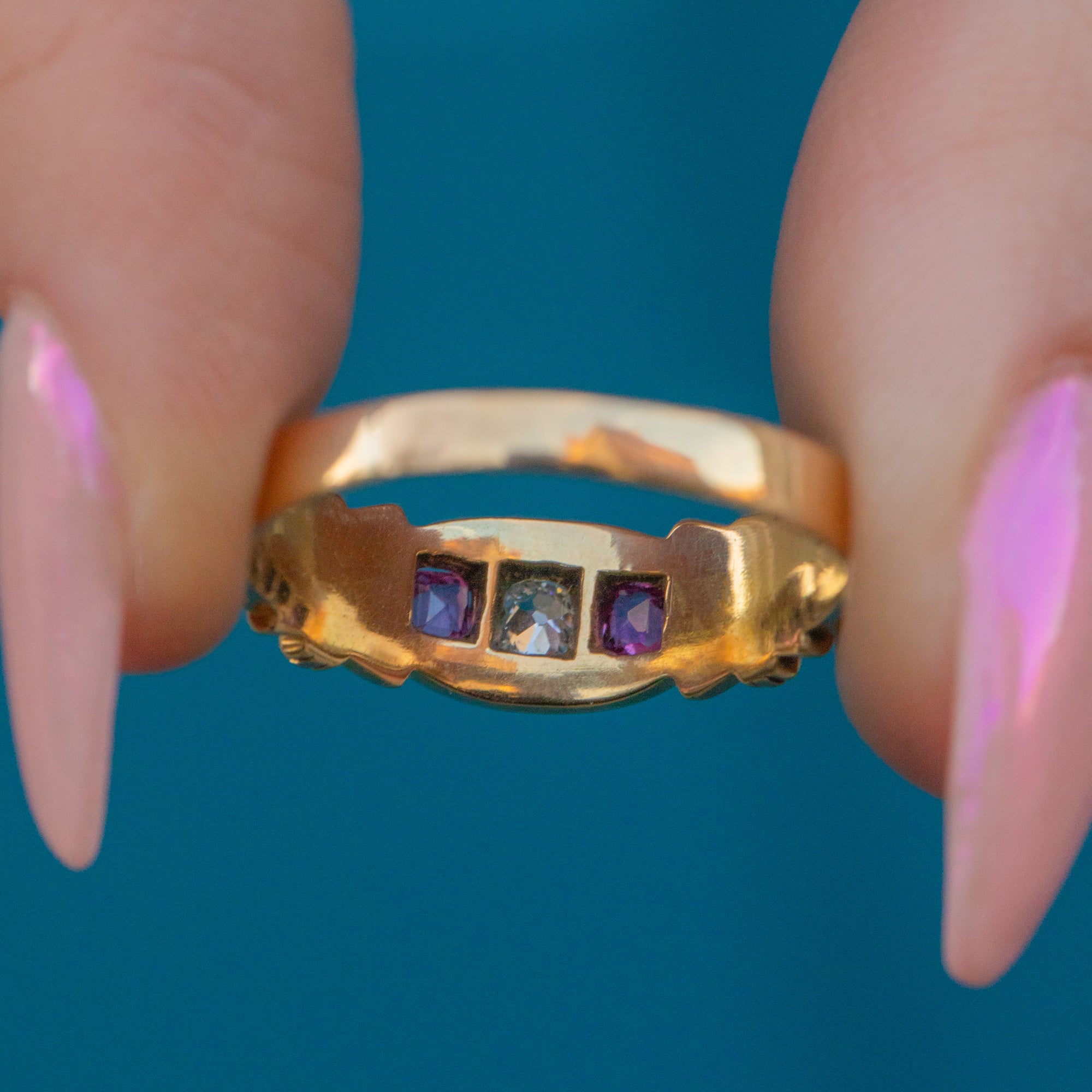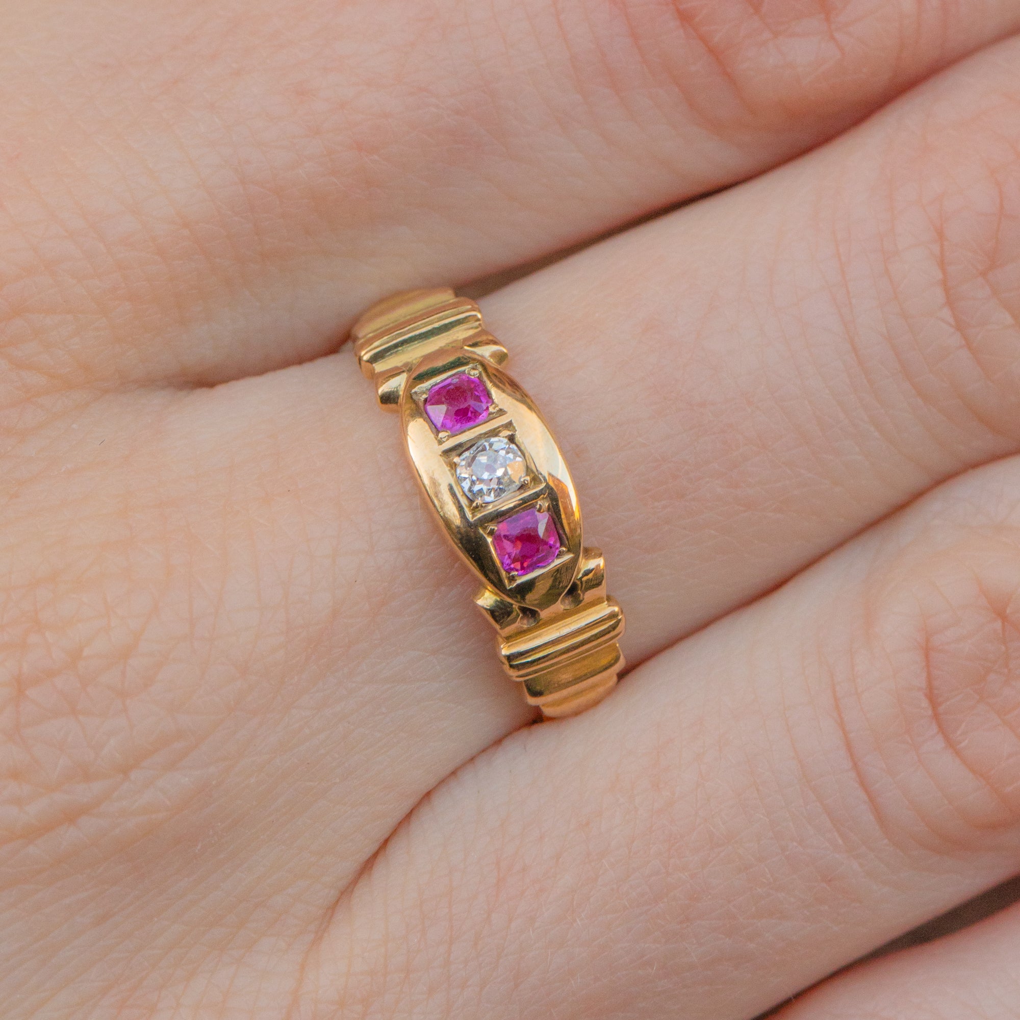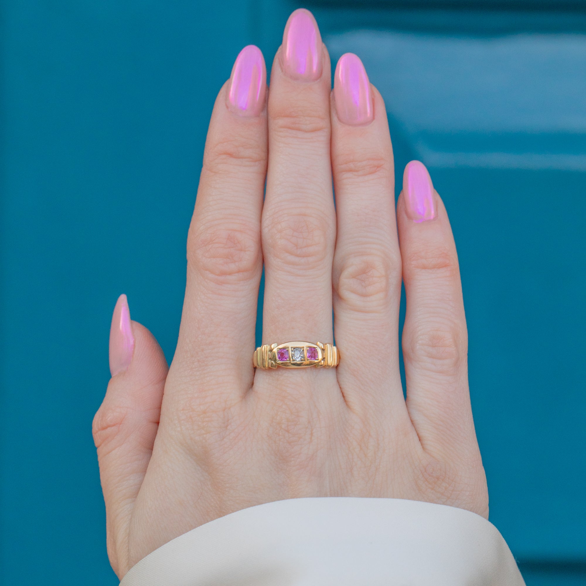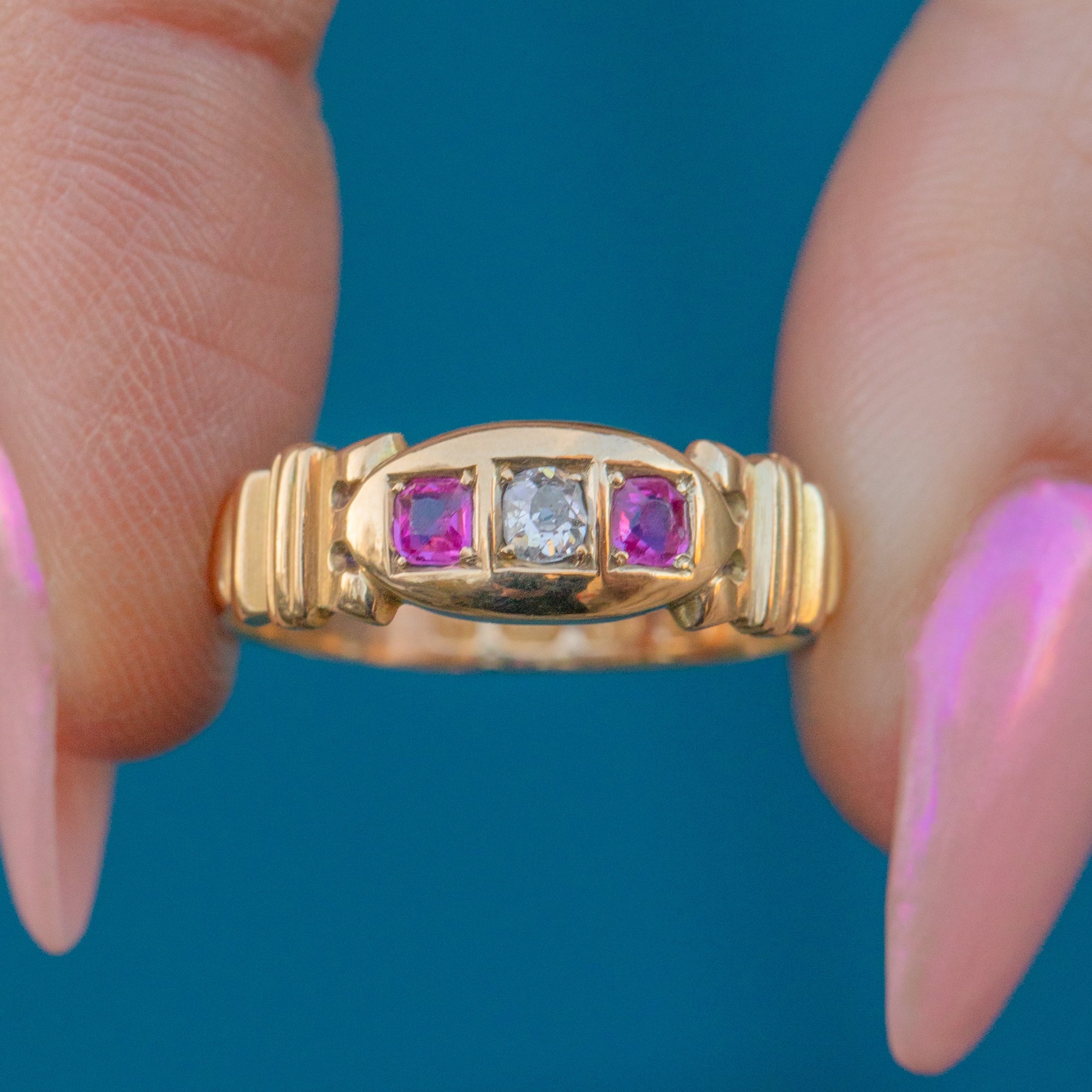 This Victorian 18ct Gold Pink Sapphire and Diamond gyspy ring is totally irresistible! Her sumptuous 18ct Gold is inlaid with two fushia Sapphires flanking a twinkling Diamond, nestled within bold settings, and framed by beautifully textured shoulders creating a timeless piece for everyday wear.