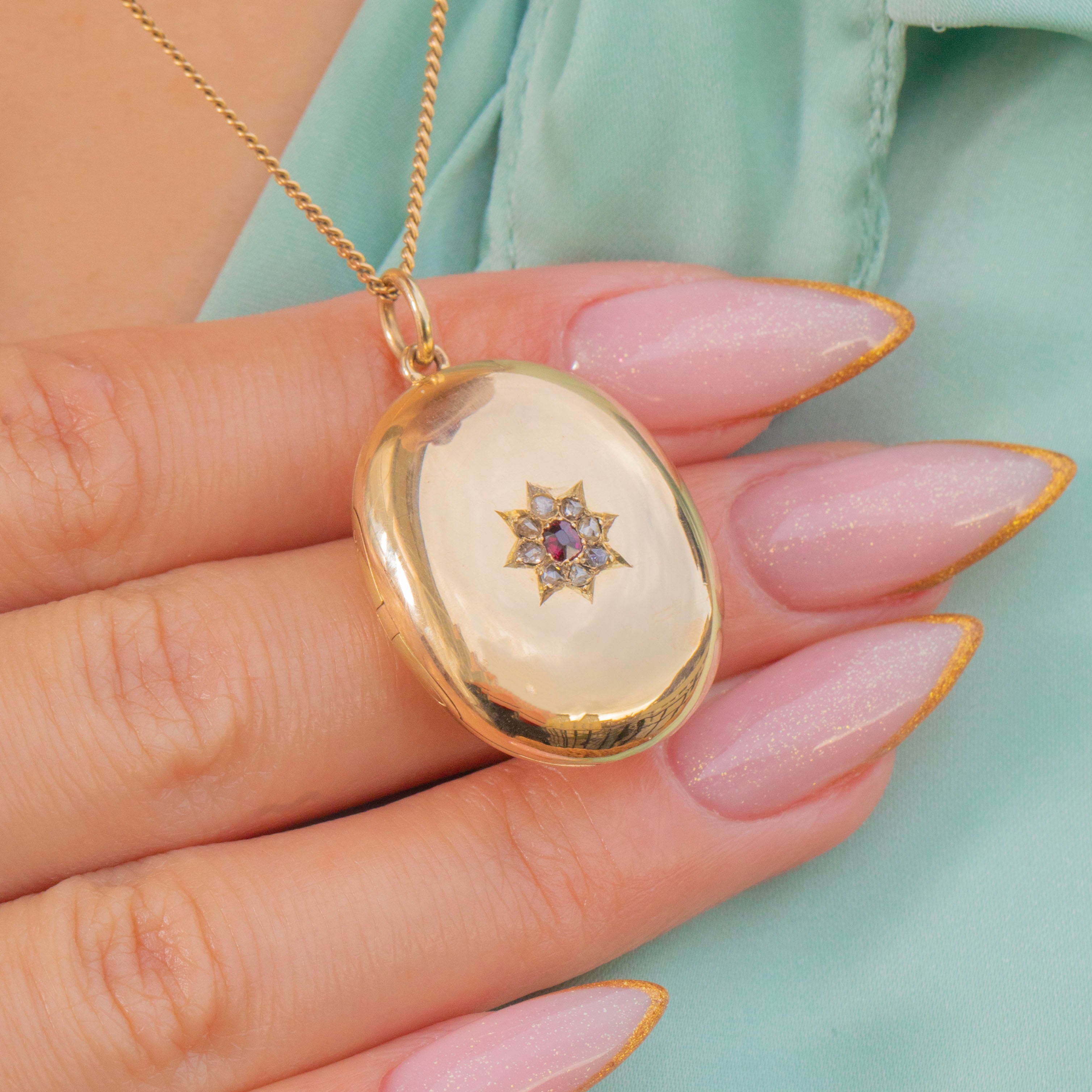 This exquisite late Victorian locket is a true treasure, crafted in luxurious 18ct Gold and displaying a radiant oval Ruby framed by twinkling rose-cut Diamonds in an ornate star-setting. The rich, buttery Gold gleams beautifully against the soft sparkle of the antique Diamonds, creating a timeless and romantic look.