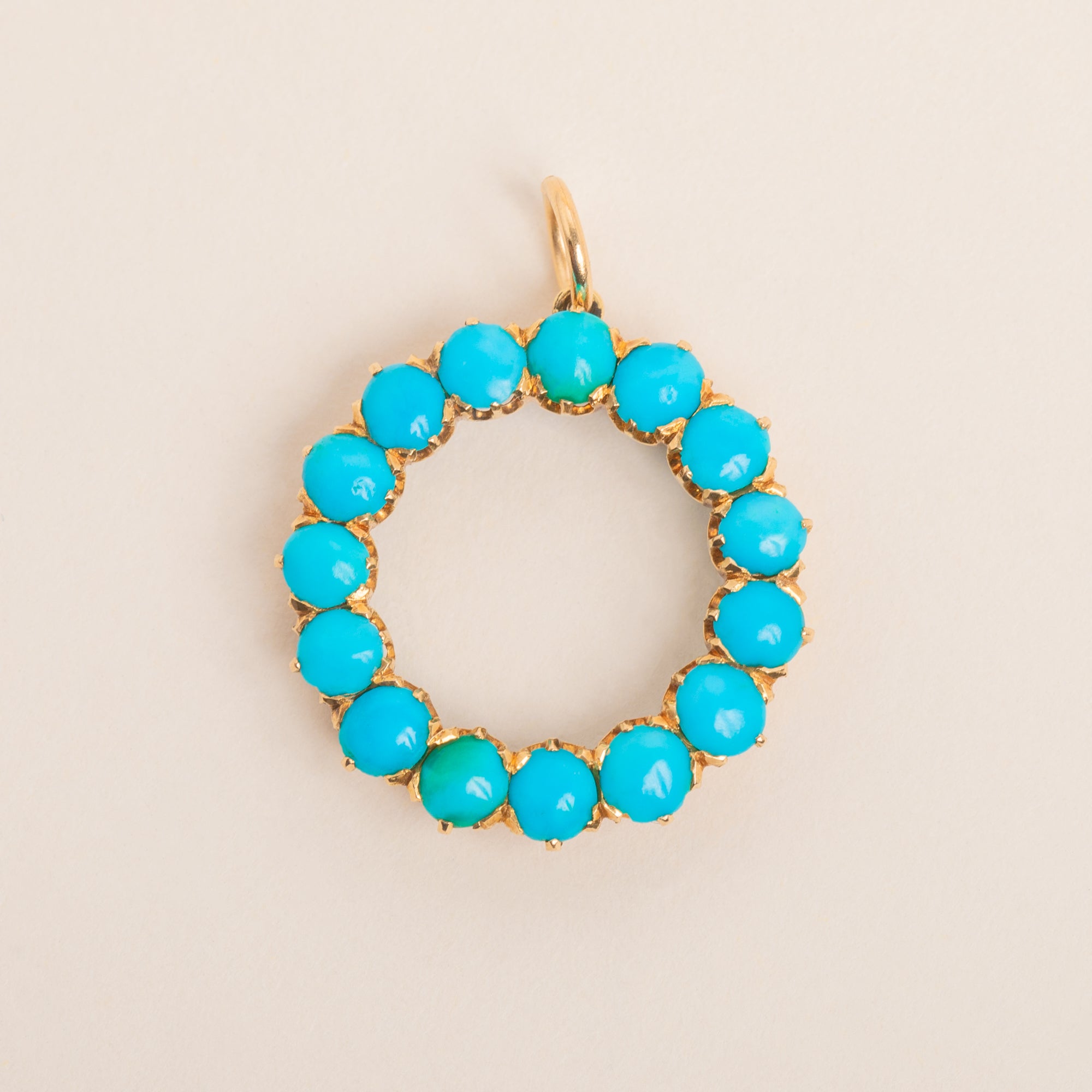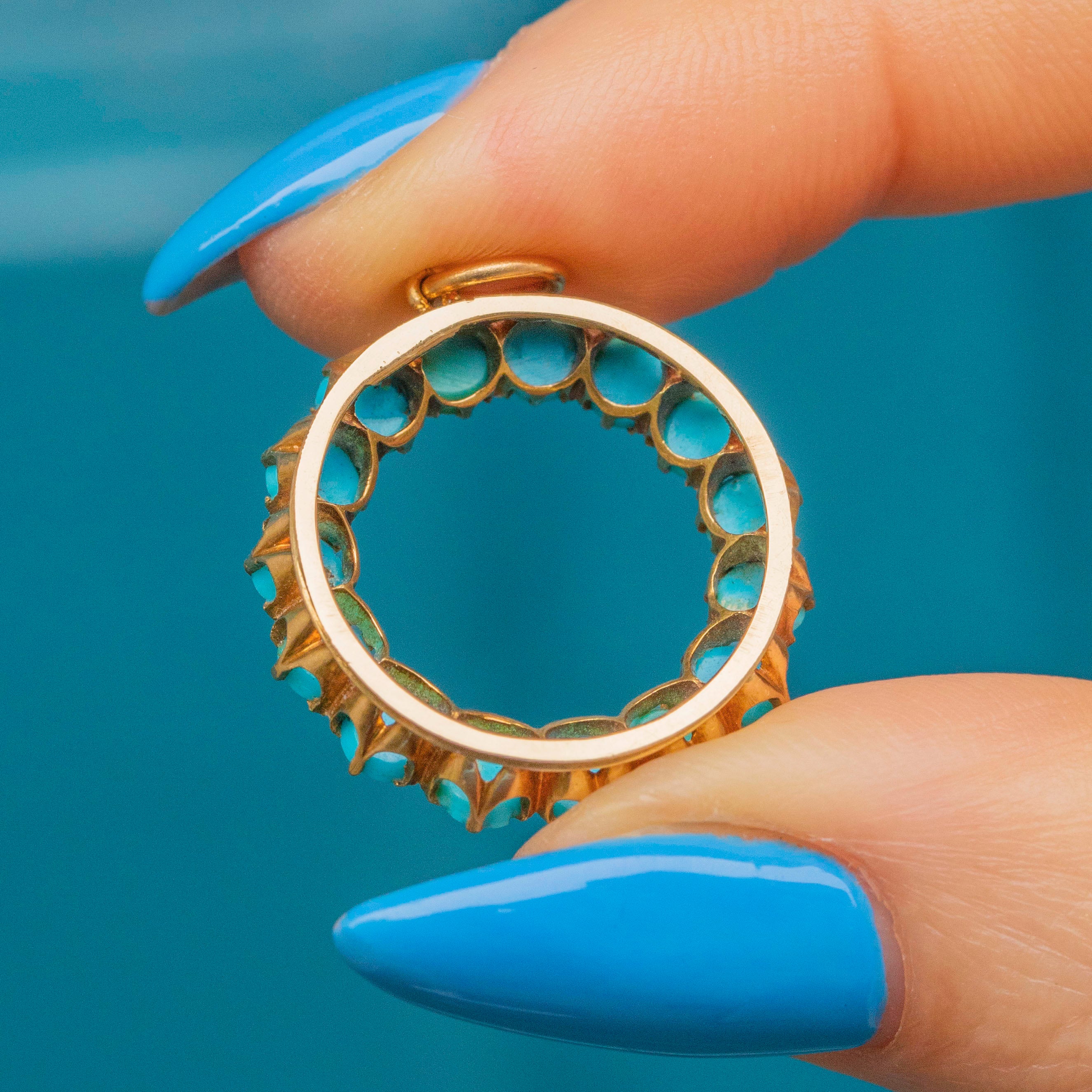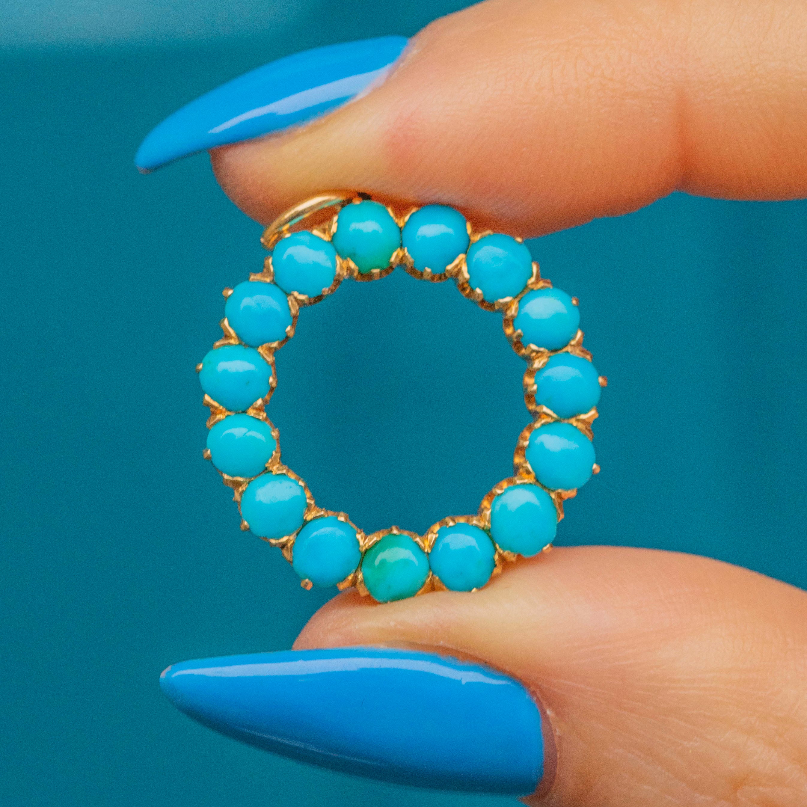 VERY GOOD. This Victorian 18ct Gold Turquoise roundel pendant is in very good condition! The Turquoise gems sit beautifully uniform, matched in tone overall but with some subtle natural variations to one or two. This pendant was likely once a brooch, and there is ever so slight indications of this on the back of the piece but it is smooth and wears comfortably.
