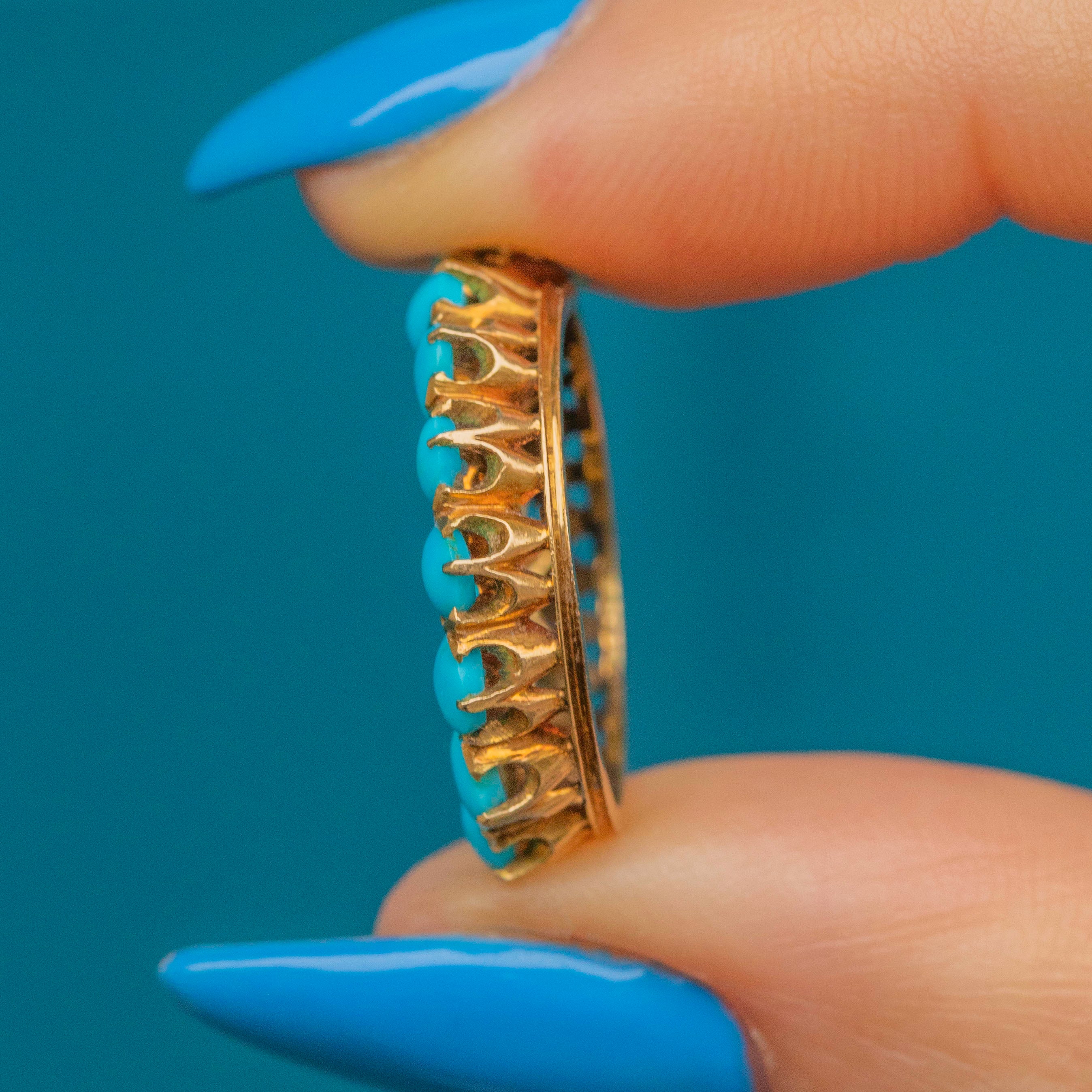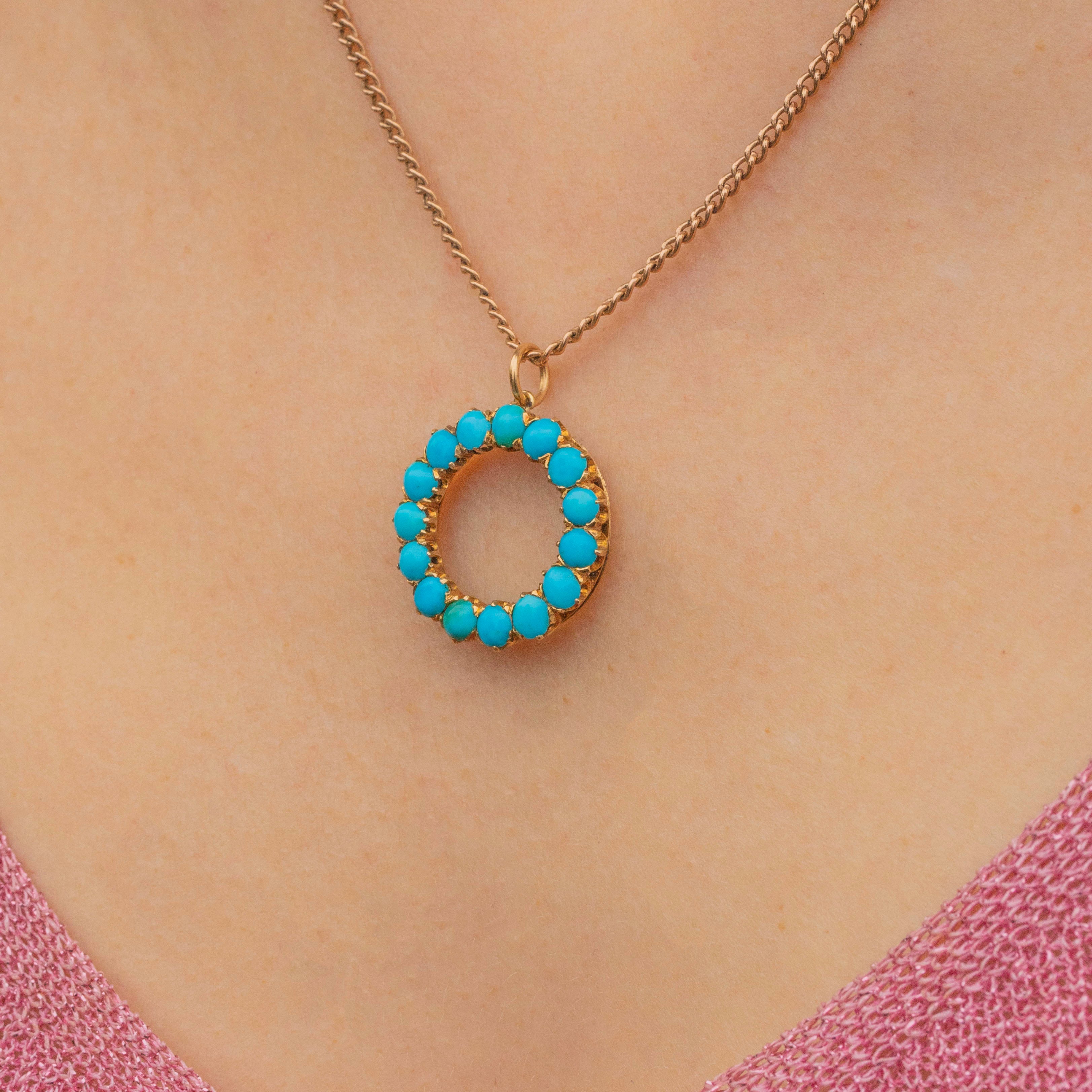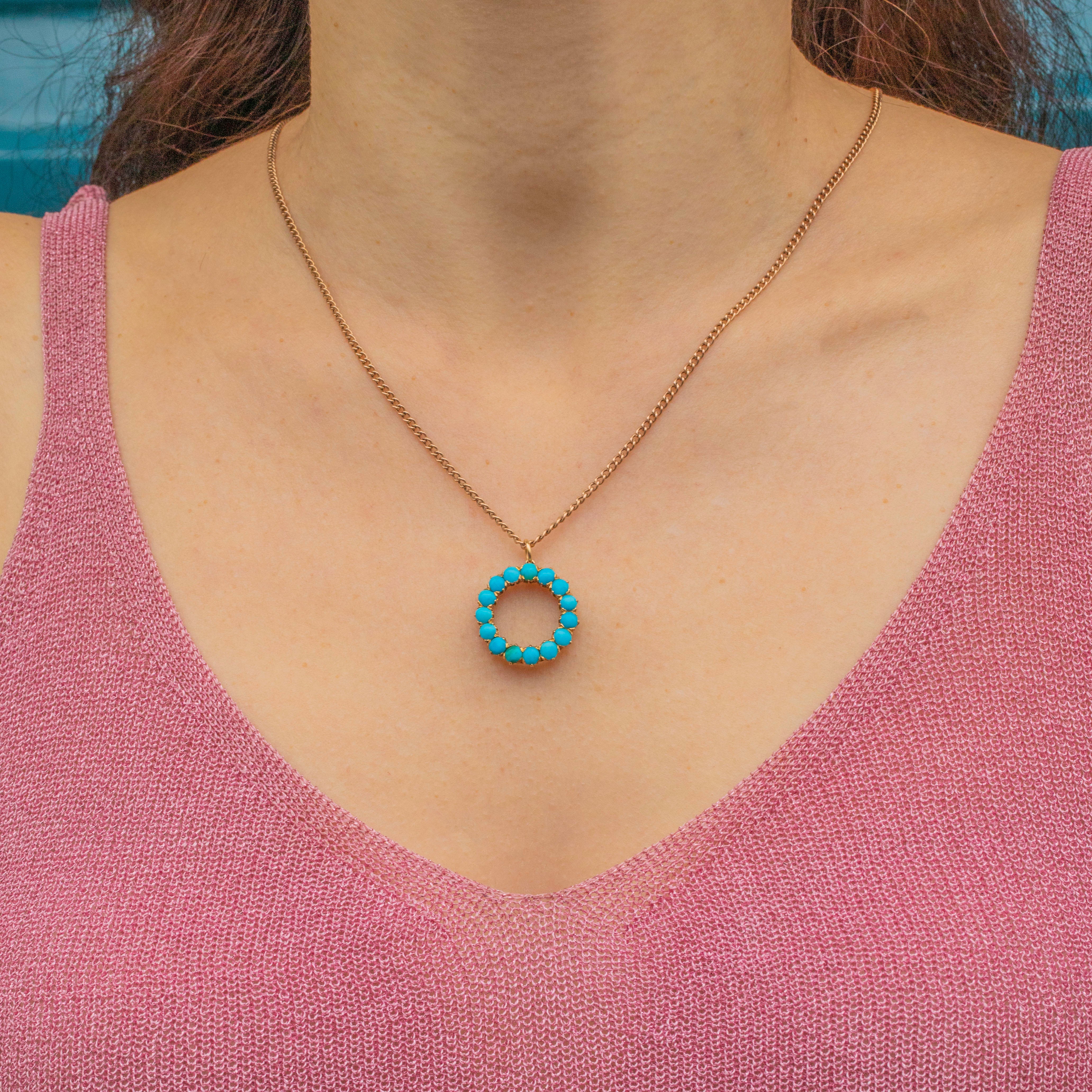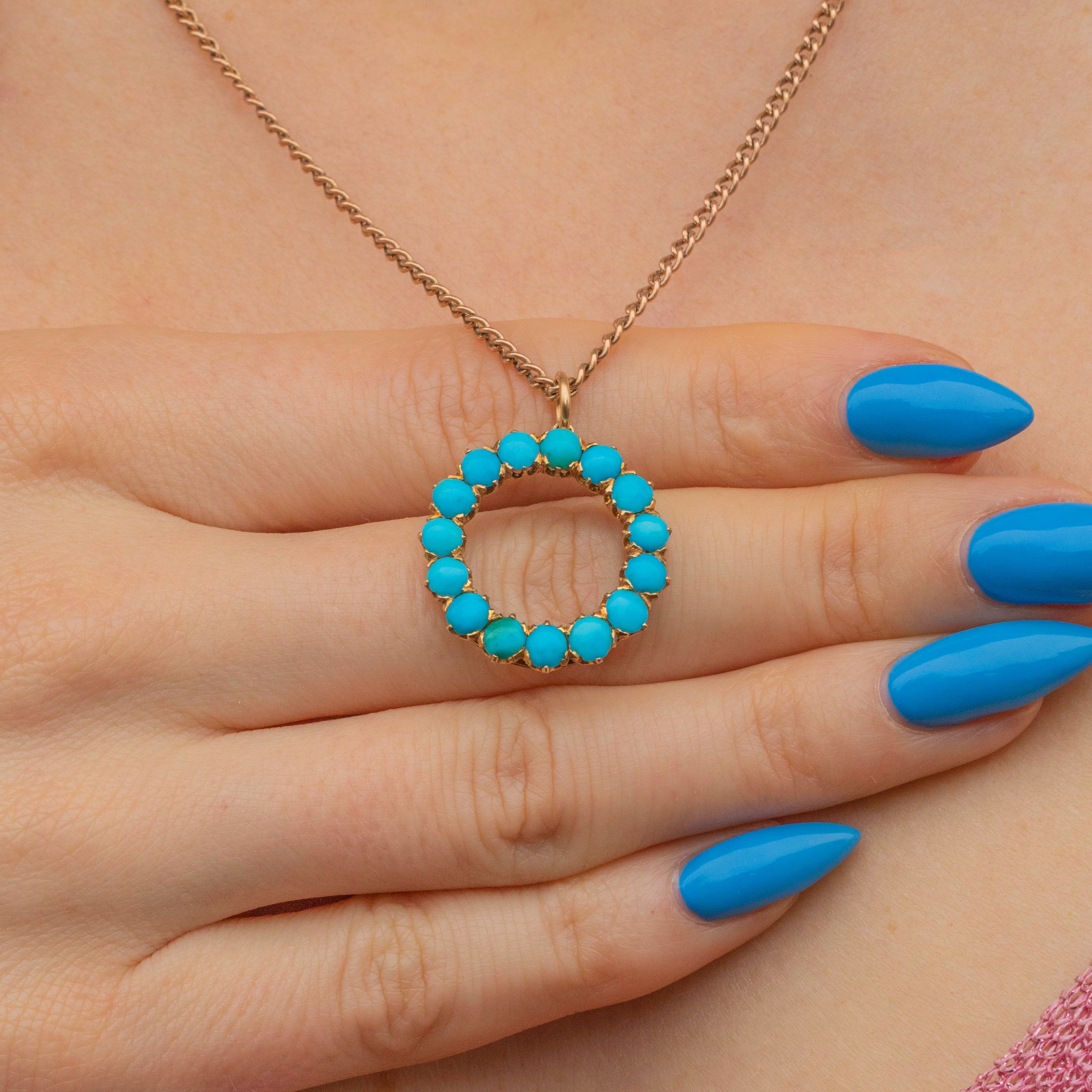 Smooth cabochon cut Turquoise sit perfectly snug in a roundel formation, each with a vivid and highly desirable Robin's egg blue hue perfectly complimented by saturated 18ct Gold. Incorporate some colour into your neck stack this October; this Victorian pendant will add a bold finishing touch!