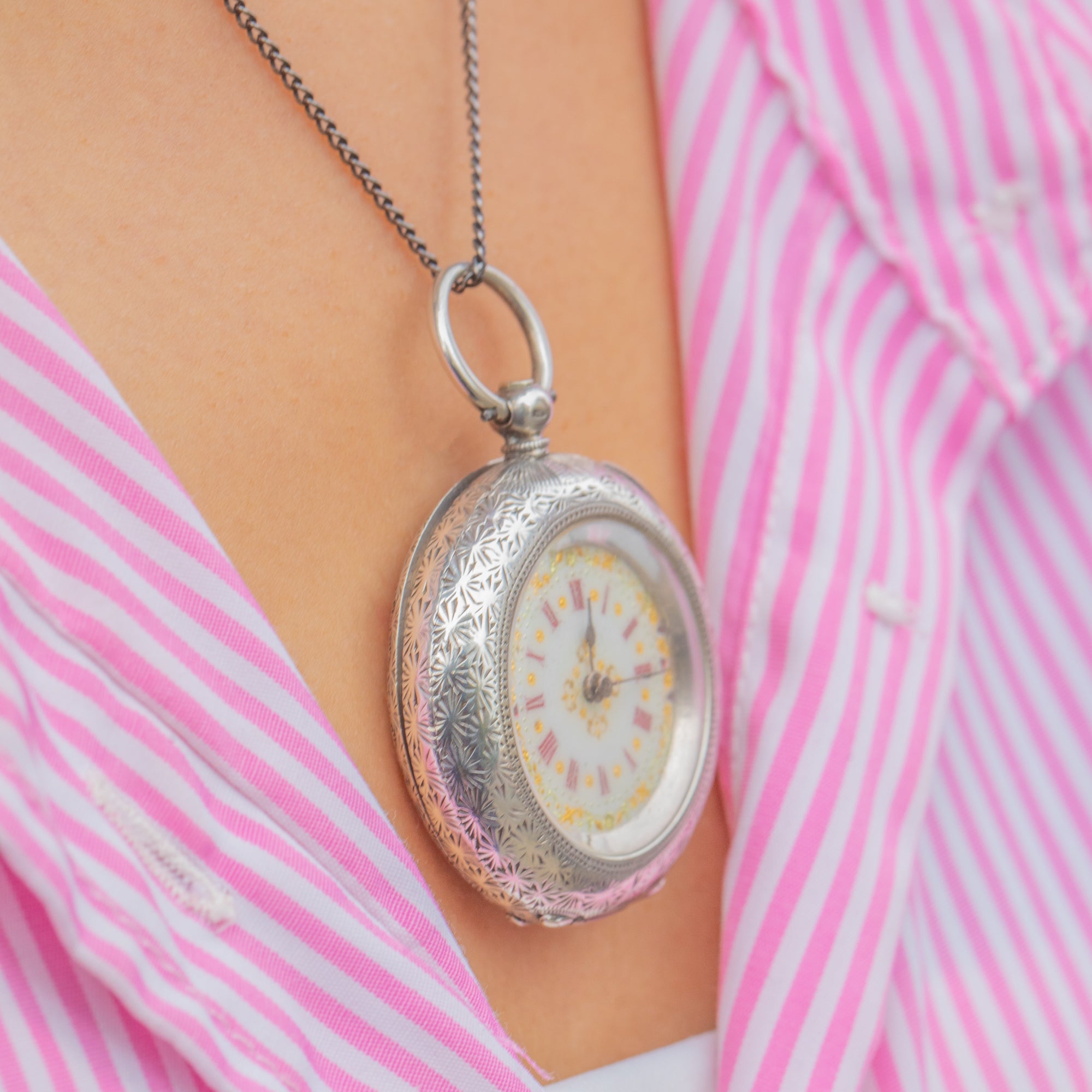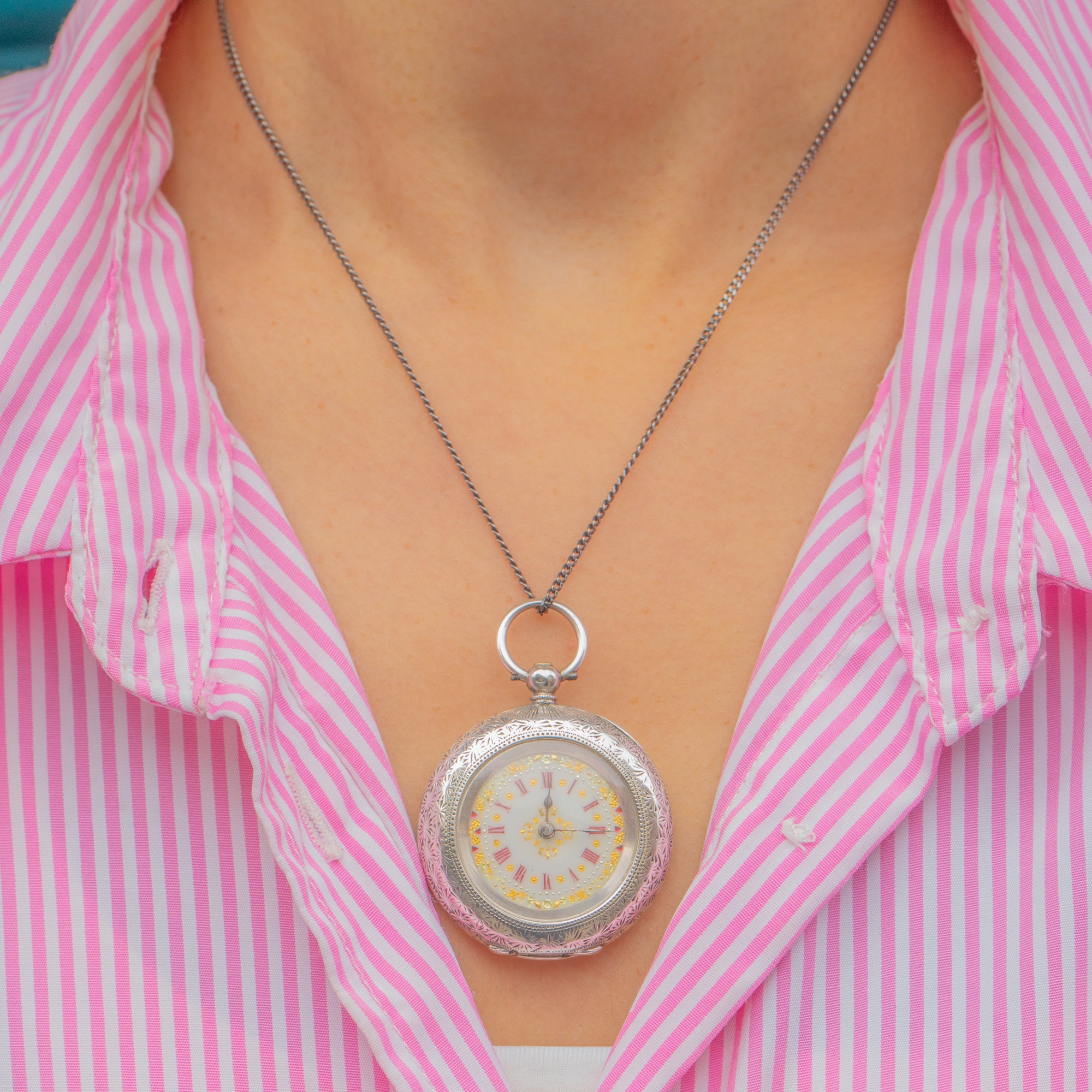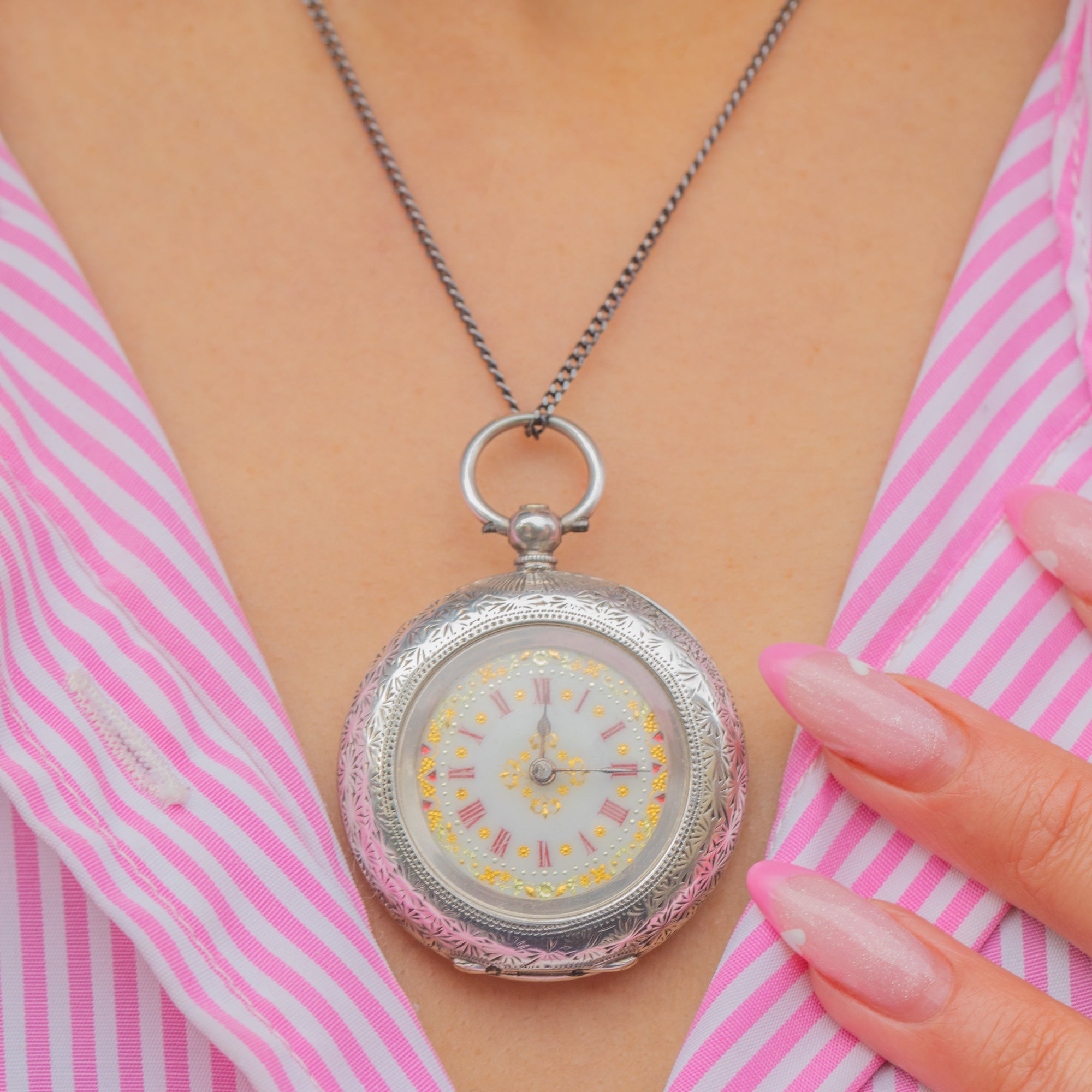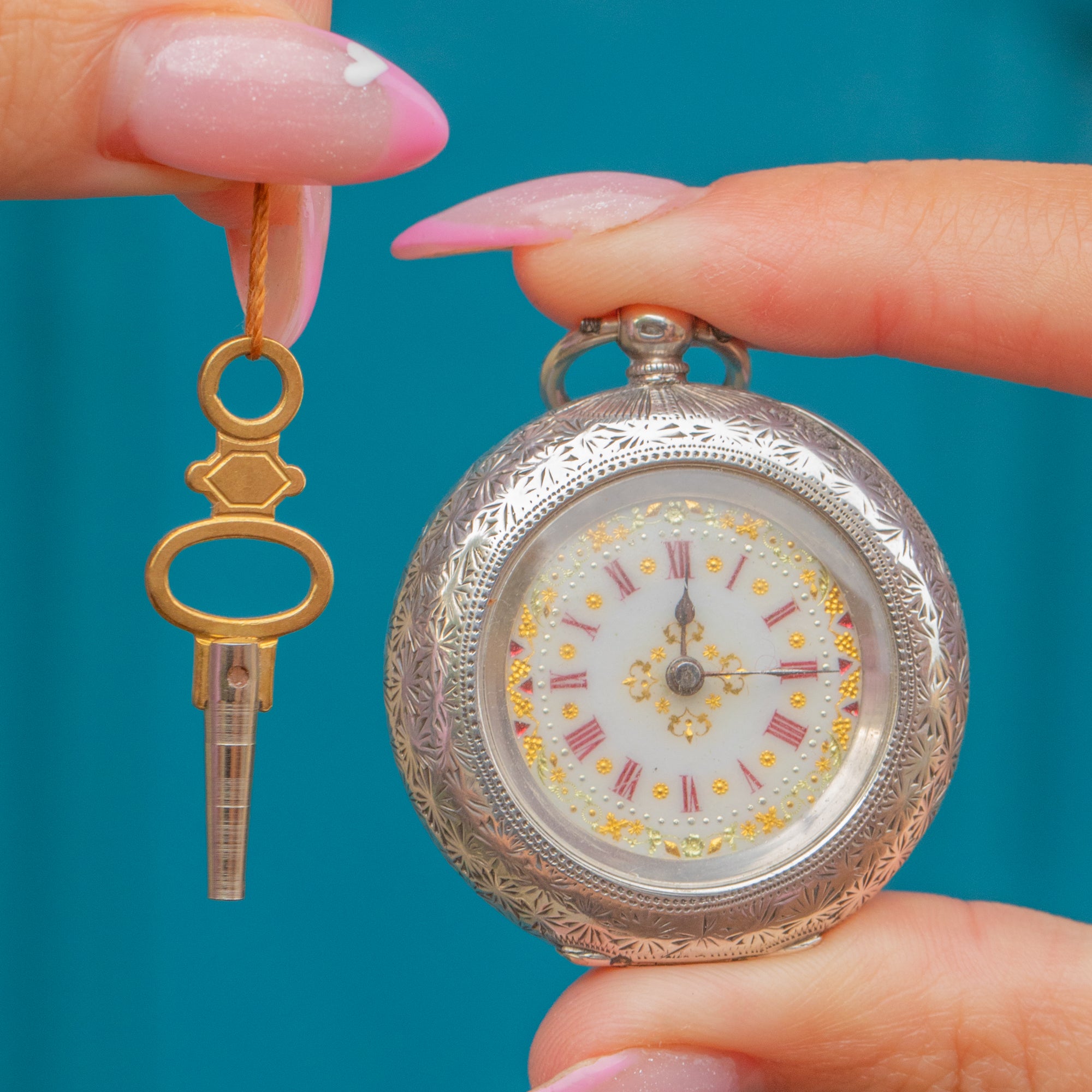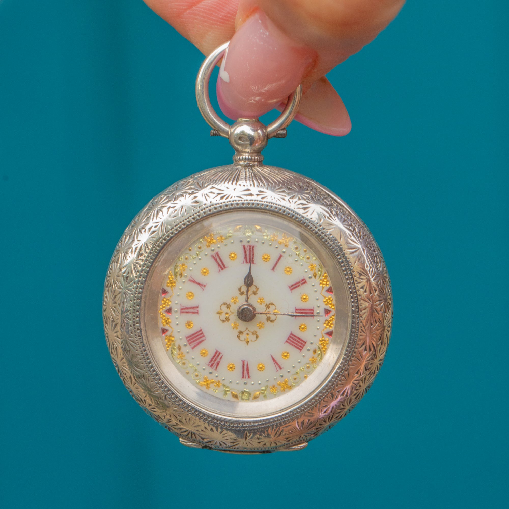 A charming Victorian pocket watch crafted in high-grade 935 Silver, showcasing exquisite Swiss craftsmanship. The intricately engraved case and beautifully detailed Enamel dial — complete with red Roman numerals, golden floral accents, and delicate hands — reflect the artistry and precision of the late 19th century.