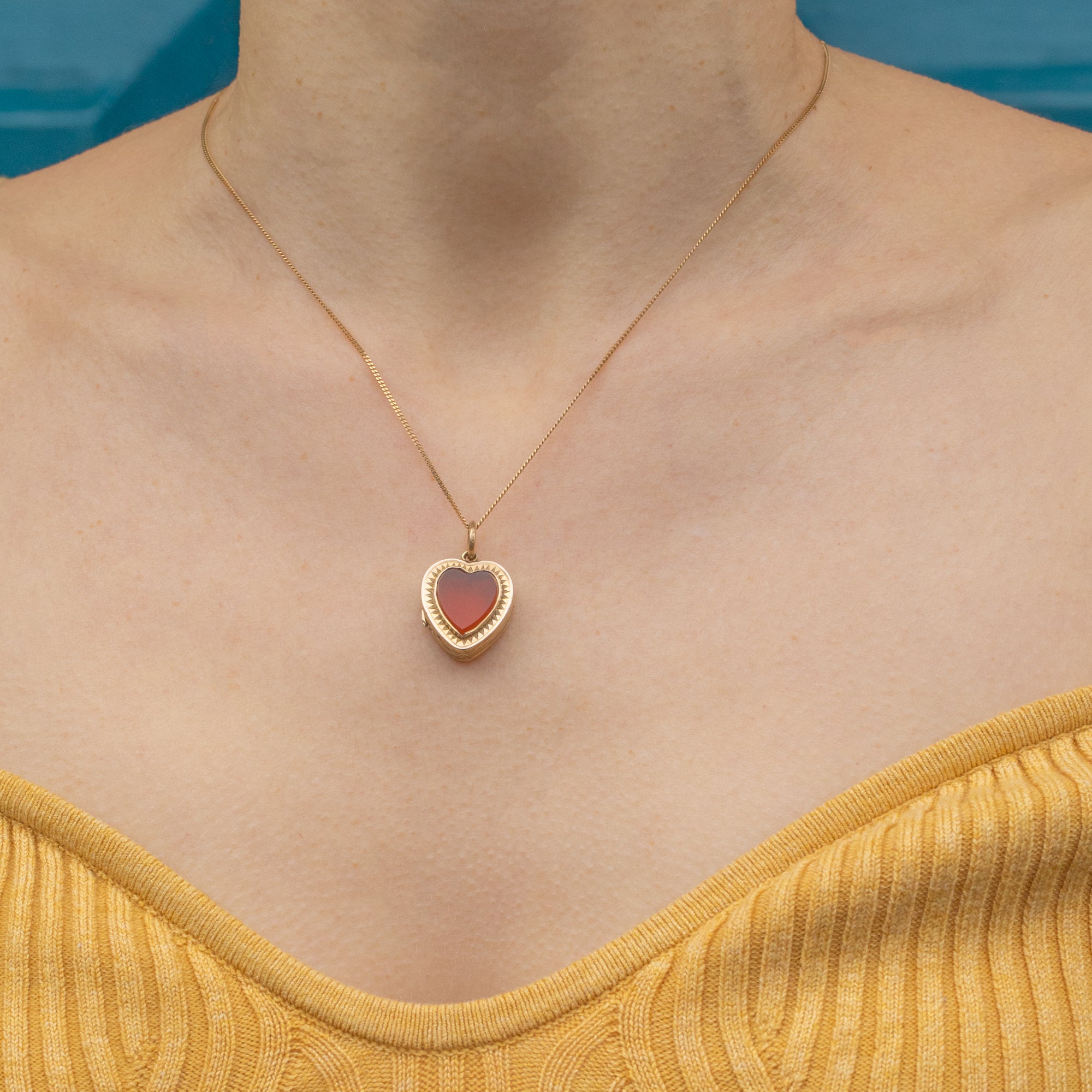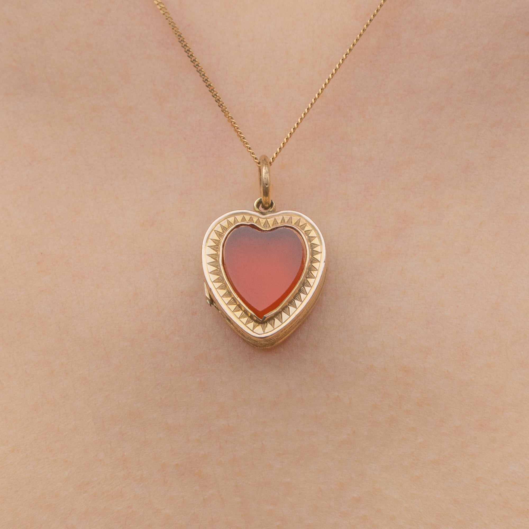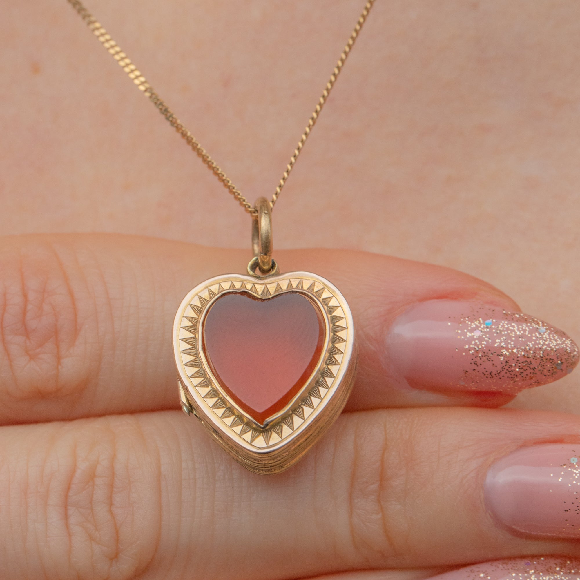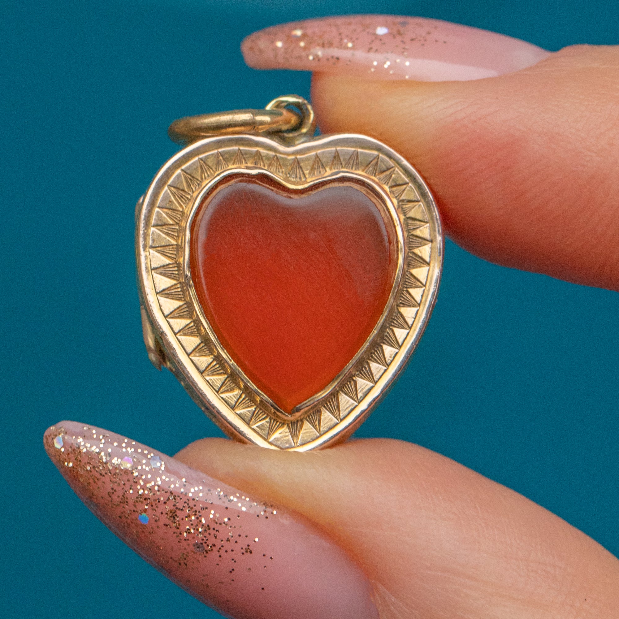 EXCELLENT: This Victorian 9ct Gold engraved Carnelian heart locket is in superb condition. Her engravings are crisp and her 9ct Gold is rich and radiant. The Carnelian is securely set, free from any chips or dings throughout. As a locket, you can wear her with confidence as she closes with a nice "click". With two frames, your photographs will be preserved and kept safe at all times!