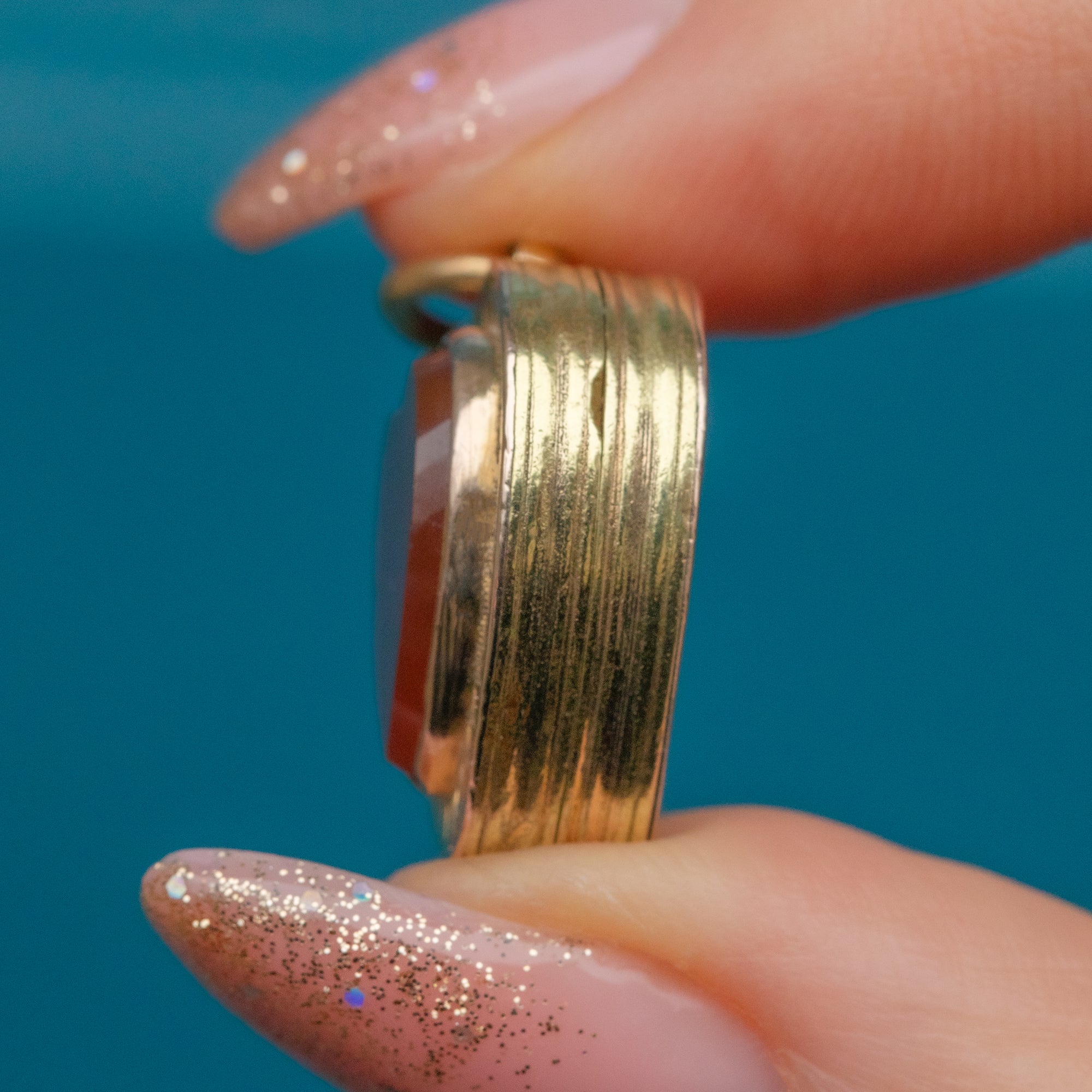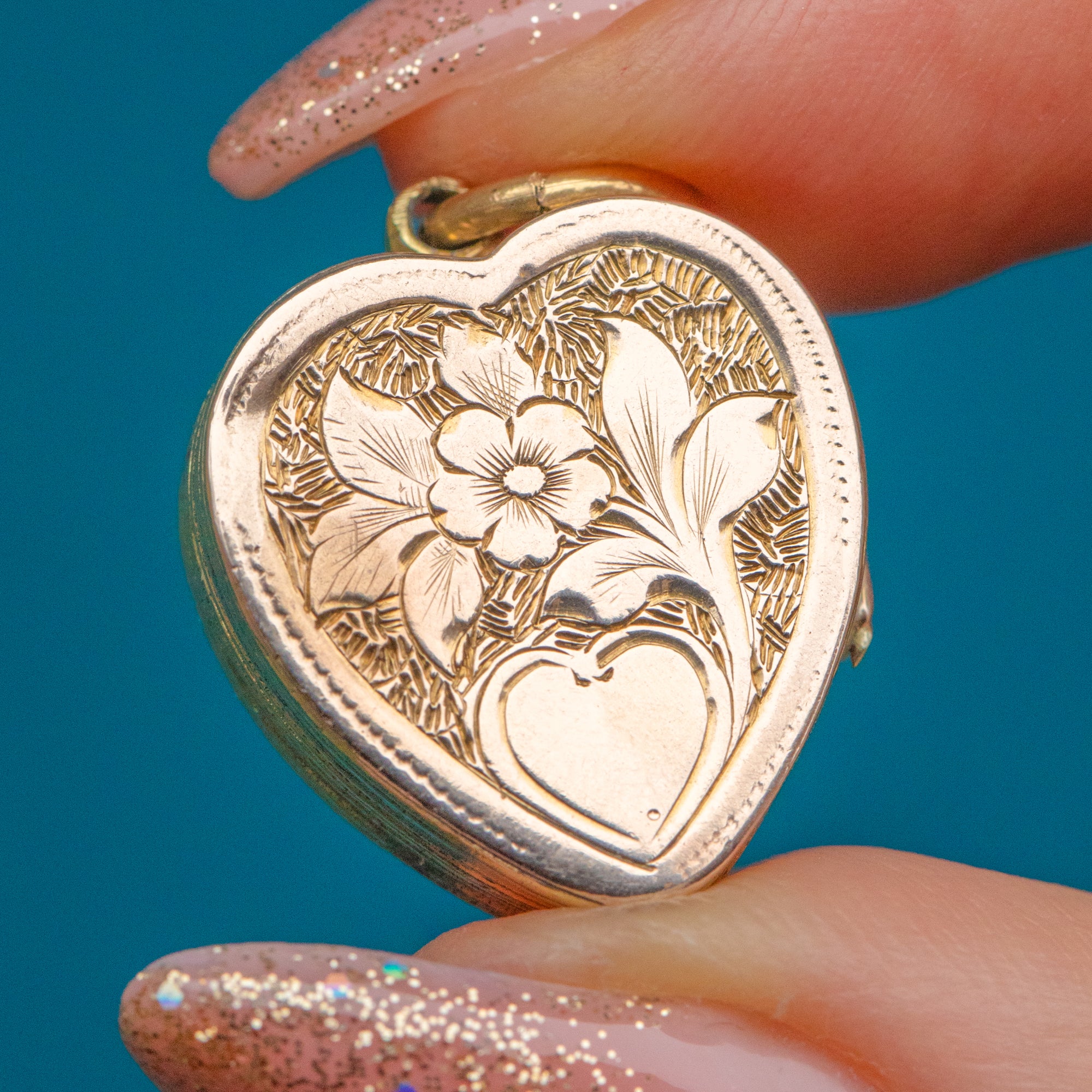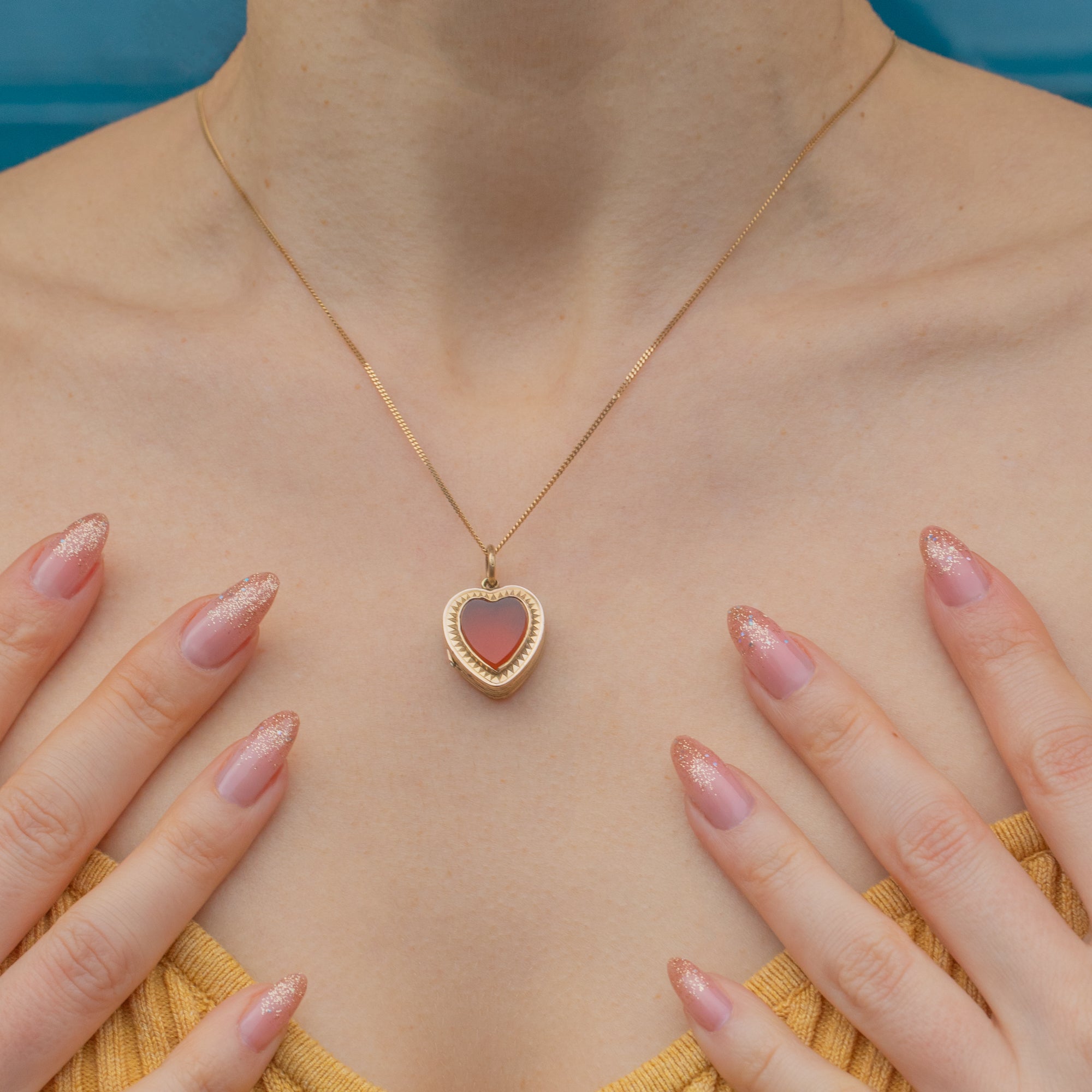This Victorian 9ct Gold engraved Carnelian heart locket is brimming with character! Intricately engraved with floral motifs on her back, this pendant features a super smooth Carnelian, boasting depth and warmth as she sits within her heart settings. Crafted from 9ct Gold, she's plump, glossy, and bursting with Victorian charm.