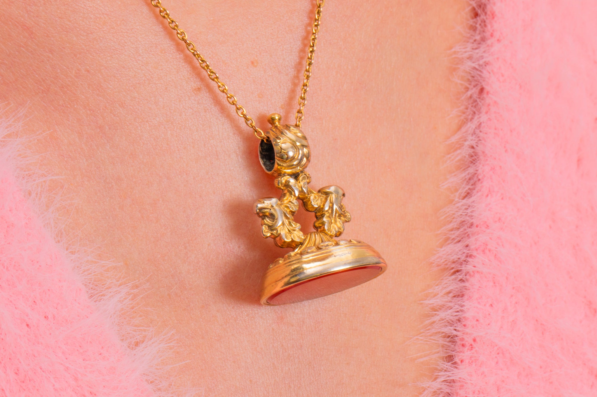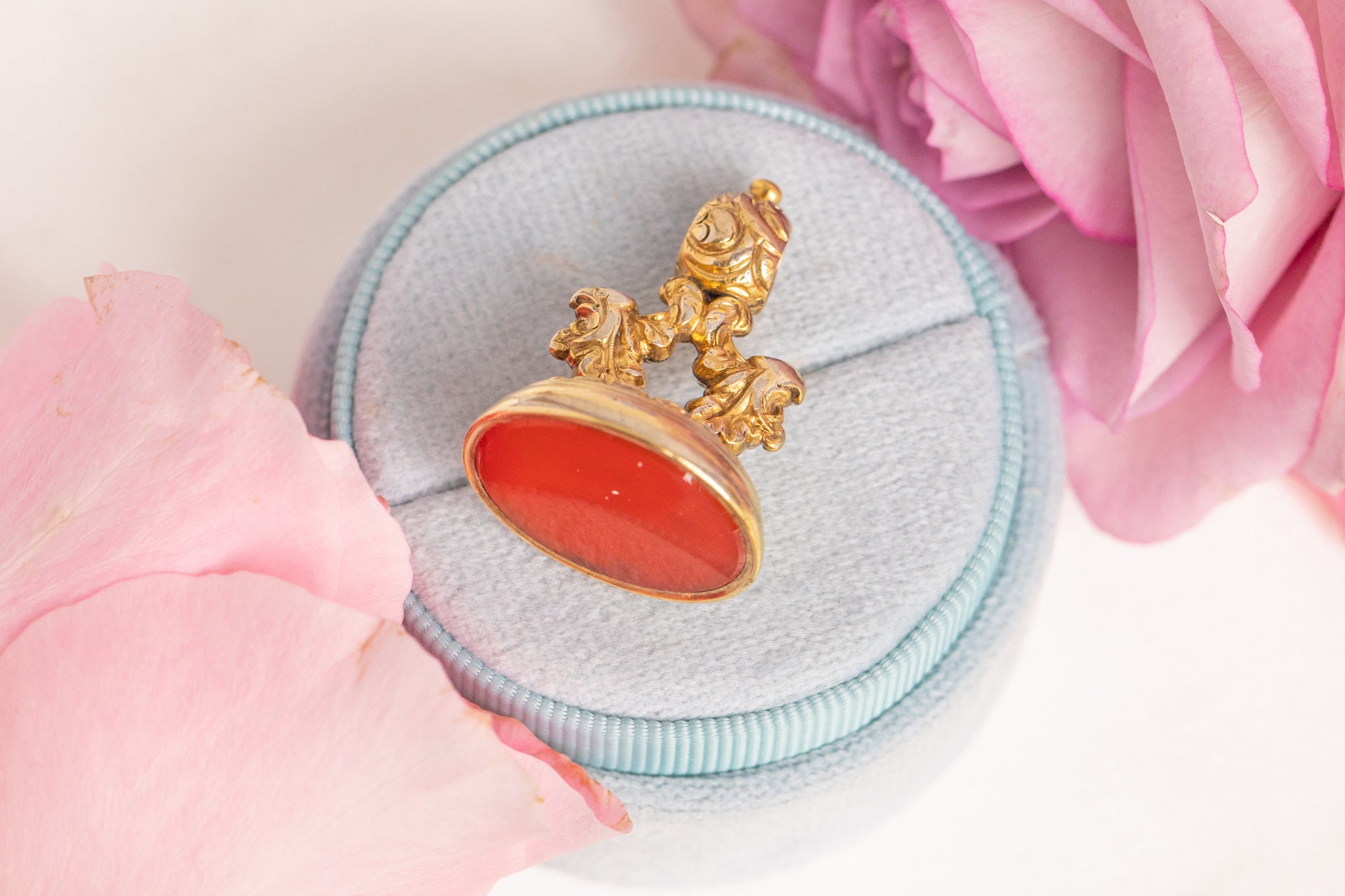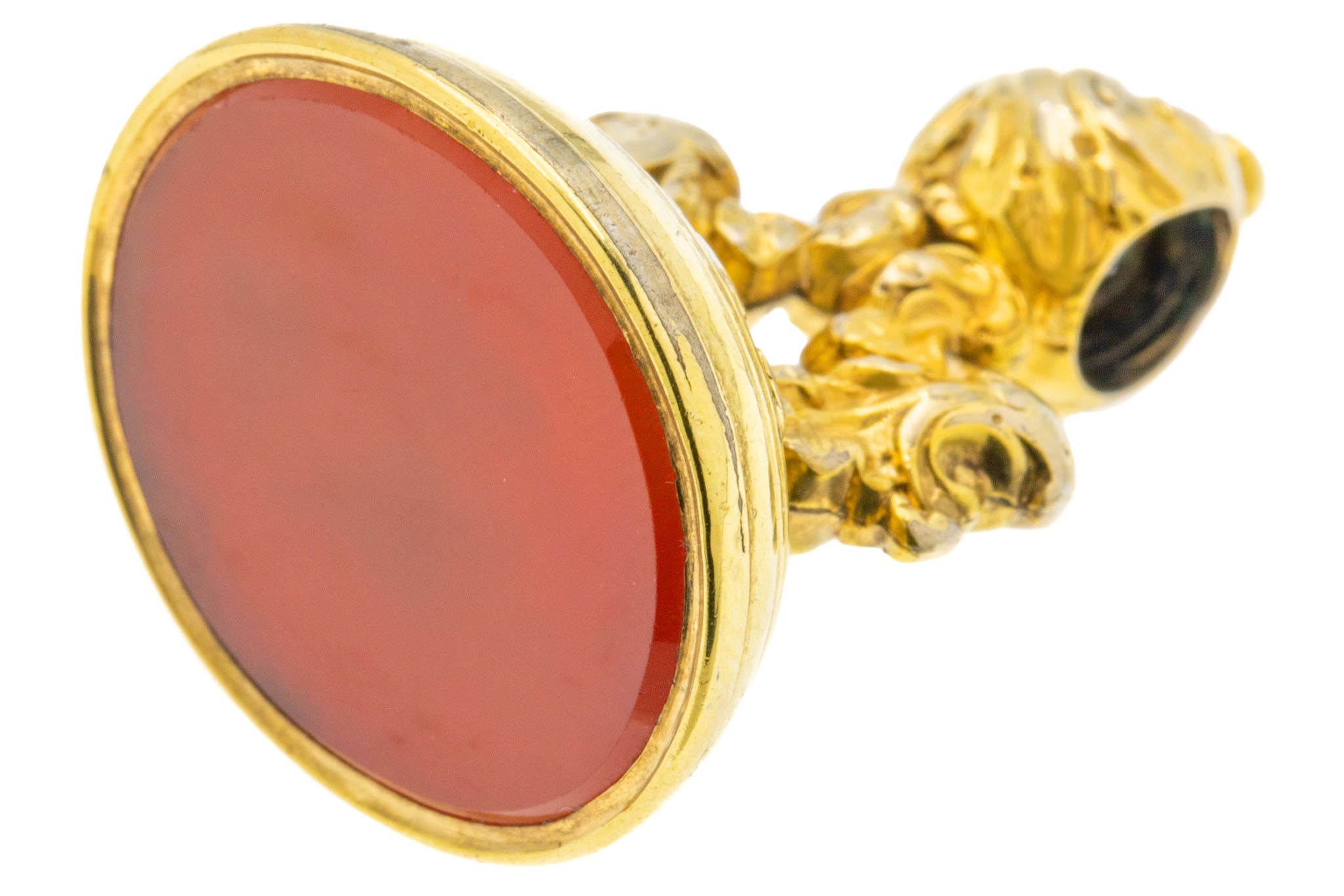 At the base of this antique Gold fob lies a smooth, burnt orange Carnelian, whose smooth surface could even be personalised with your very own intaglio.