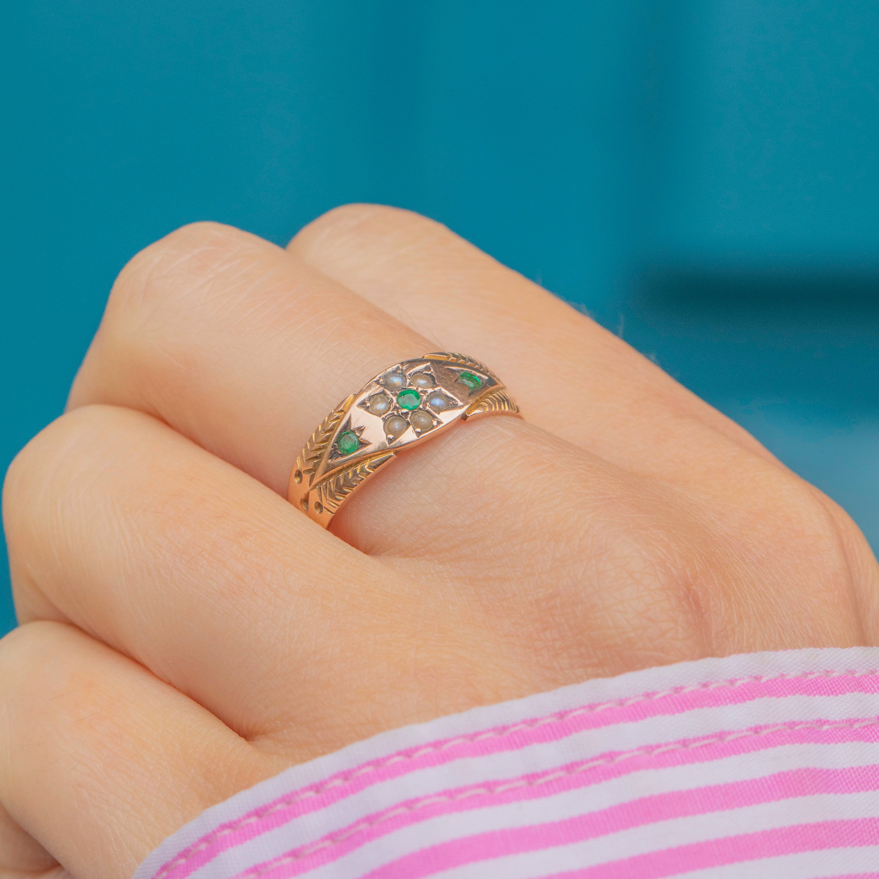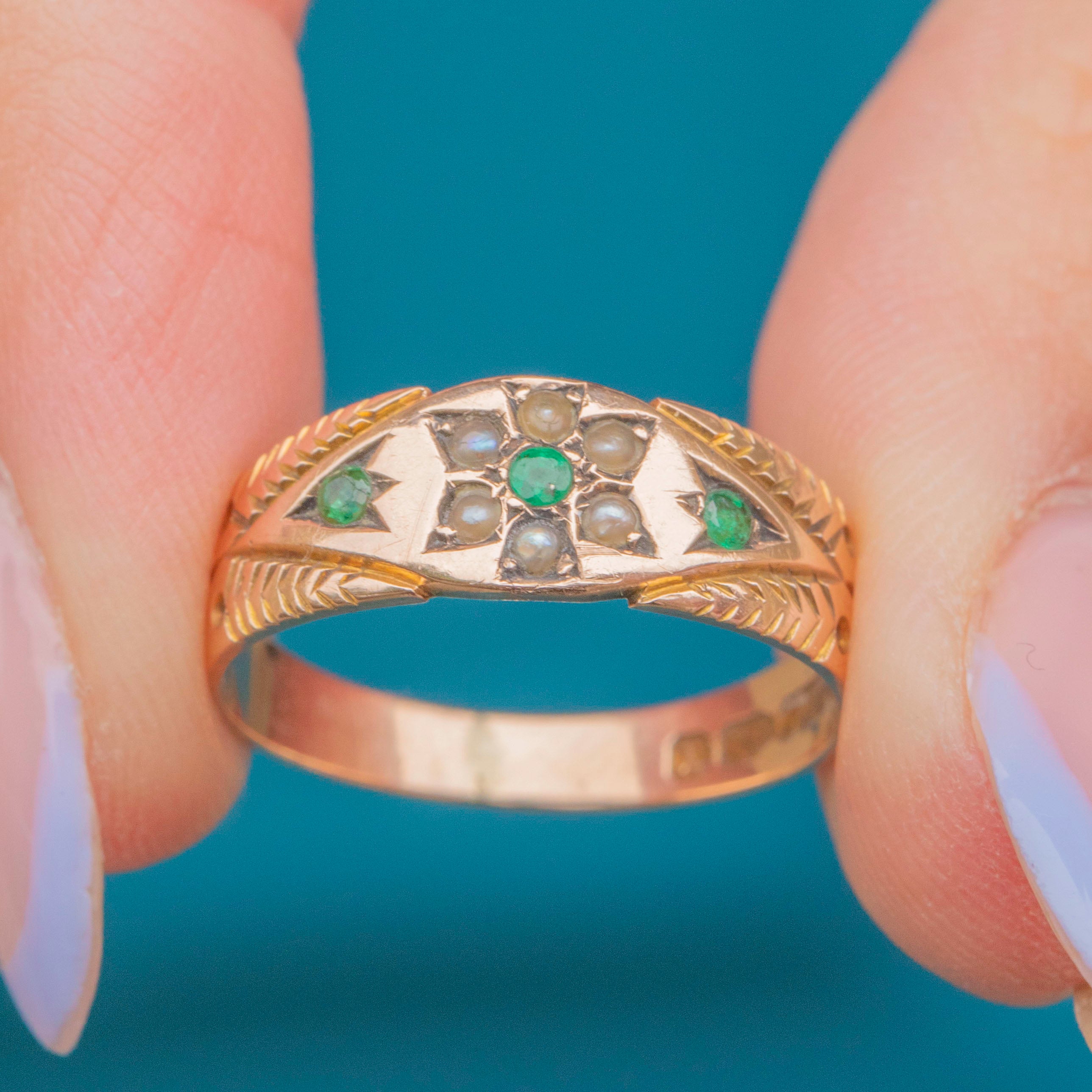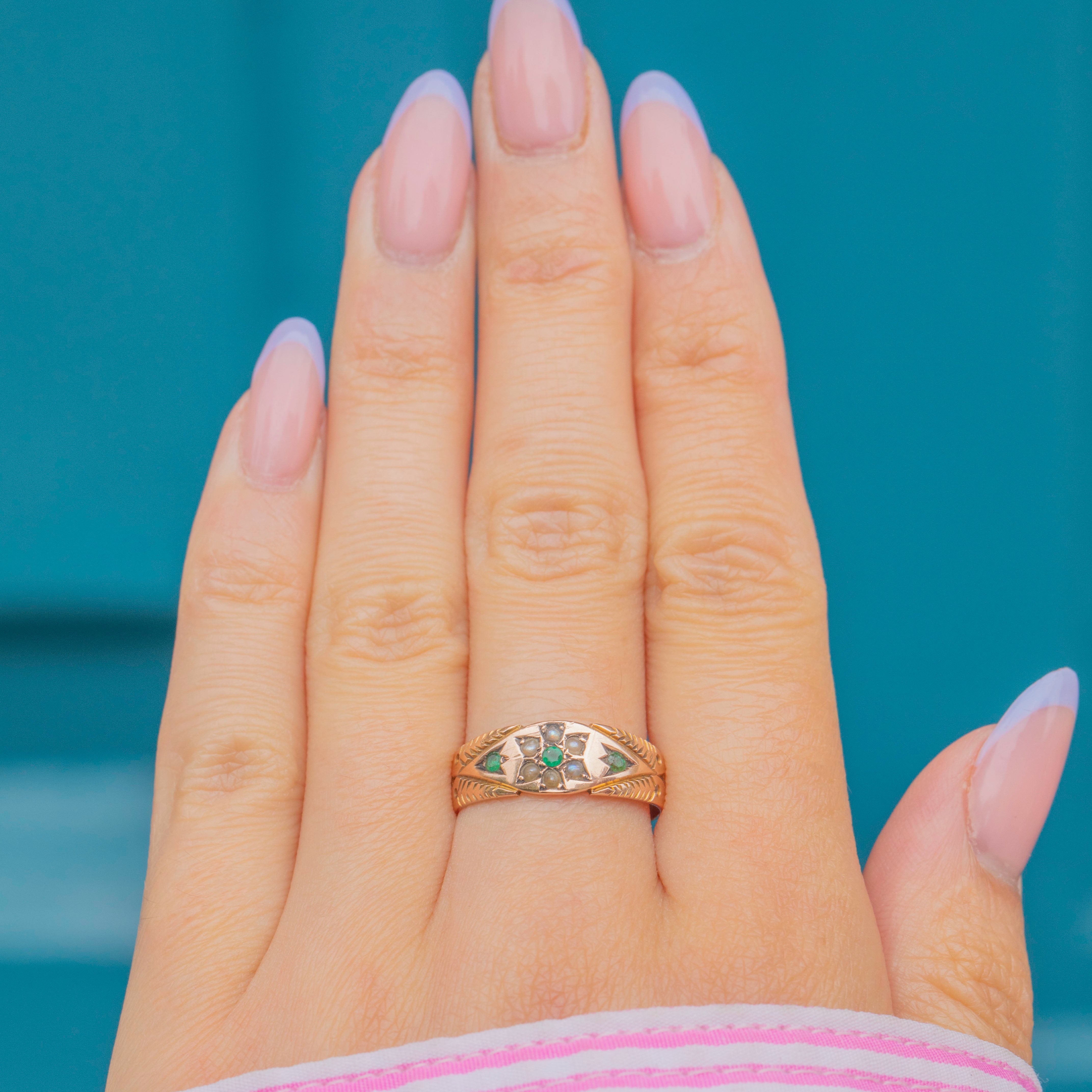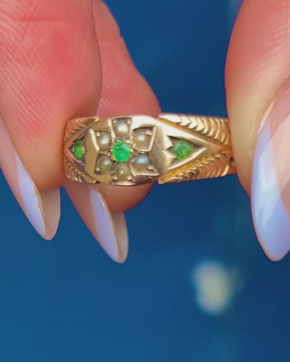 Victorian 9ct Gold Emerald Pearl Flower Gypsy Ring, c.1897