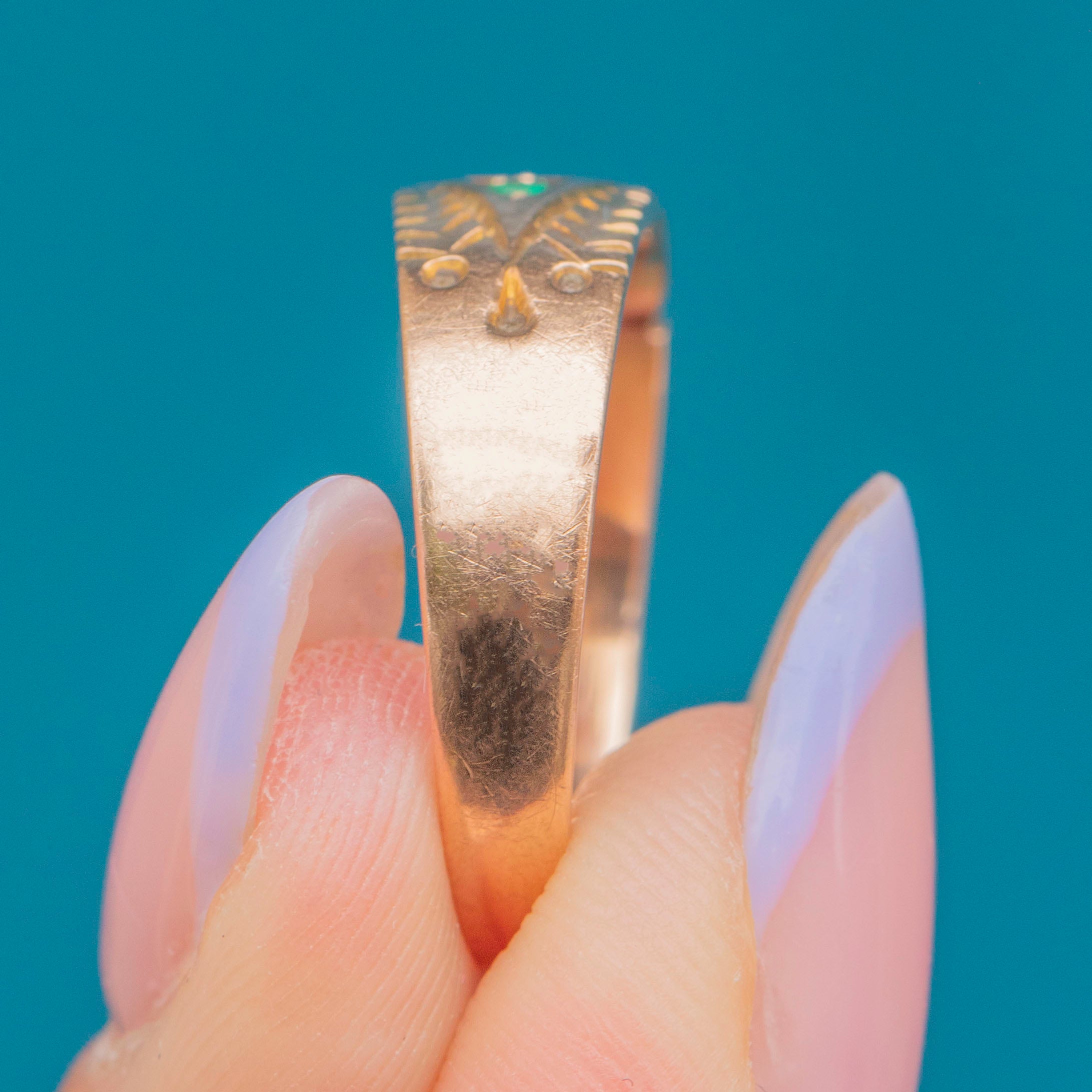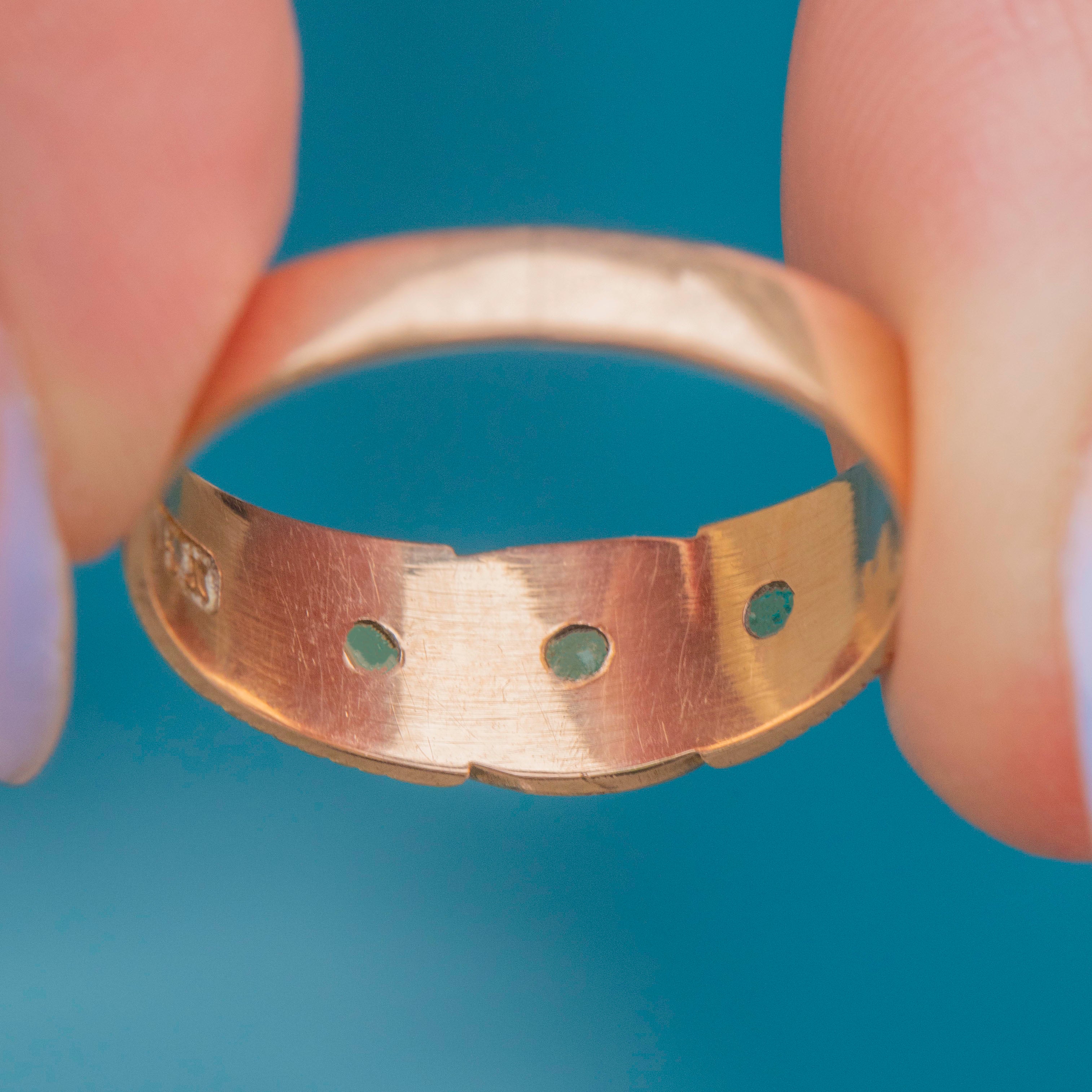 VERY GOOD: This Victorian 9ct Gold Emerald Pearl Flower Gypsy Ring is in wonderful condition throughout. The Gold is glossy and the engraved details have all remained crisp, with clear hallmarks inside the band. There is a visible resize at the back of the ring, which cannot be seen while the ring is worn and does not impact its integrity. The gemstones are all securely set and show no signs of wear. With plenty of life left to give, this Victorian gypsy ring will make a spectacular addition to your collection!