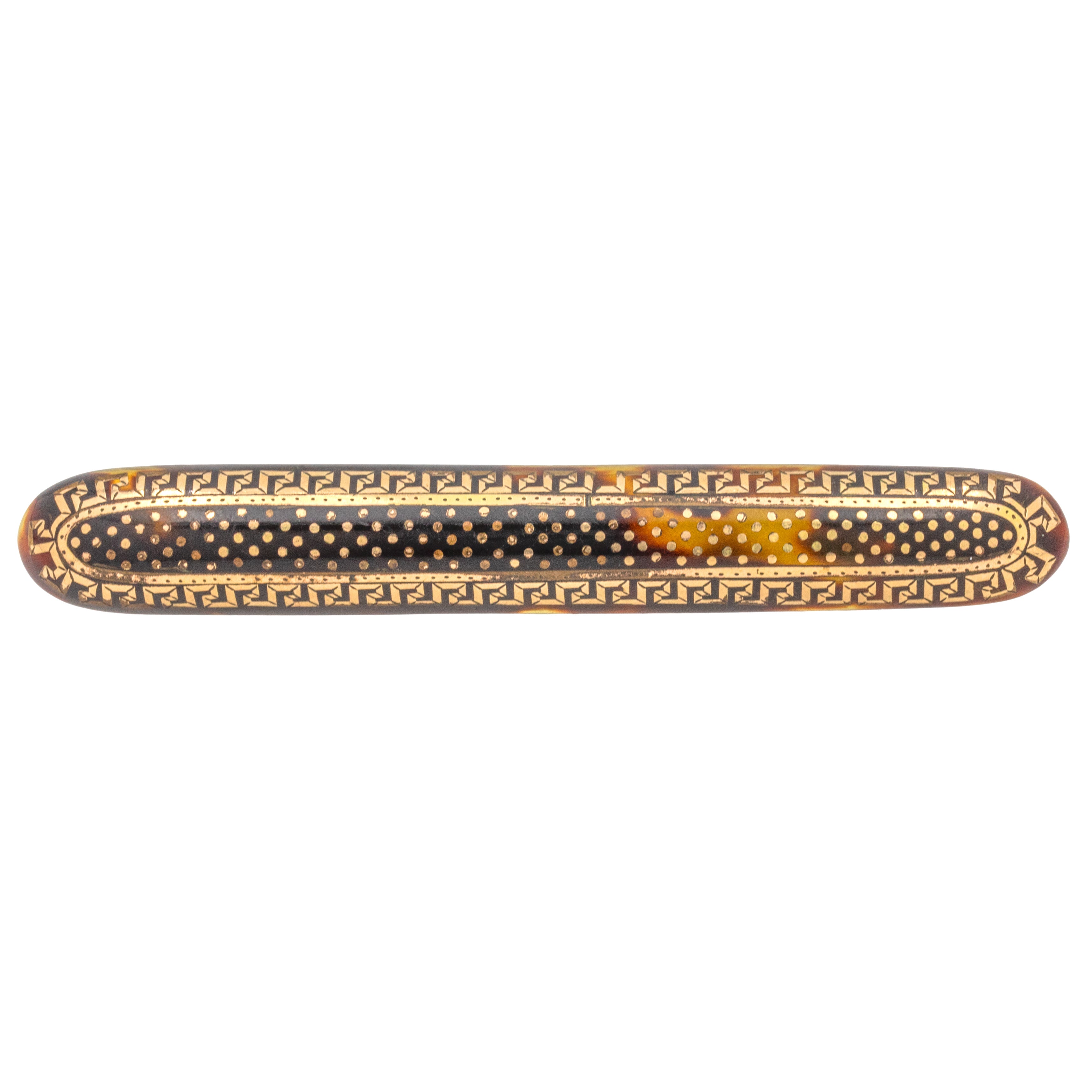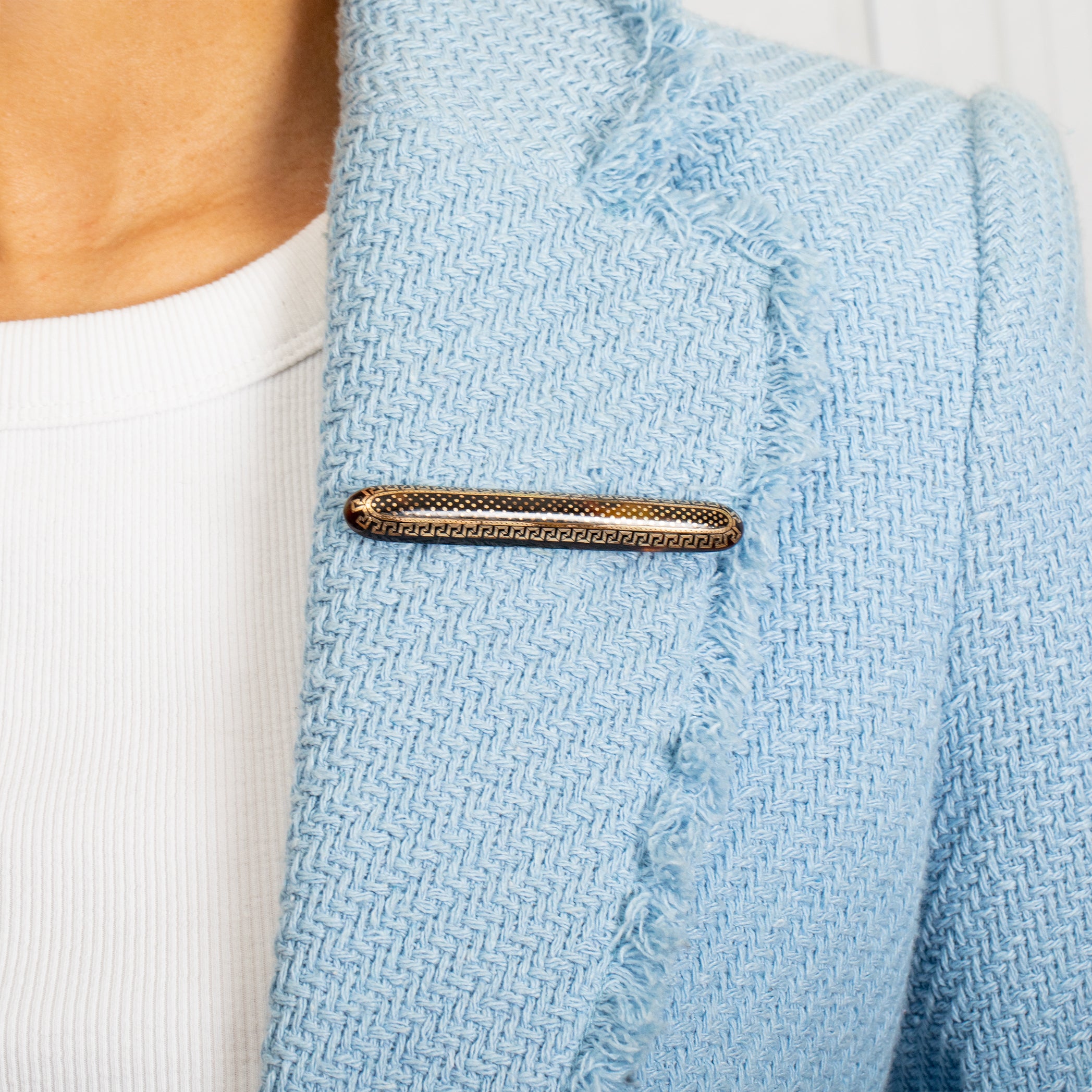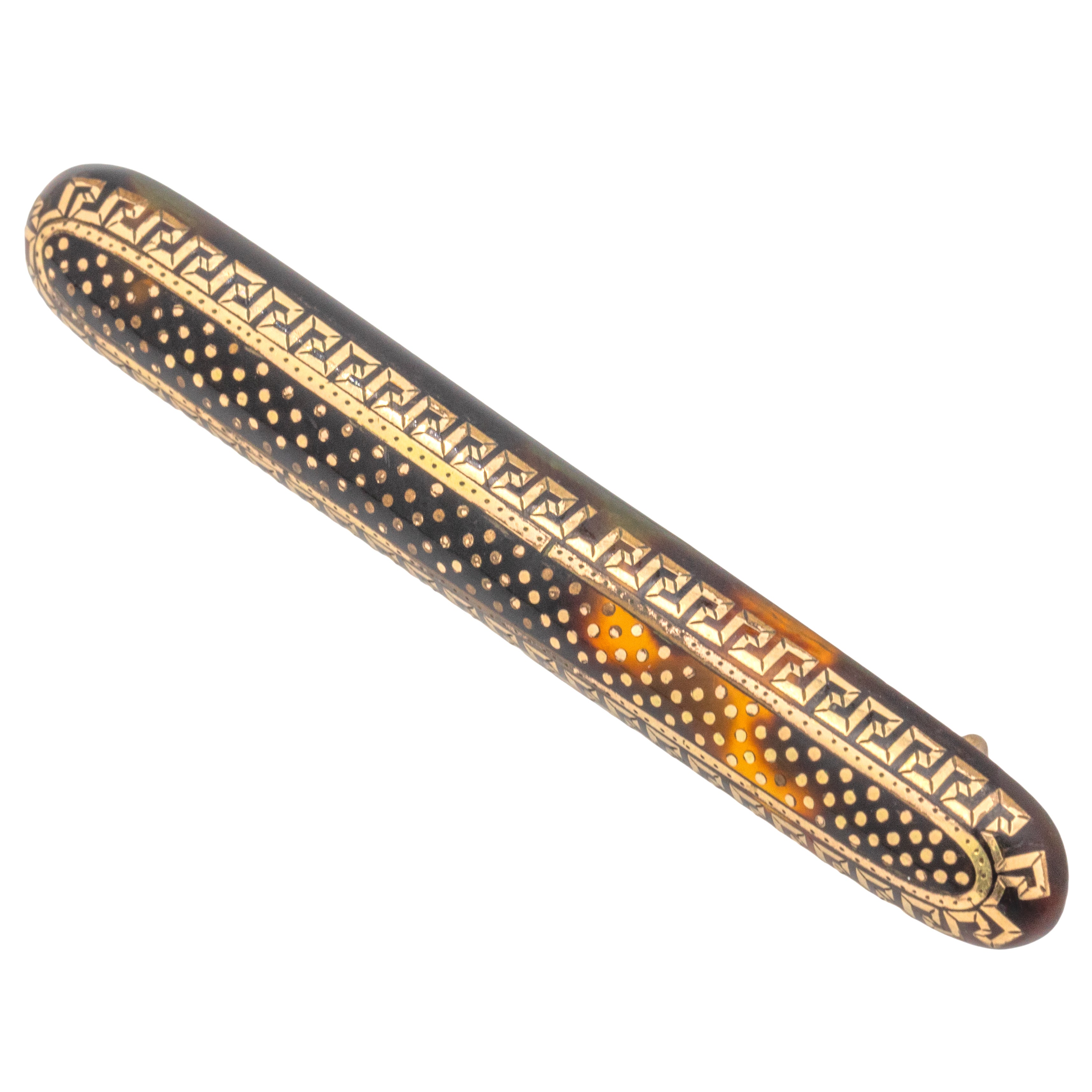 This Victorian Pique brooch is rich in historical beauty. Her slender form displays marbling chocolate hues, acting as the backdrop for her Gold polka dot detailing encased in a decorative Greek key design border.