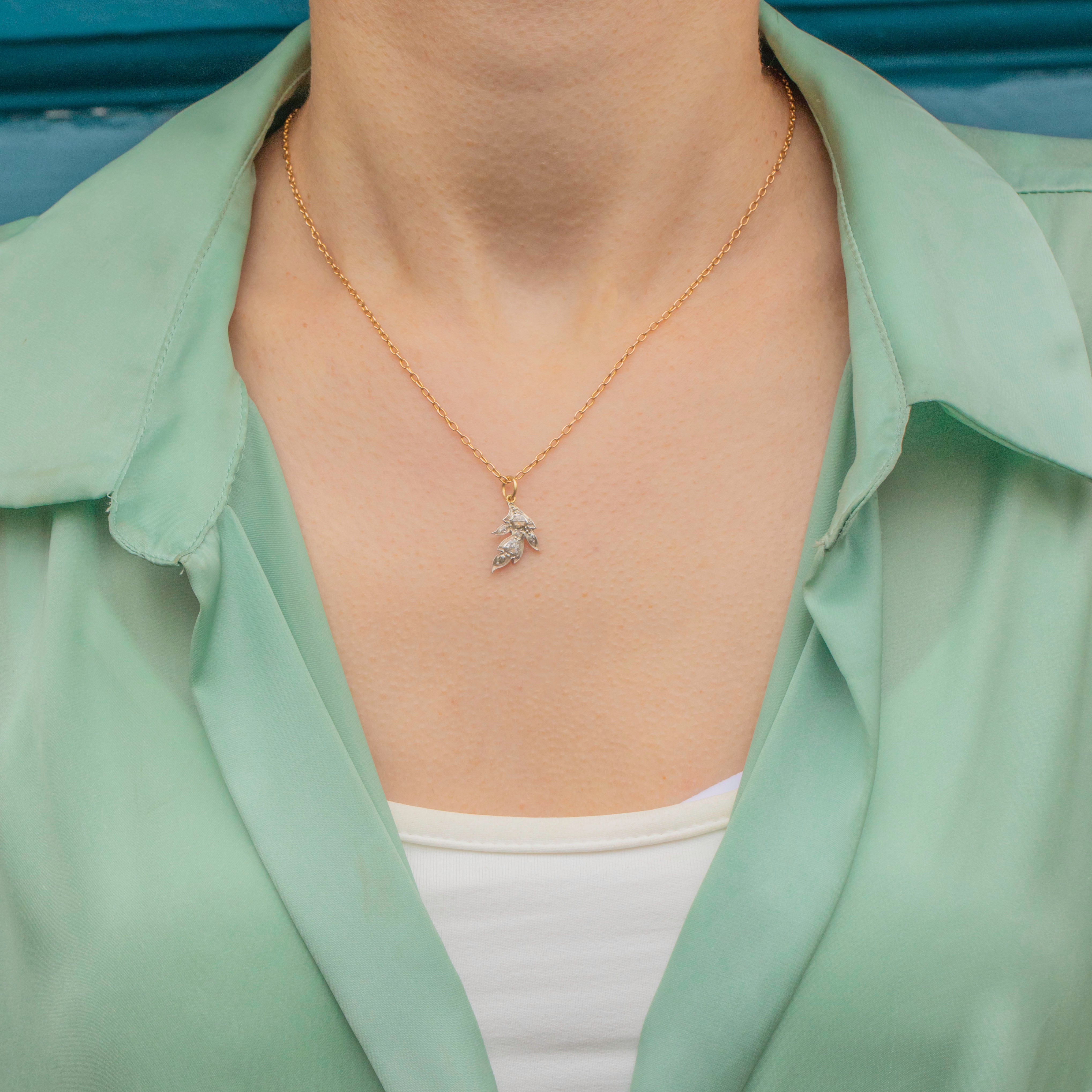 A dainty piece, this whimsical pendant boasts six scintillating rose-cut Diamonds set in a quintessential Victorian leaf motif. Each Diamond is displayed within glossy Silver settings, backed with warm 18ct Gold.