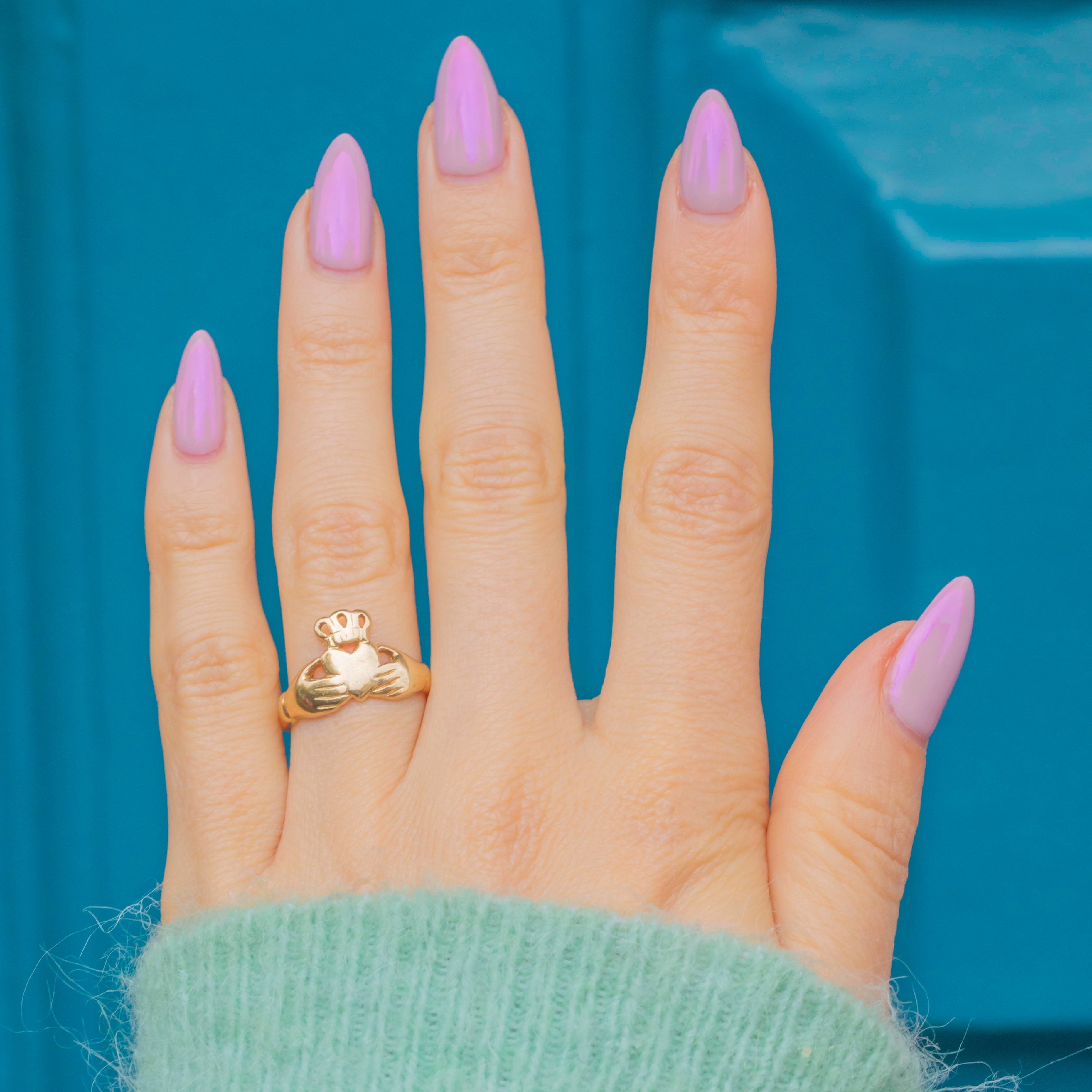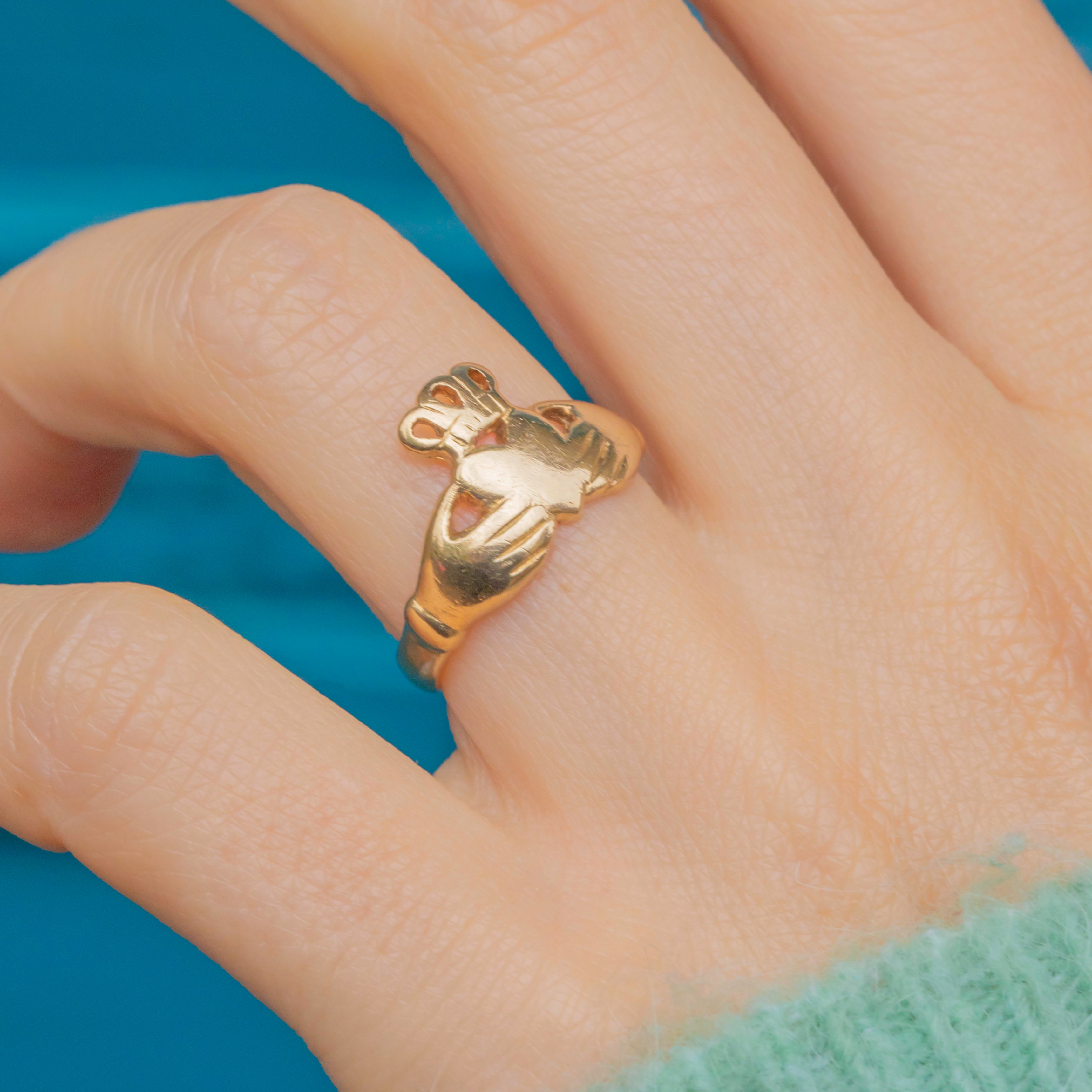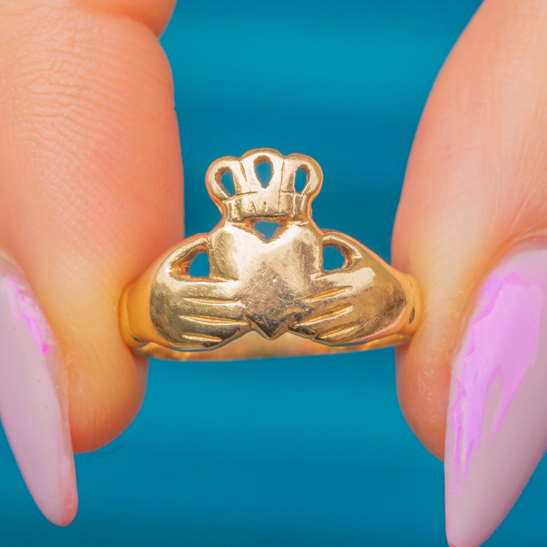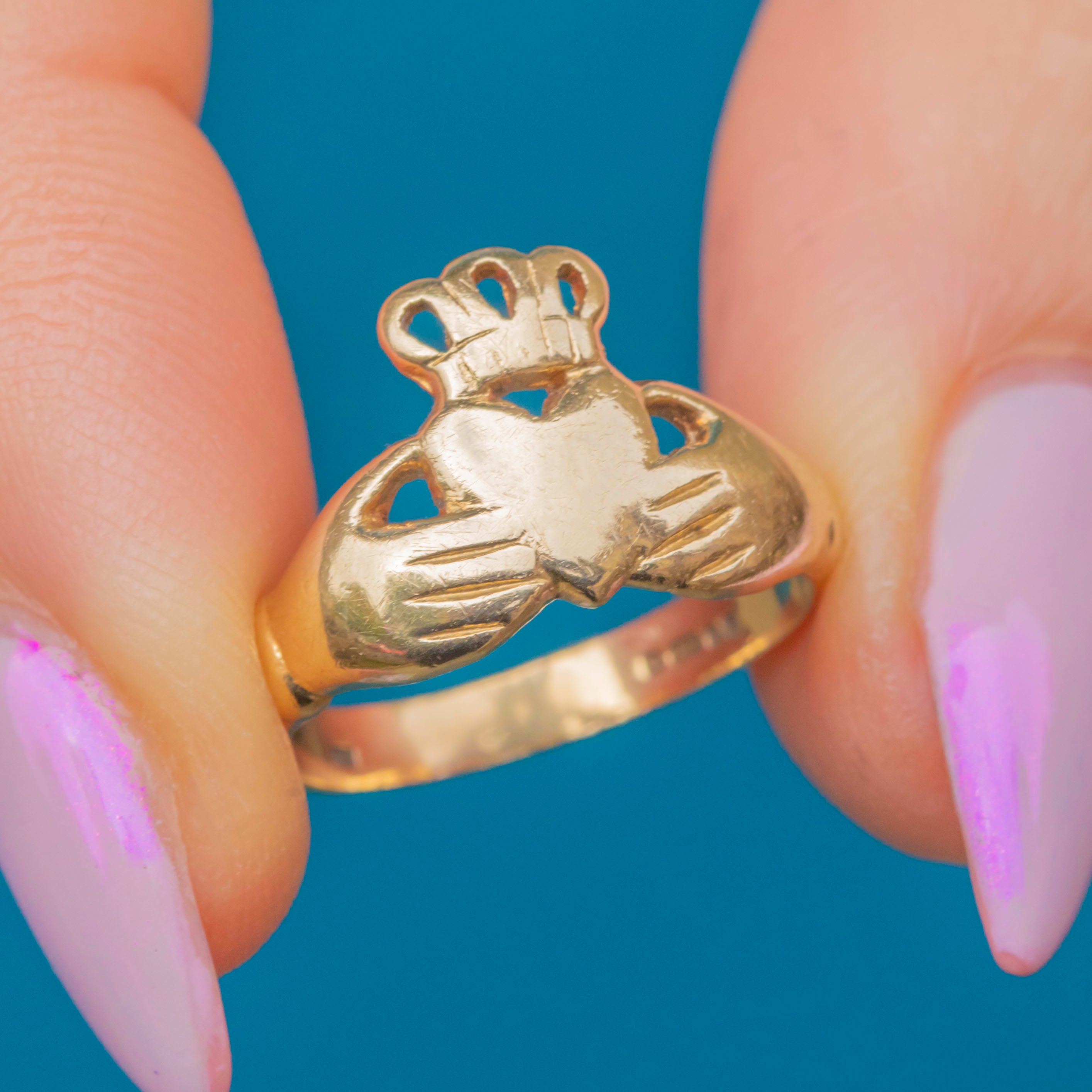 This traditional Claddagh ring is crafted in solid 9ct Gold, featuring the classic motif of two hands clasping a crowned heart, a timeless Irish symbol of love, loyalty and friendship. Beautifully made and richly polished, this vintage piece carries both sentiment and style.