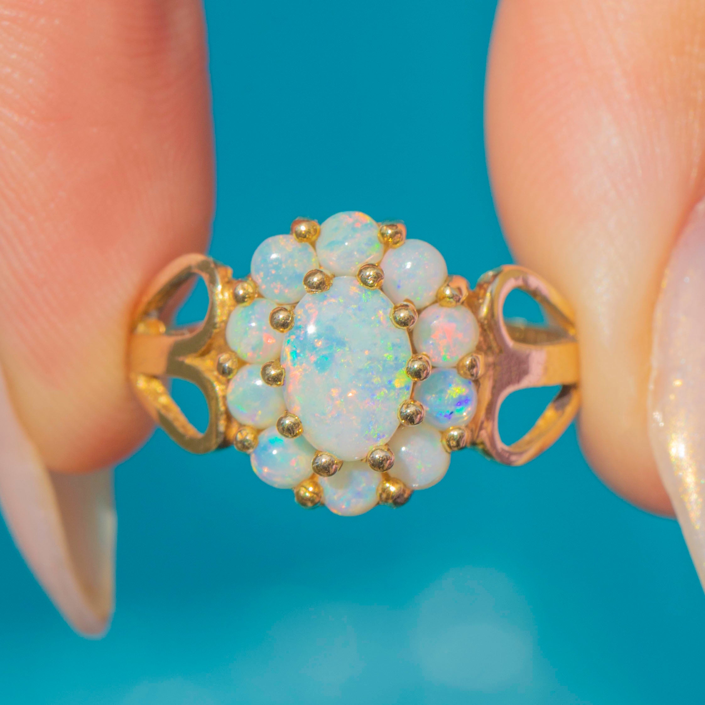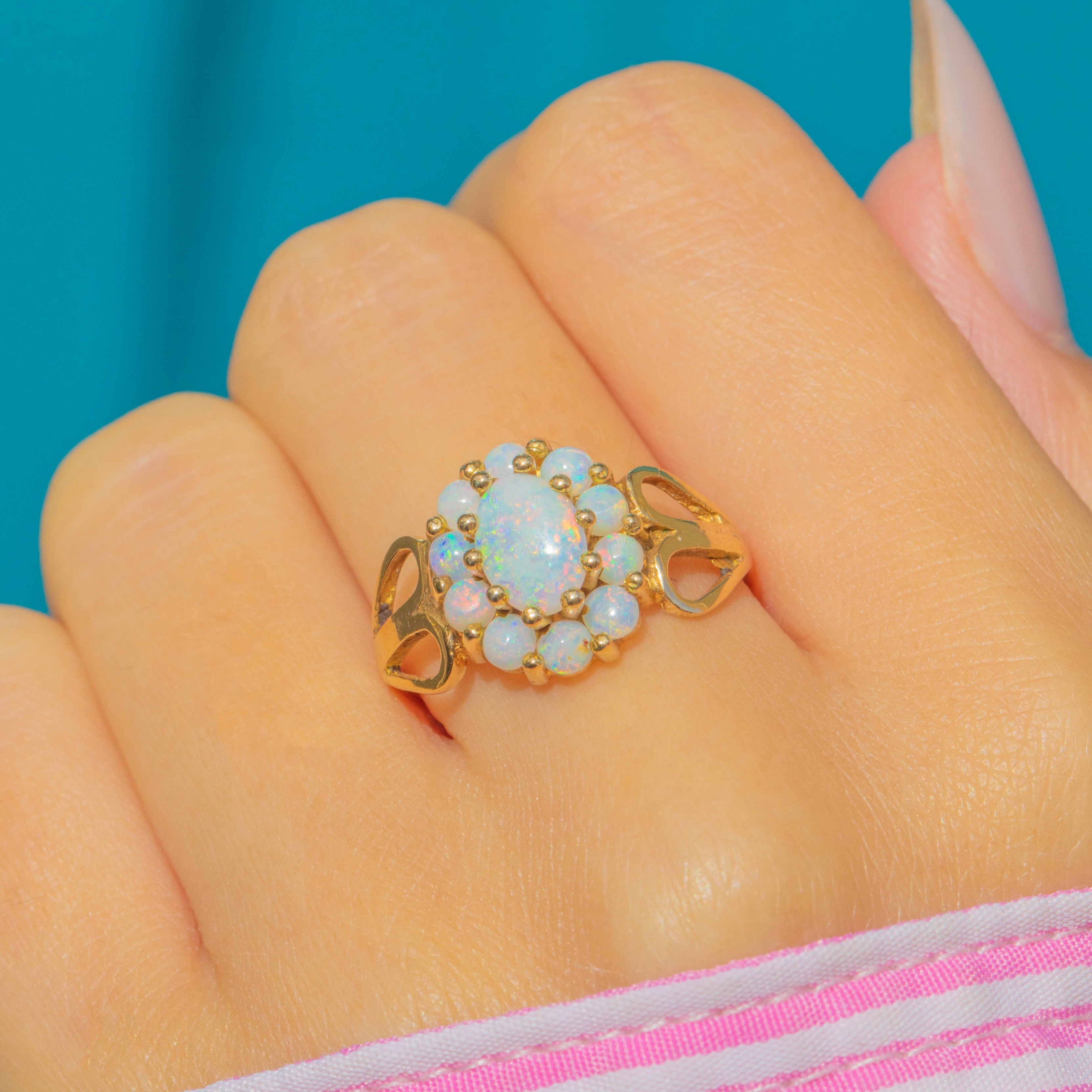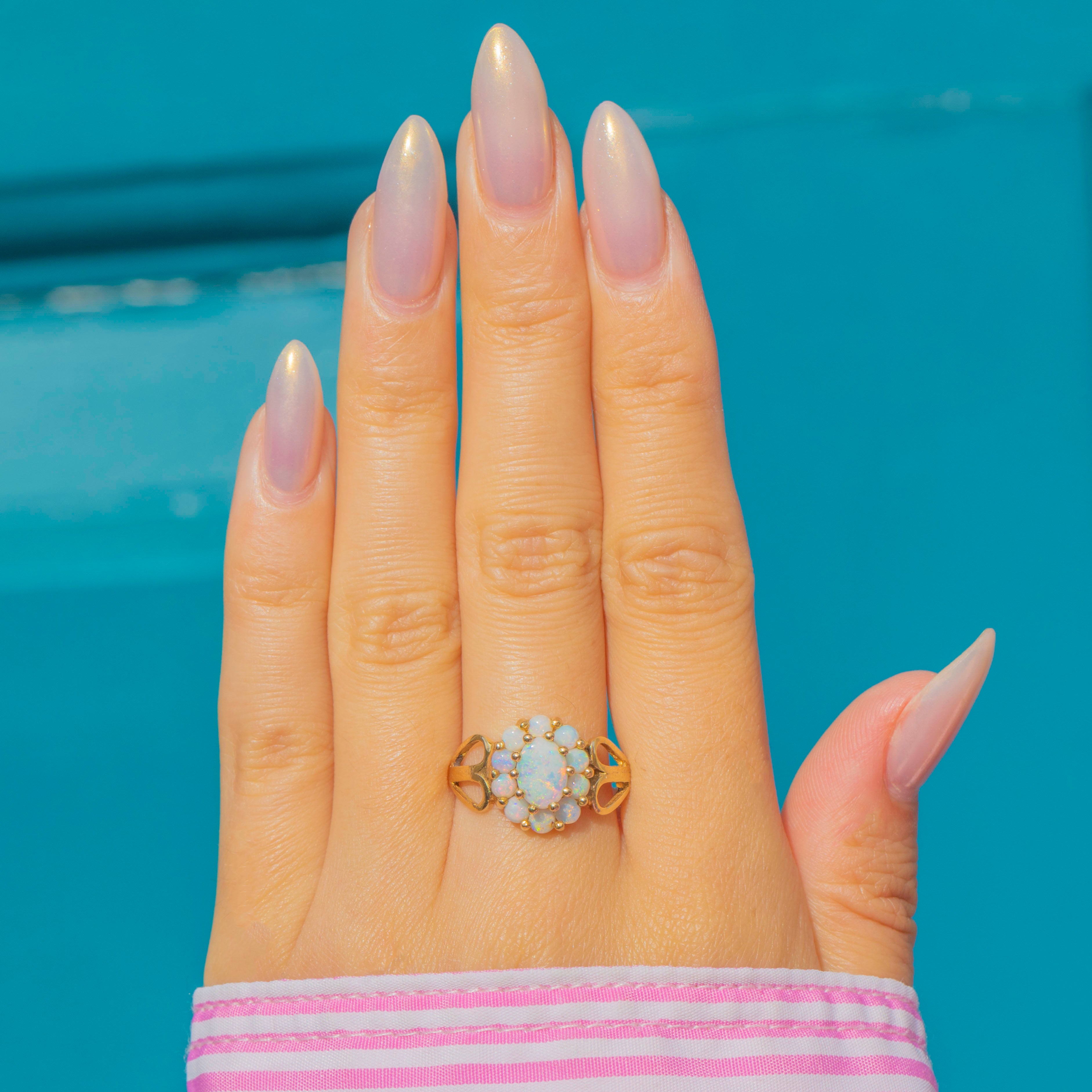 This Vintage 1990s cluster ring is set with a glowing array of natural Opals, shimmering with pastel pinks, blues, indigos and lively flashes of bright green. The oval centre stone is framed by a neat halo of ten smaller Opals, creating a colourful floral effect that’s both playful and elegant. The petal-shaped shoulders add extra detail to the design, while the warm 9ct Gold setting enhances the Opals’ rainbow play of colour.