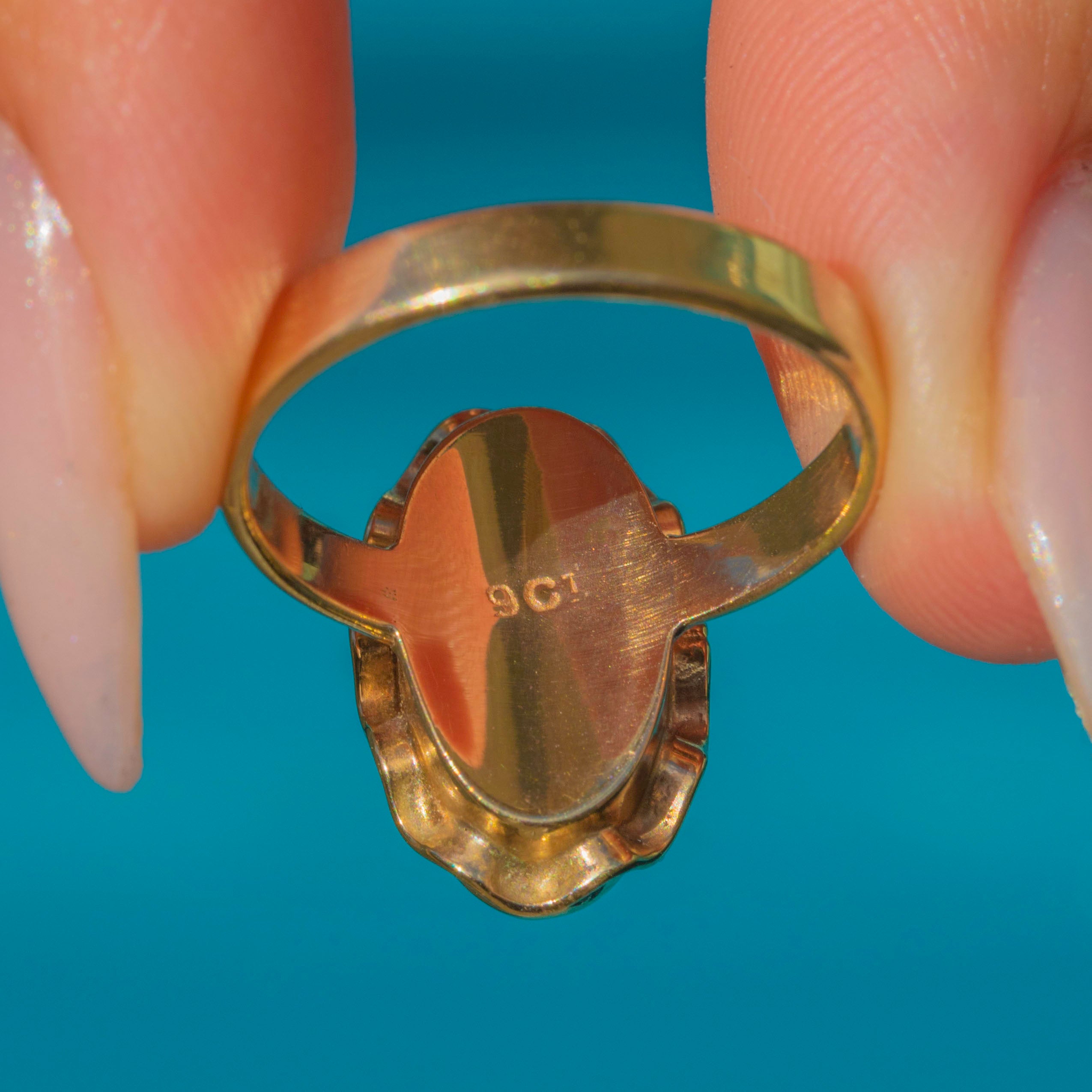 A Vintage Opal triplet ring in 9ct Gold, featuring a striking elongated cabochon with vivid flashes of colour. The Opals shimmering play-of-colour is enhanced by the protective triplet construction.