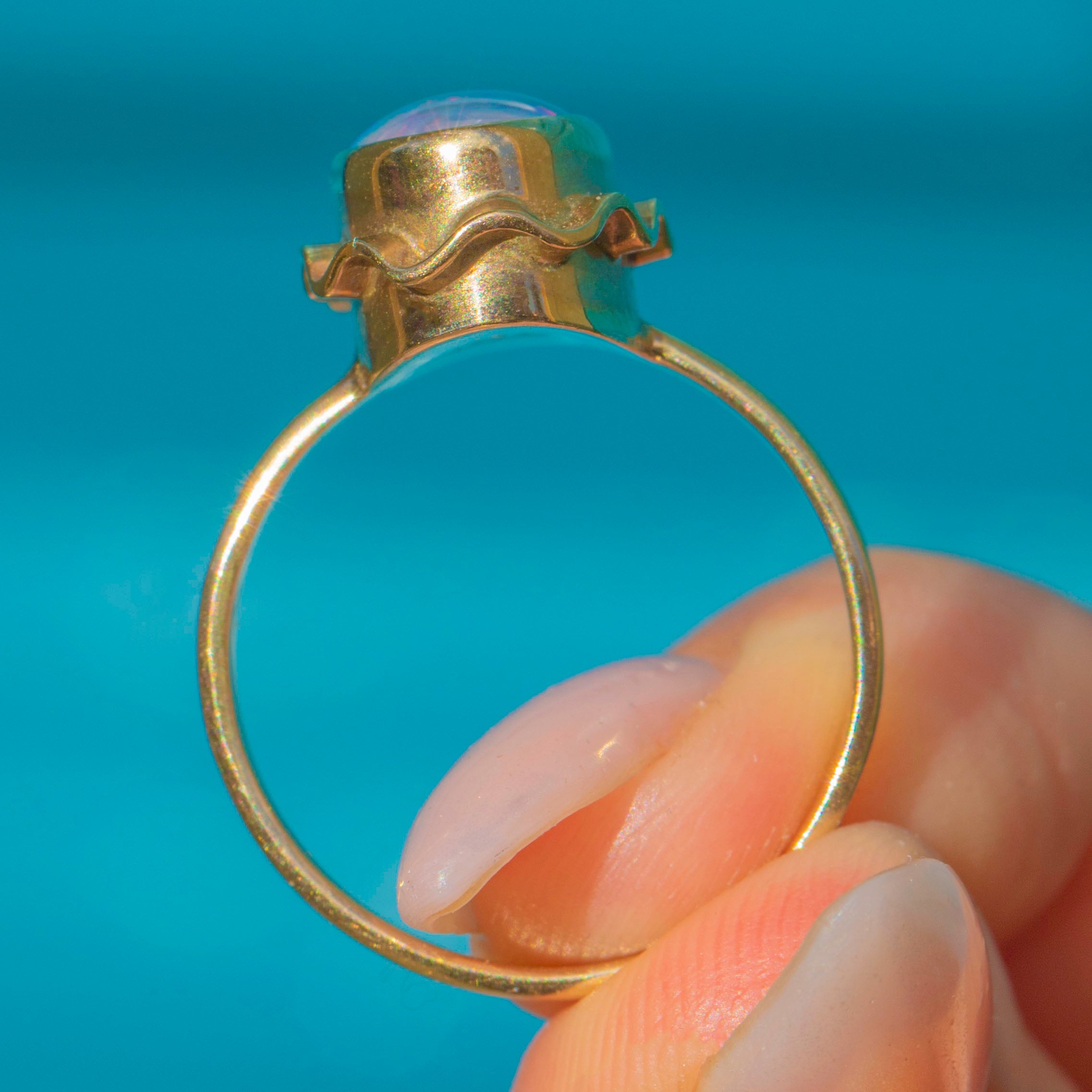 EXCELLENT: The Opal surface is pristine, with no chips, scratches, or abrasions. The closed back setting is strong and secure, and the Gold band shows no wear, presenting the ring in superb condition.