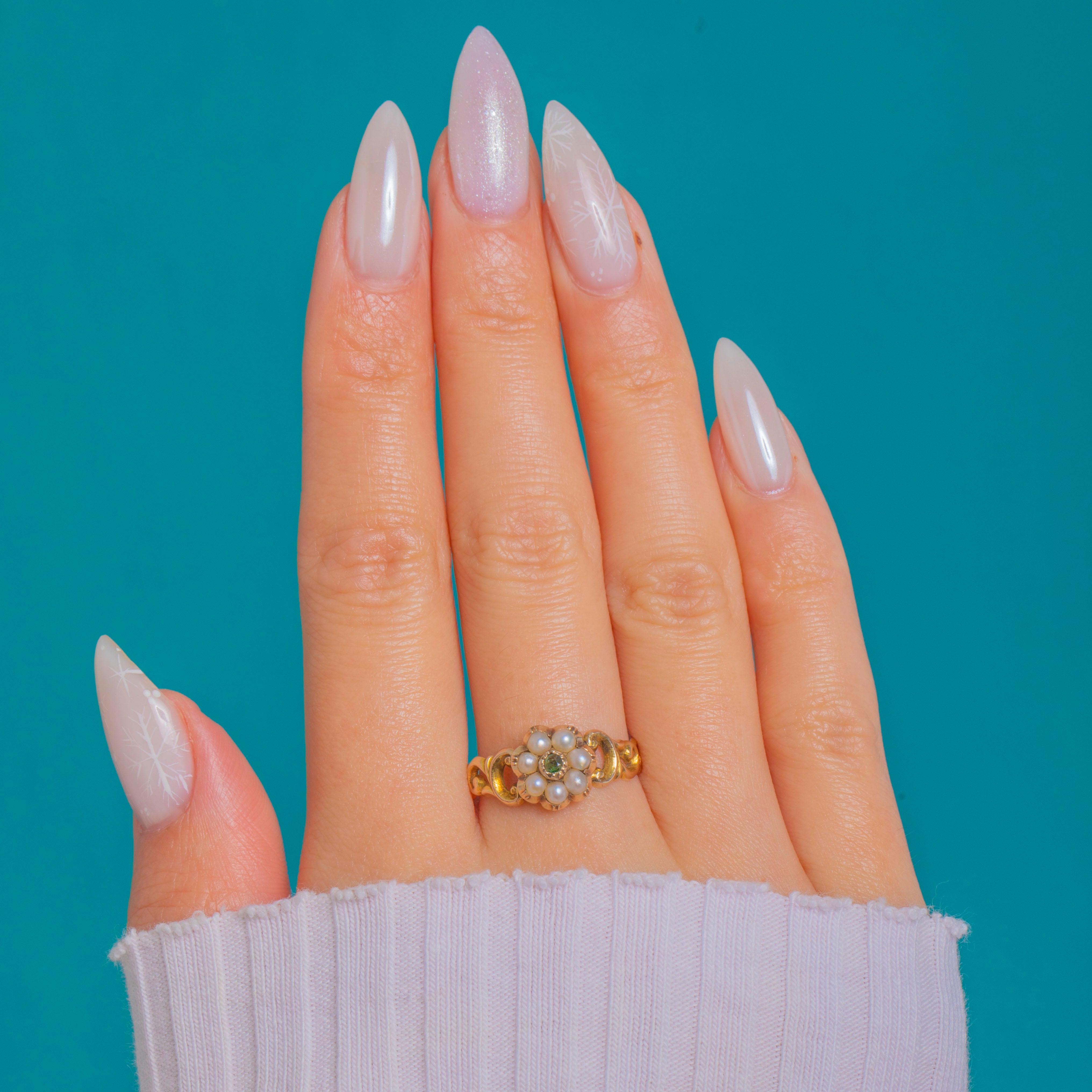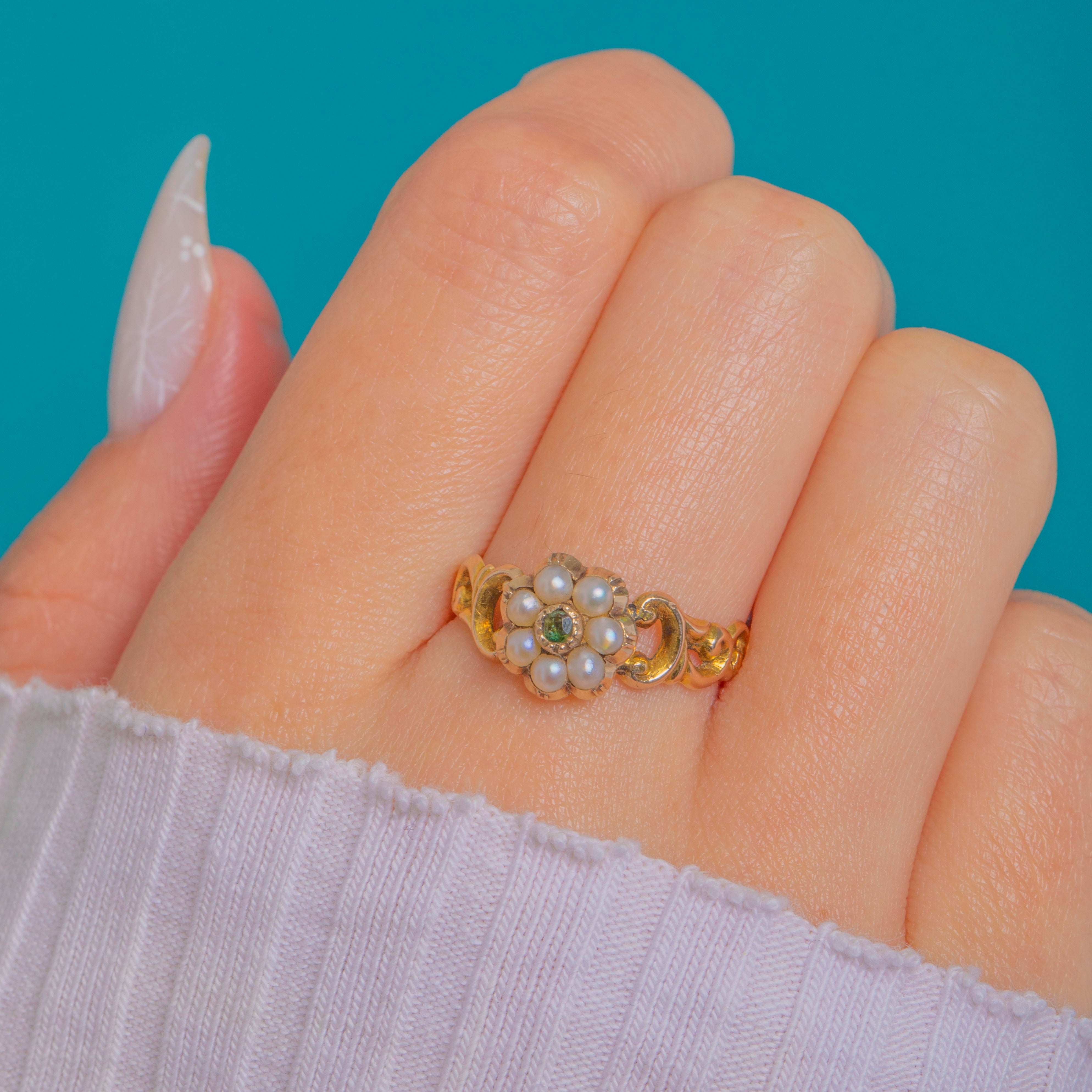 Dainty and romantic, this Victorian daisy cluster ring centres a lively round Emerald within a halo of tiny creamy-white Pearls, all framed by a scalloped, petal-like edge. The head sits low to lightly domed, giving a refined, wearable profile.