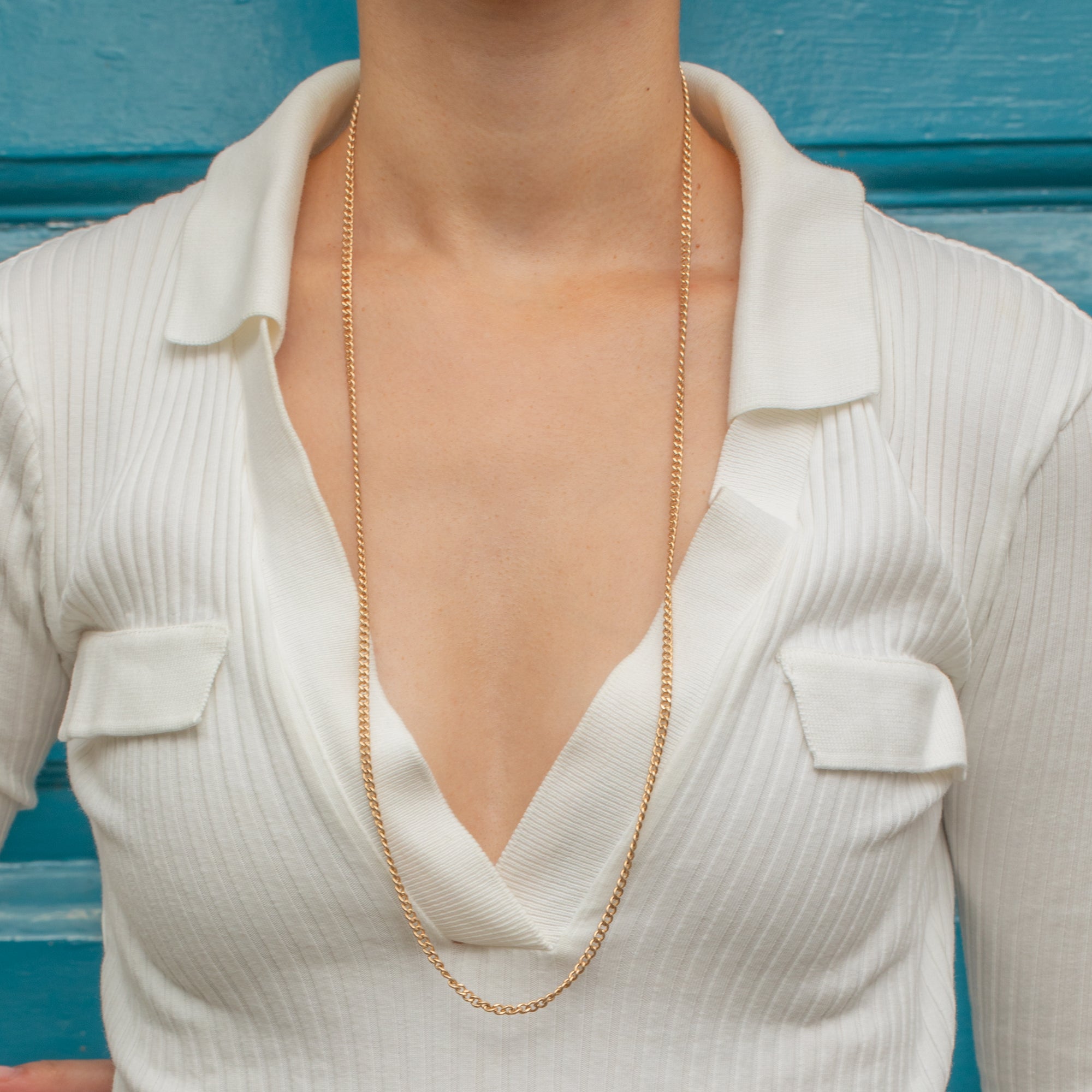 Make this 12ct Gold filled curb link chain your new go-to piece! Her generous 30.5" length is crafted from bright and buttery 12ct filled Gold, and sends Golden glimmers trickling from one curb link to the next, radiating warmth as she adorns your neck.