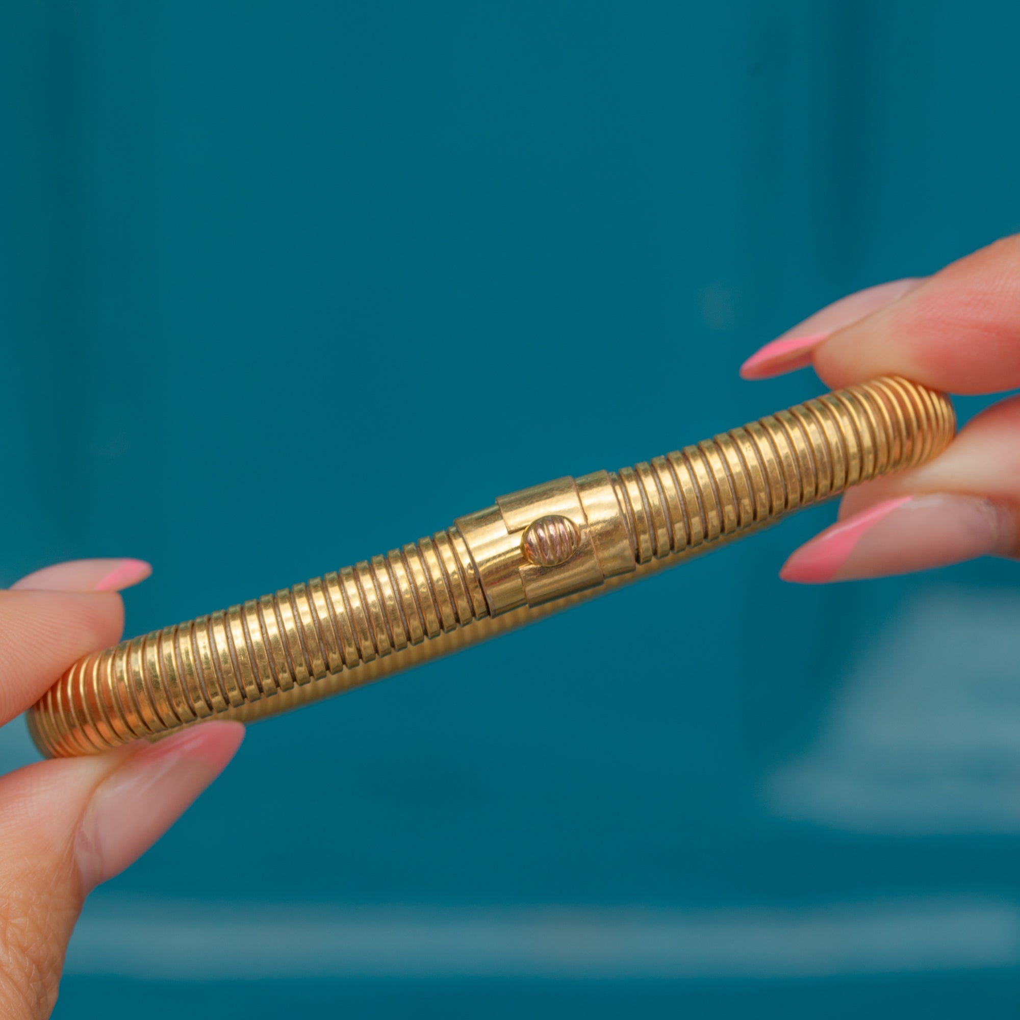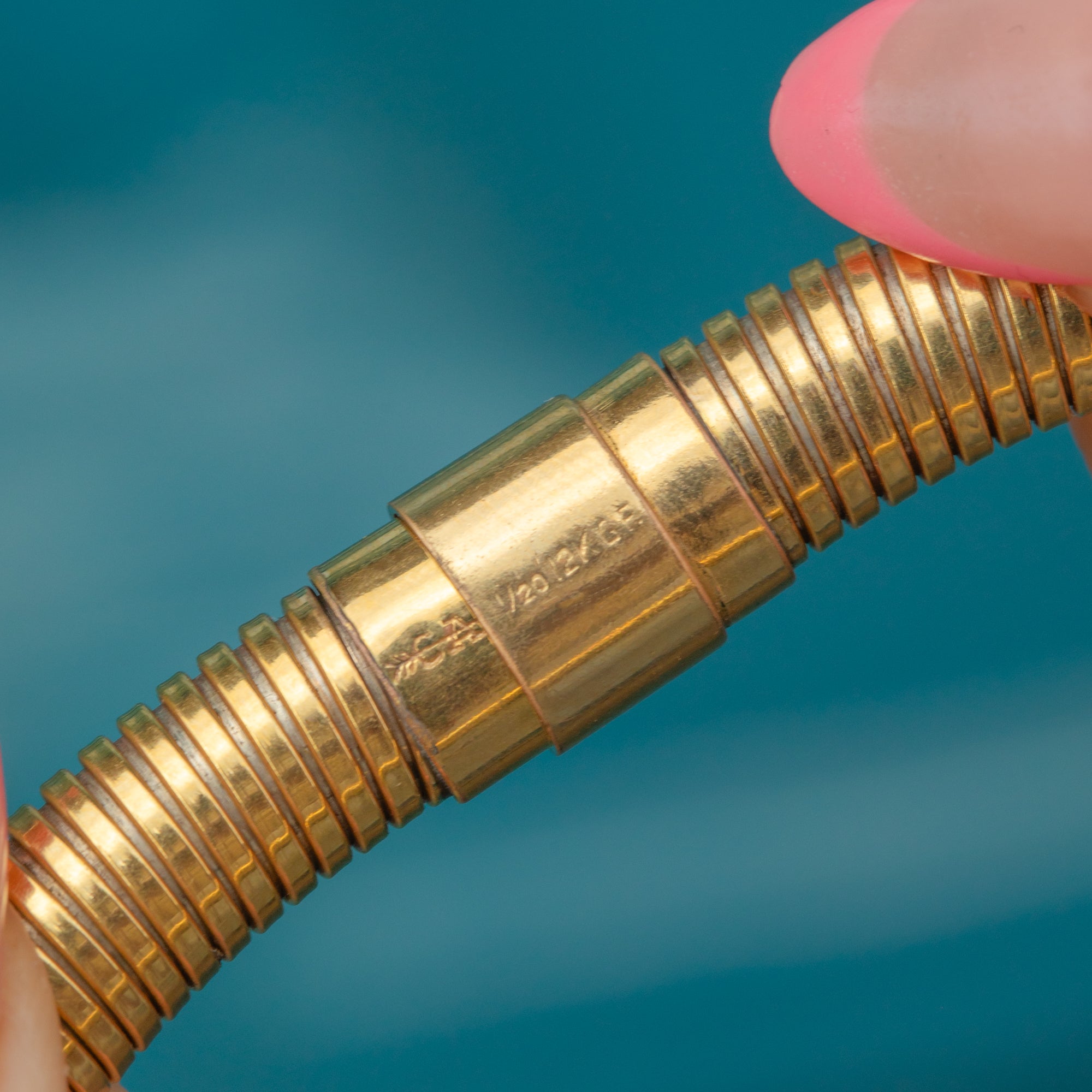 EXCELLENT: This 12ct Gold filled gas pipe bracelet is in wonderful condition. The Gold is bright and buttery and the bracelet moves fluidly. There is very minor surface wear to the clasp, though this cannot be seen when wearing. Fastening securely, this gas pipe bracelet can be worn with confidence.