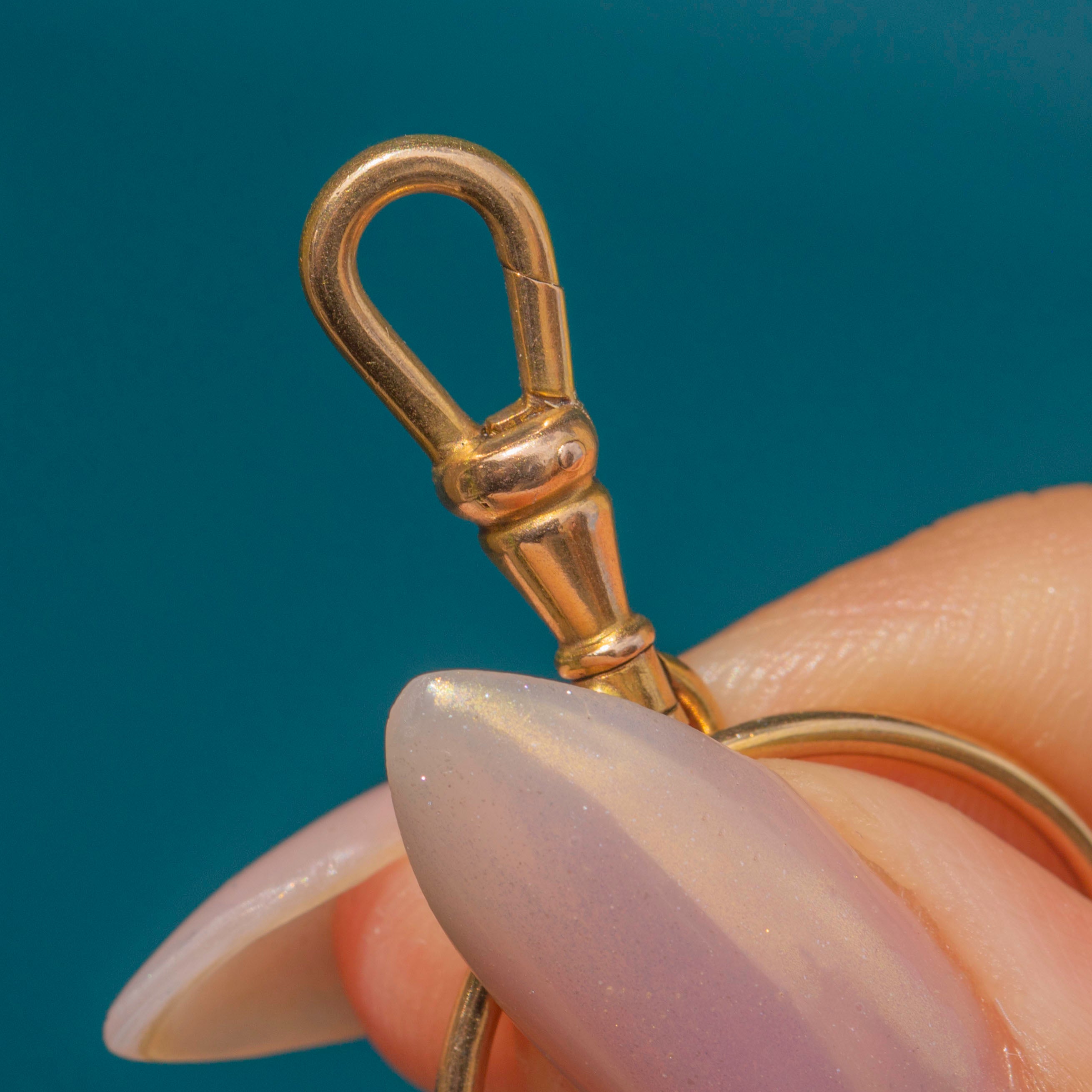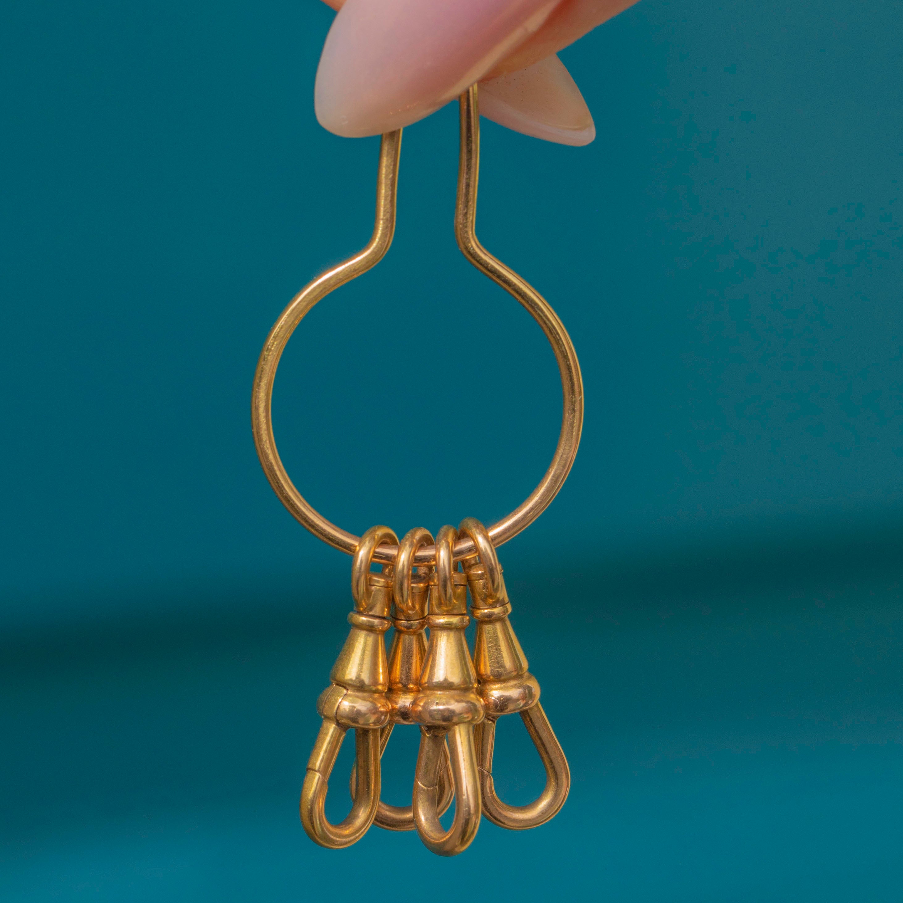 This unusual and versatile charm holder is made up of four antique dog-clip clasps, all stamped “585” for solid 14ct Gold. Dating to the Art Deco period c.1920s, it’s a rare and stylish accessory, allowing you to attach charms, pendants, or chains in multiple creative ways.