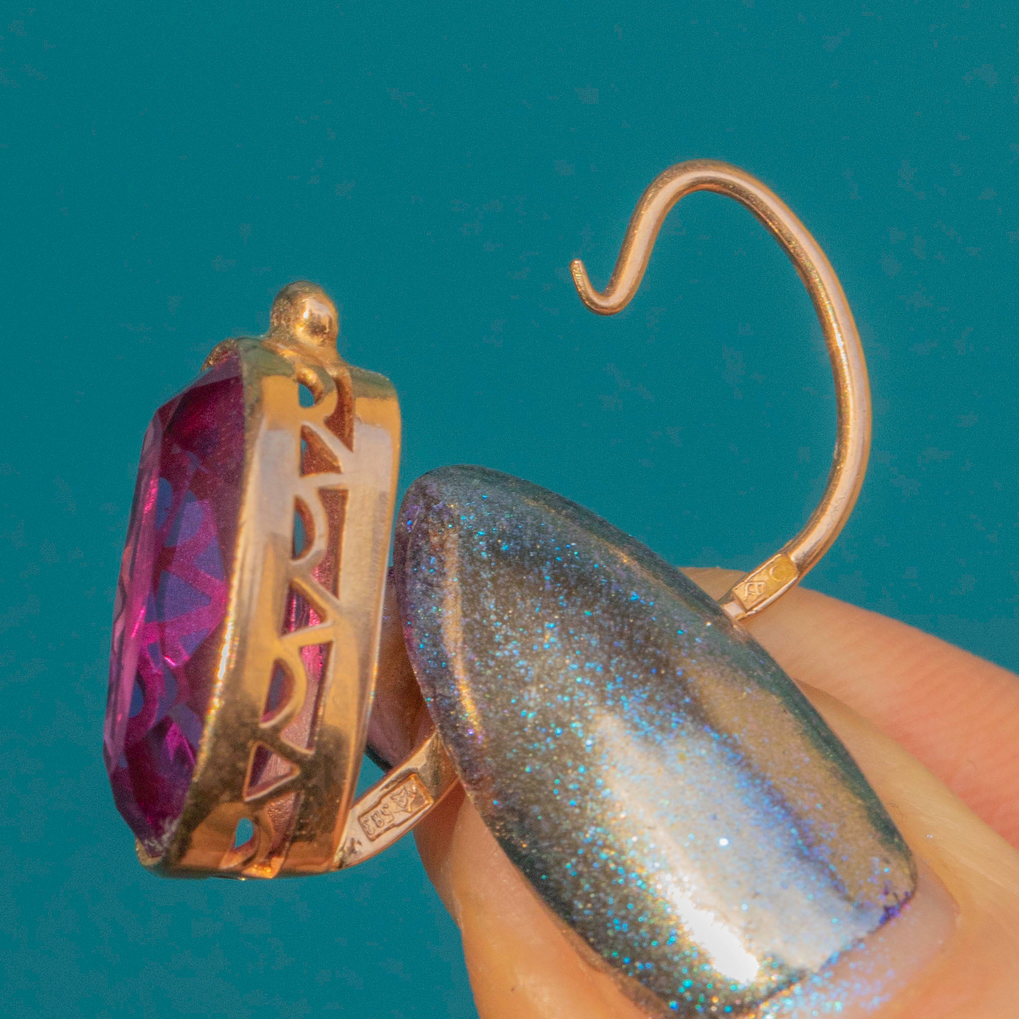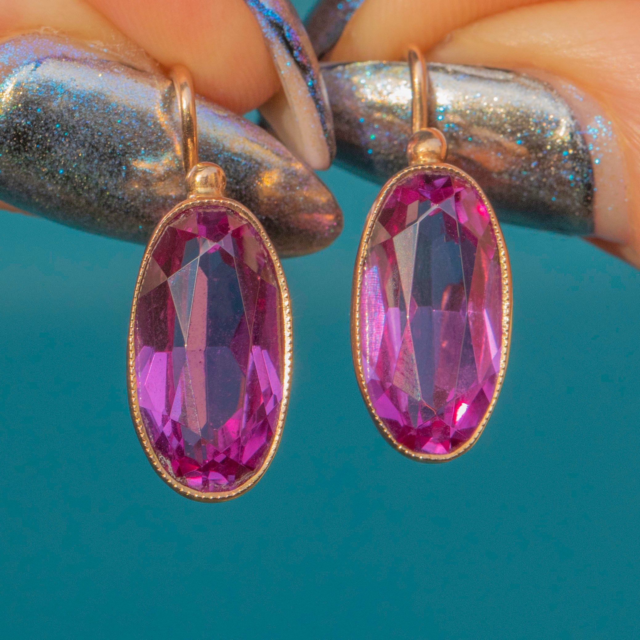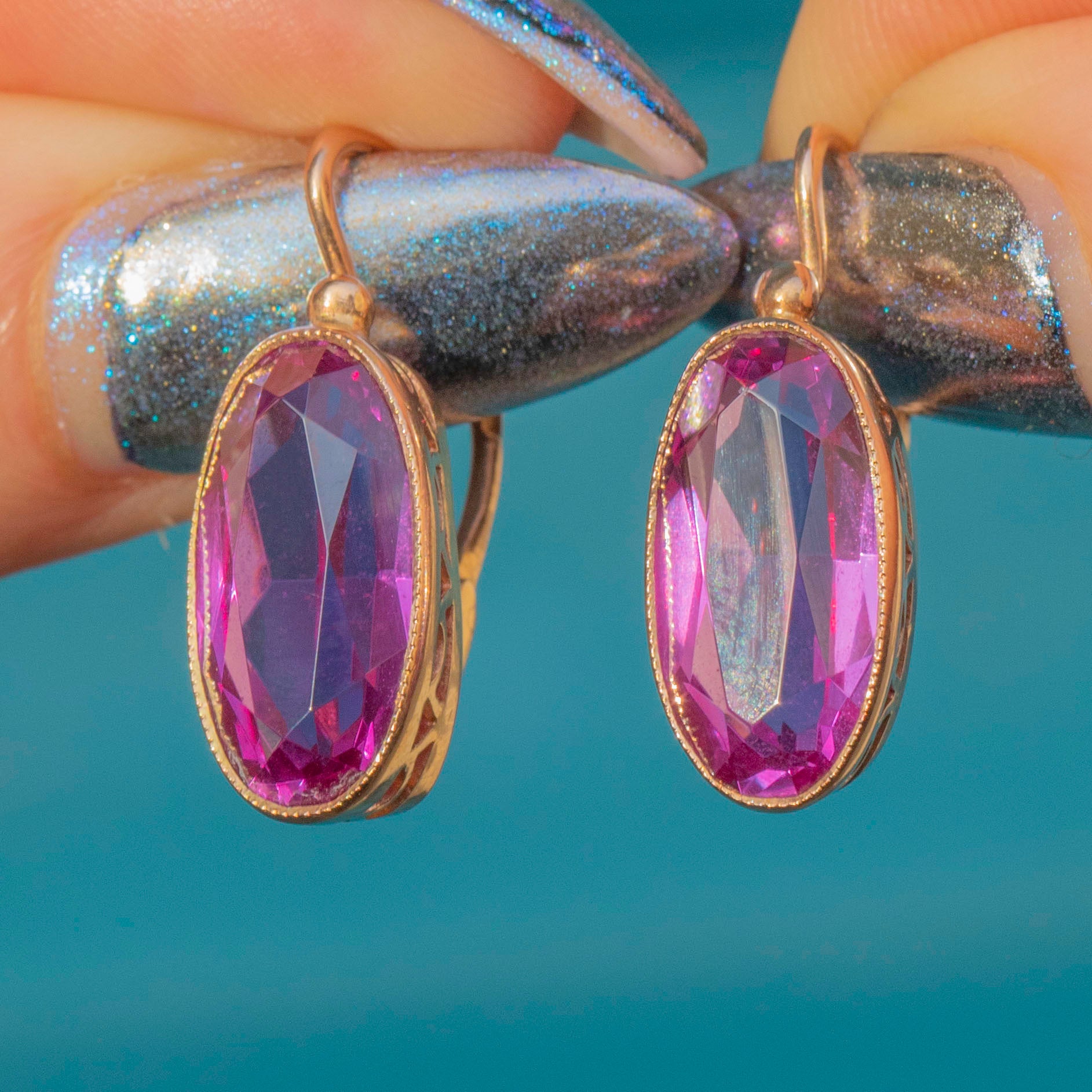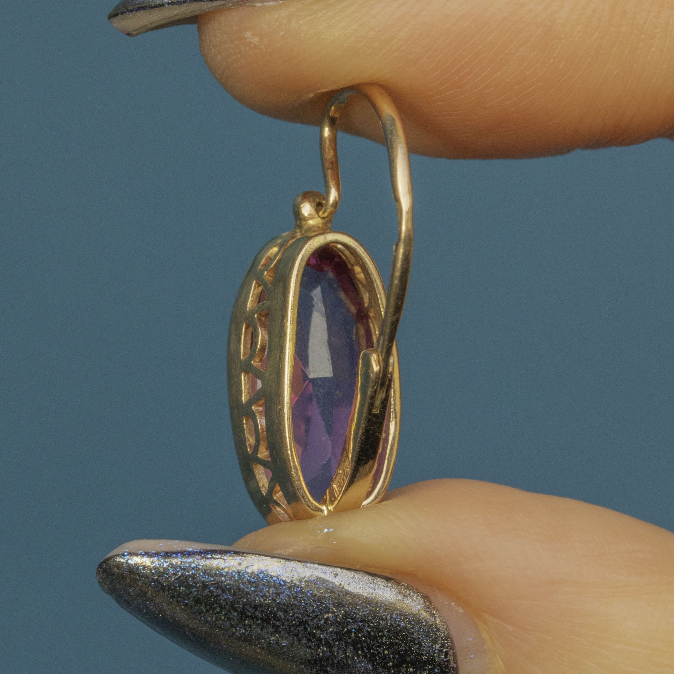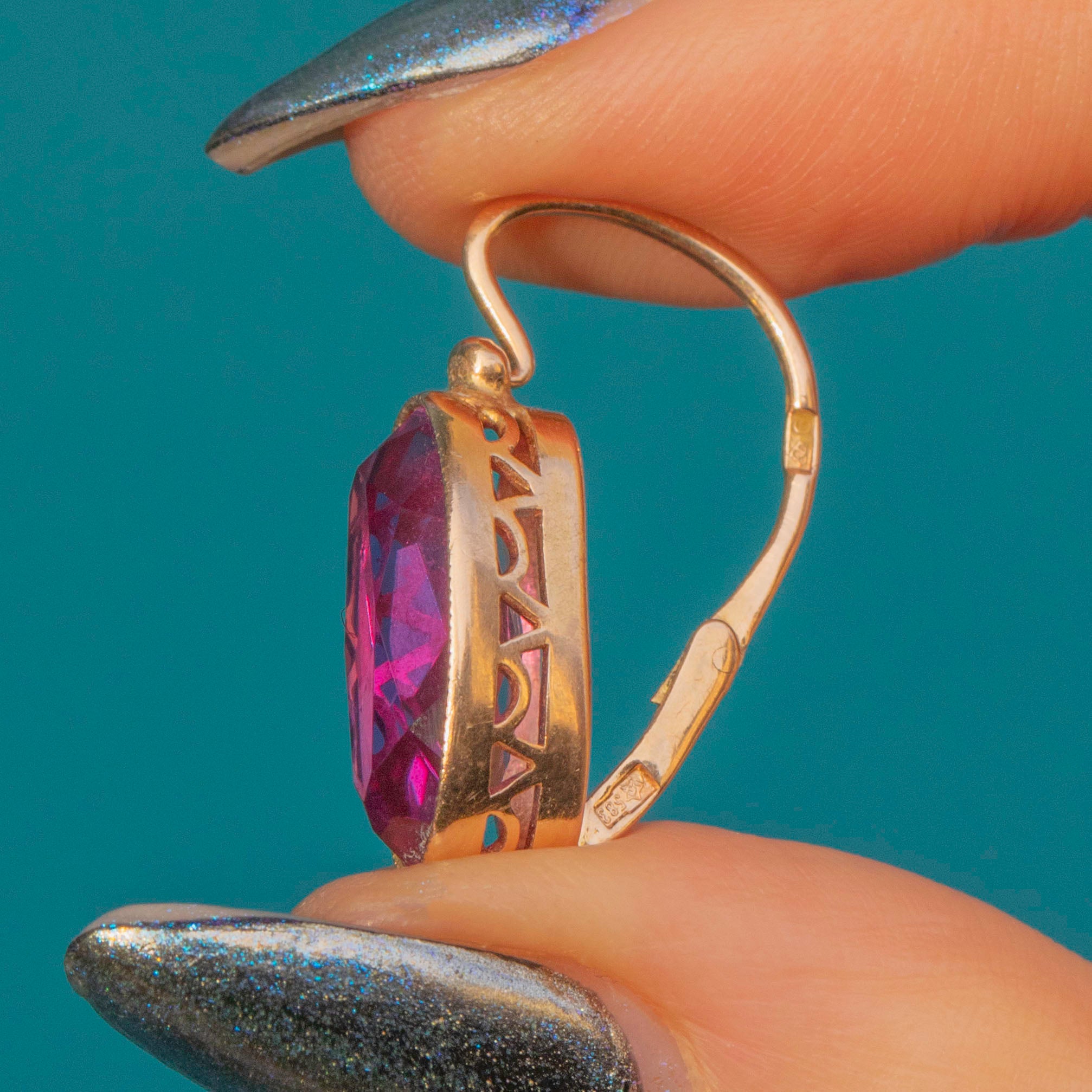 EXCELLENT. These 14ct Gold colour-change Sapphire lever-back earrings are a delight! The stones are remarkable with their punchy fuchsia hue, set into 14ct Gold and complete with lever-backs so you can wear them with confidence. We love this pretty pair!