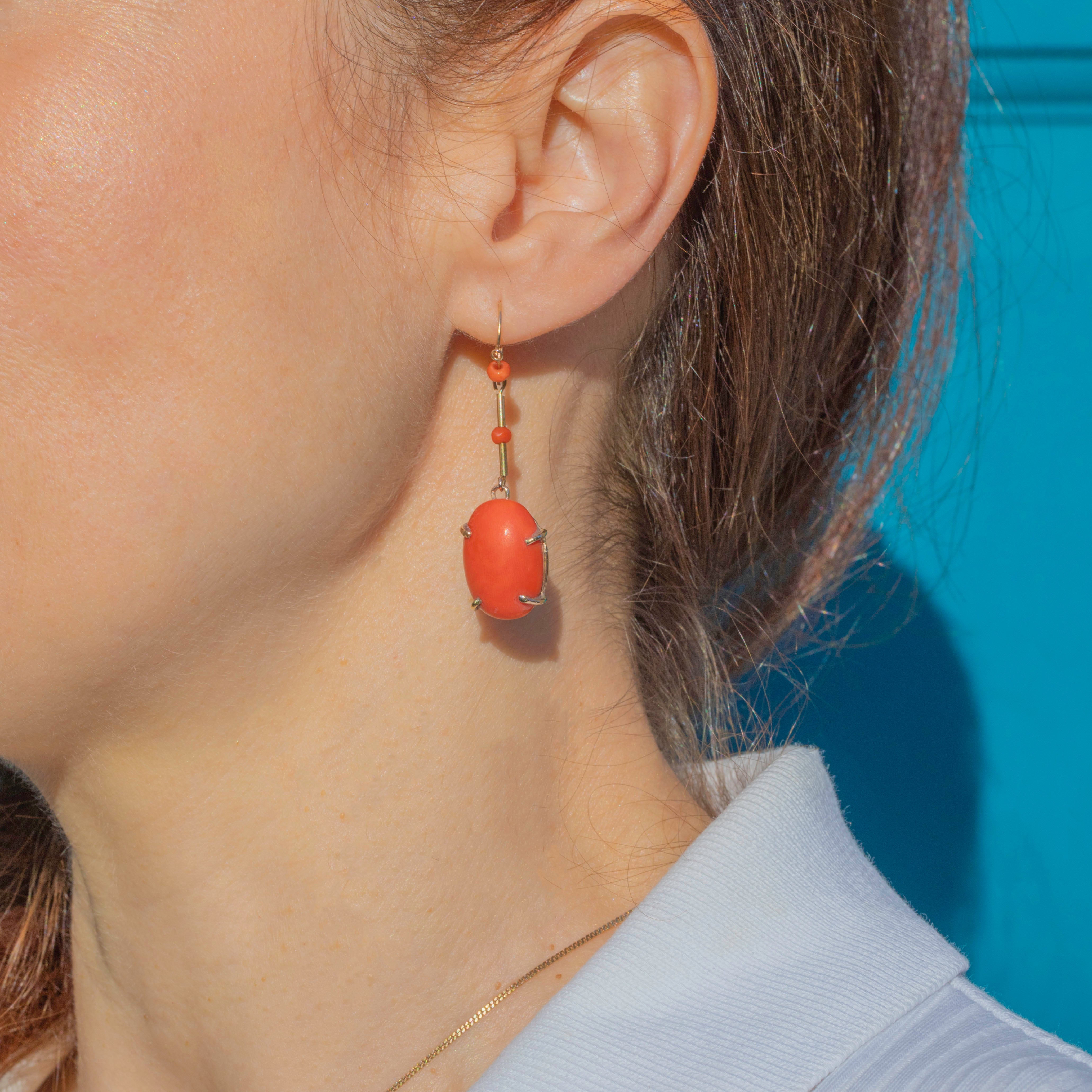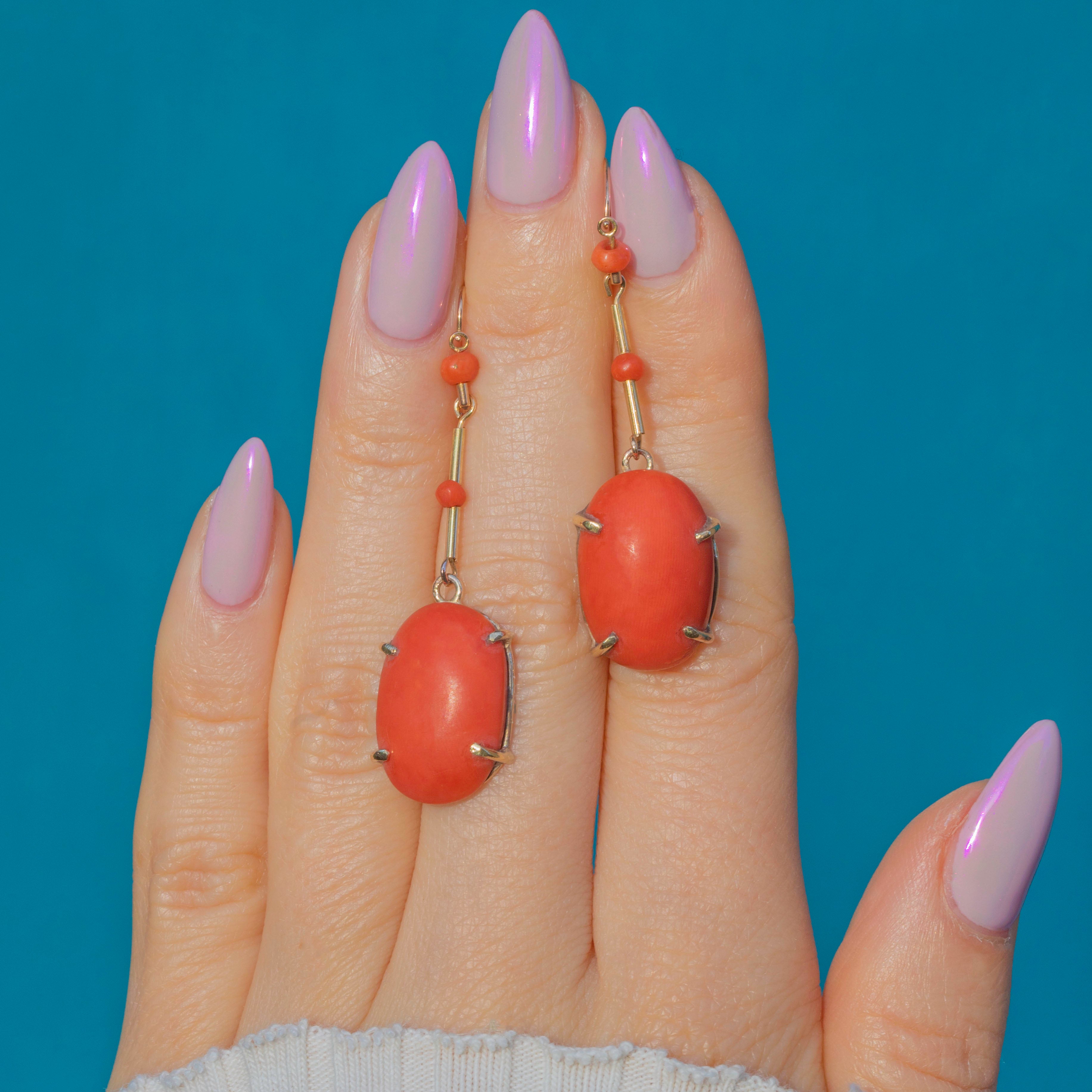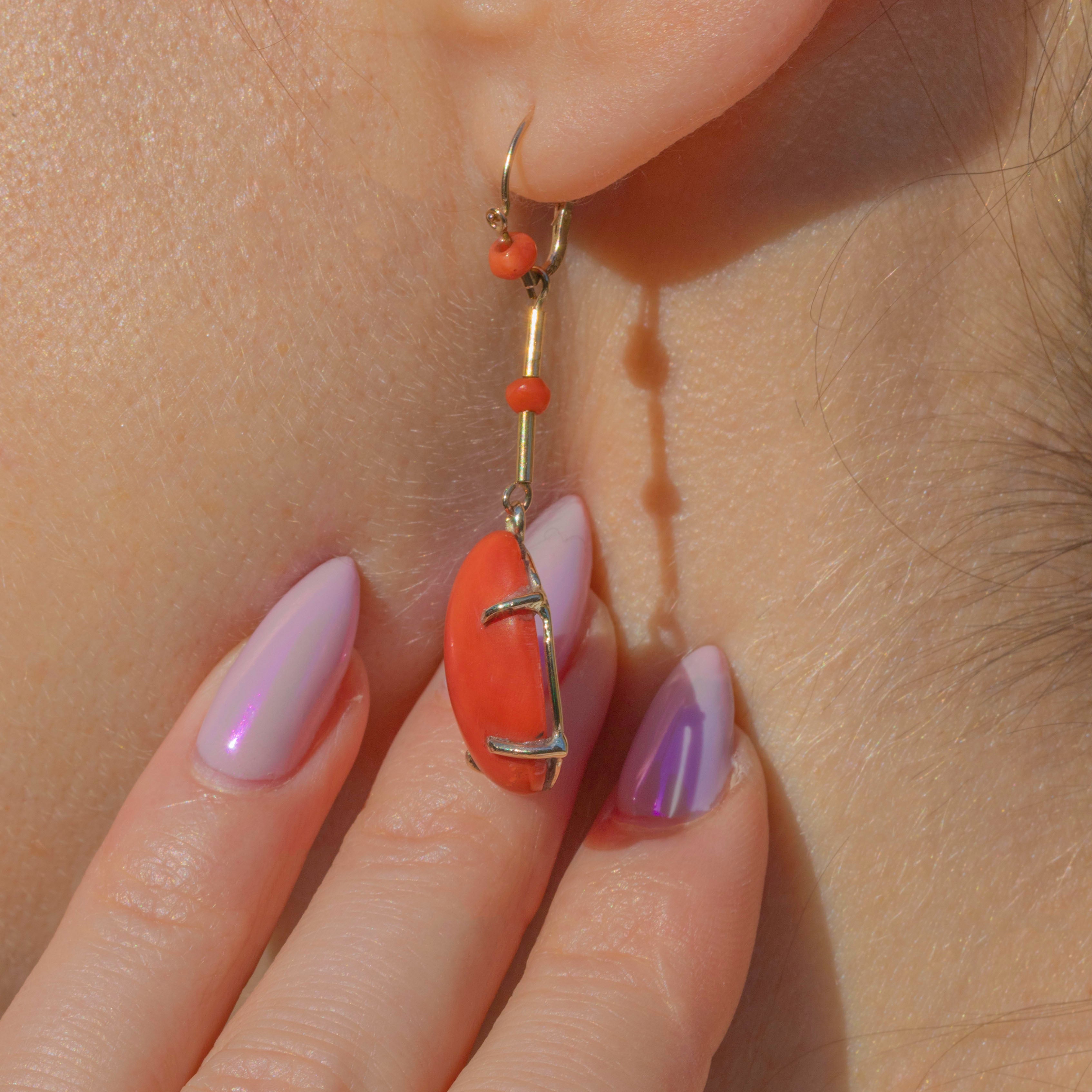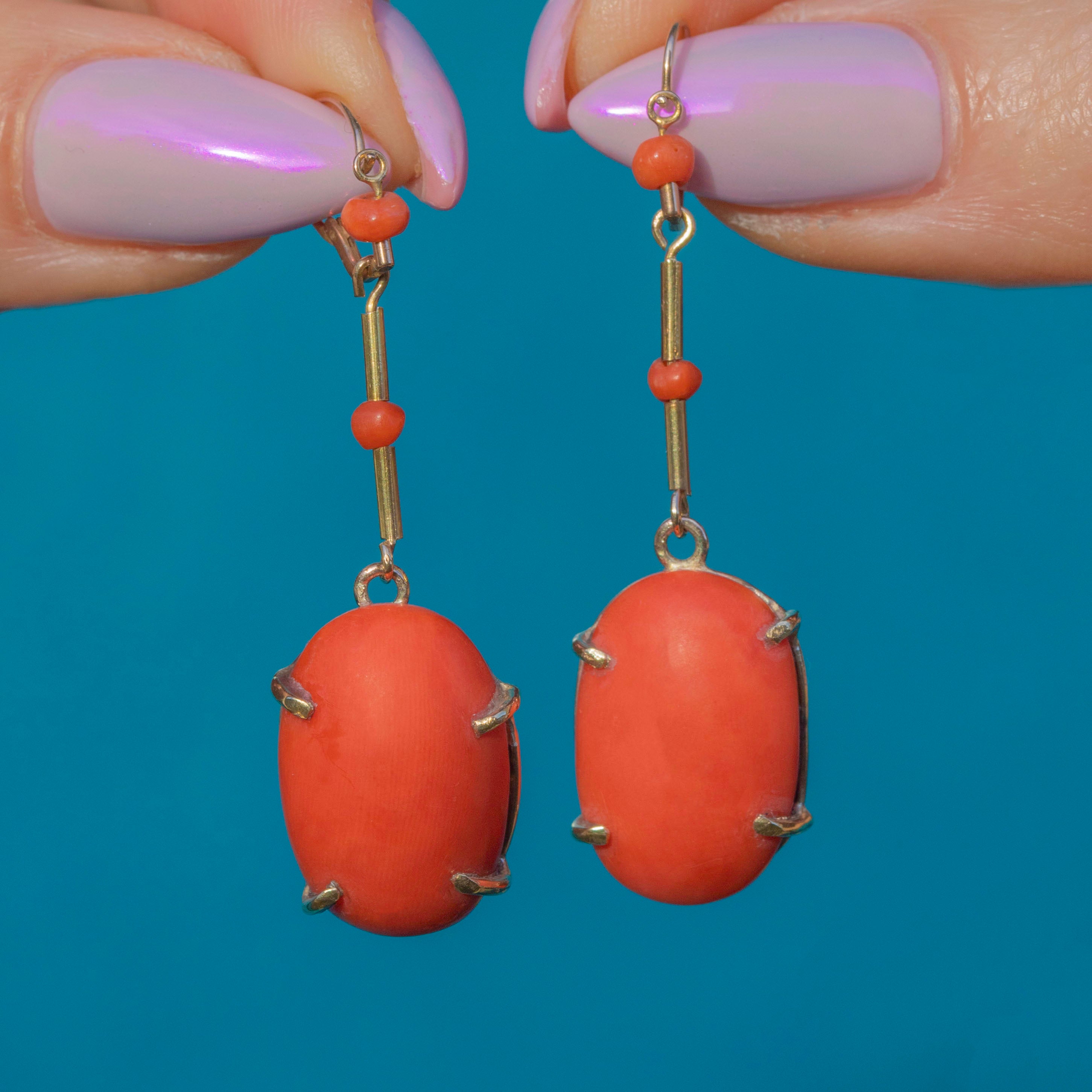 The bold Coral drops are suspended from delicate bar links and smaller Coral beads, creating elegant movement when worn. With their timeless colour and impressive presence, these earrings are both wearable and collectable, a perfect statement of antique Mediterranean style.