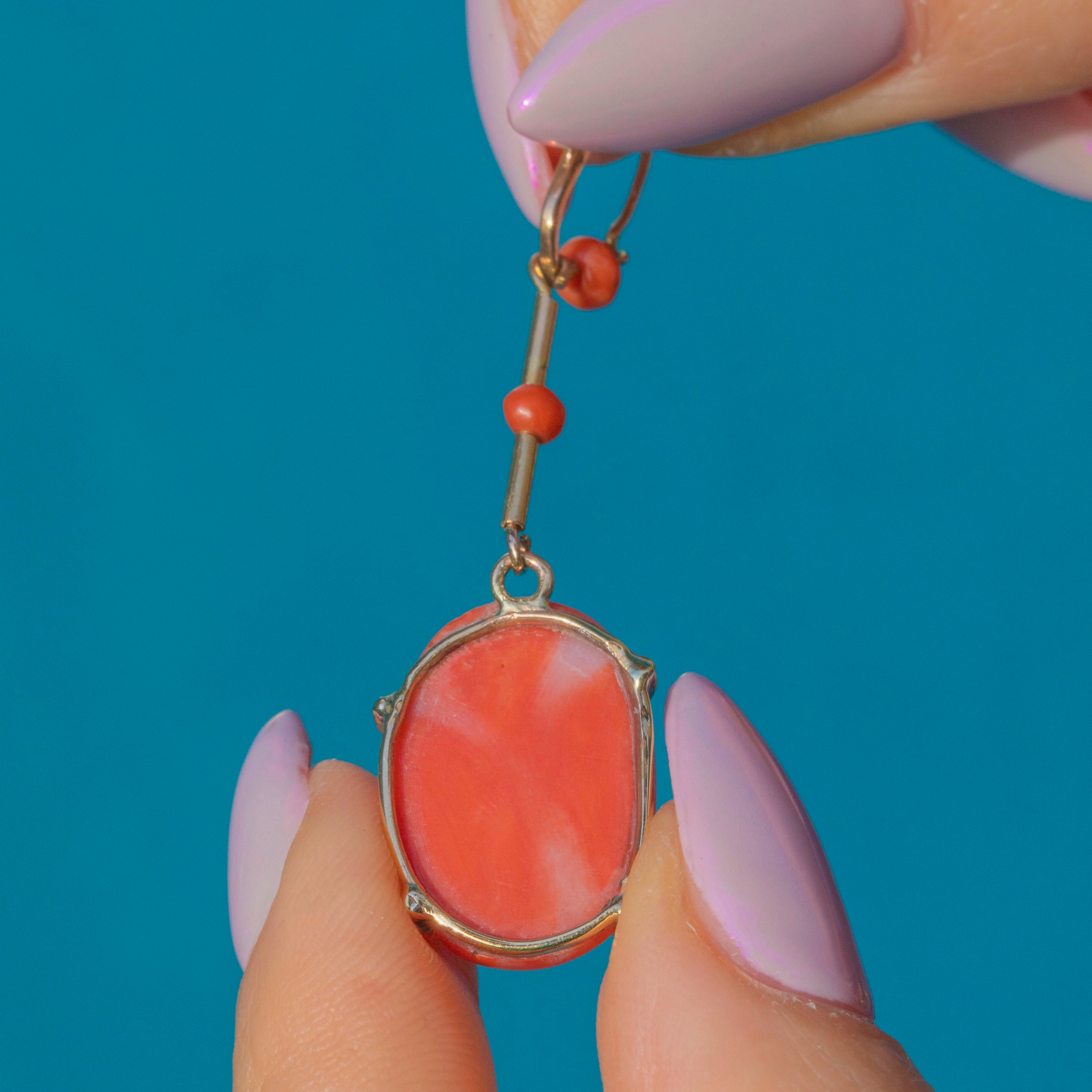 EXCELLENT: The Corals are smooth and vibrant, securely set in their Gold mounts with no chips or cracks. The Gold fittings are strong with minimal wear, ensuring these earrings remain in superb condition for regular wear.