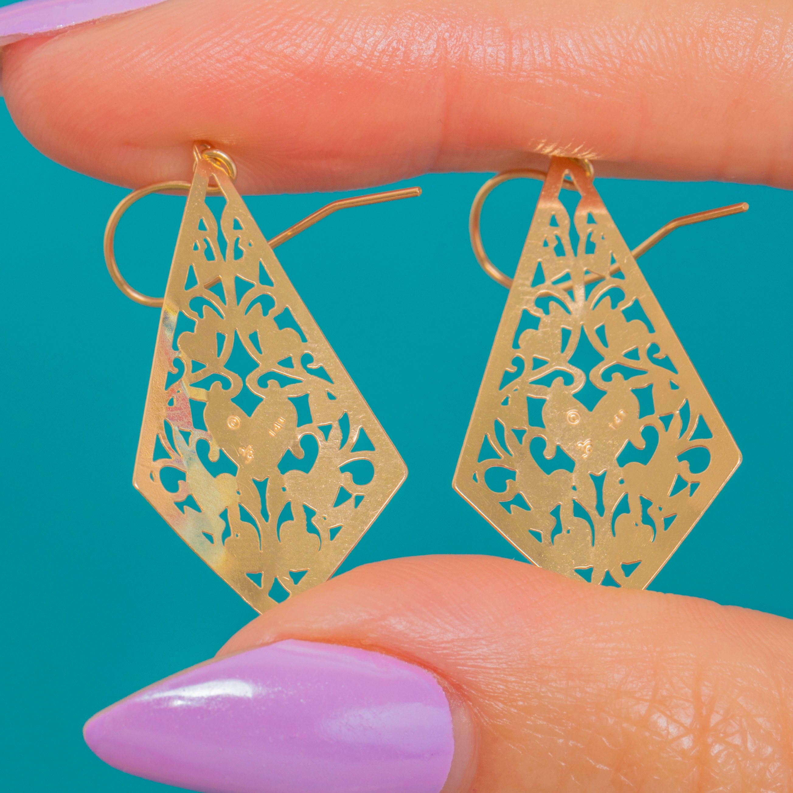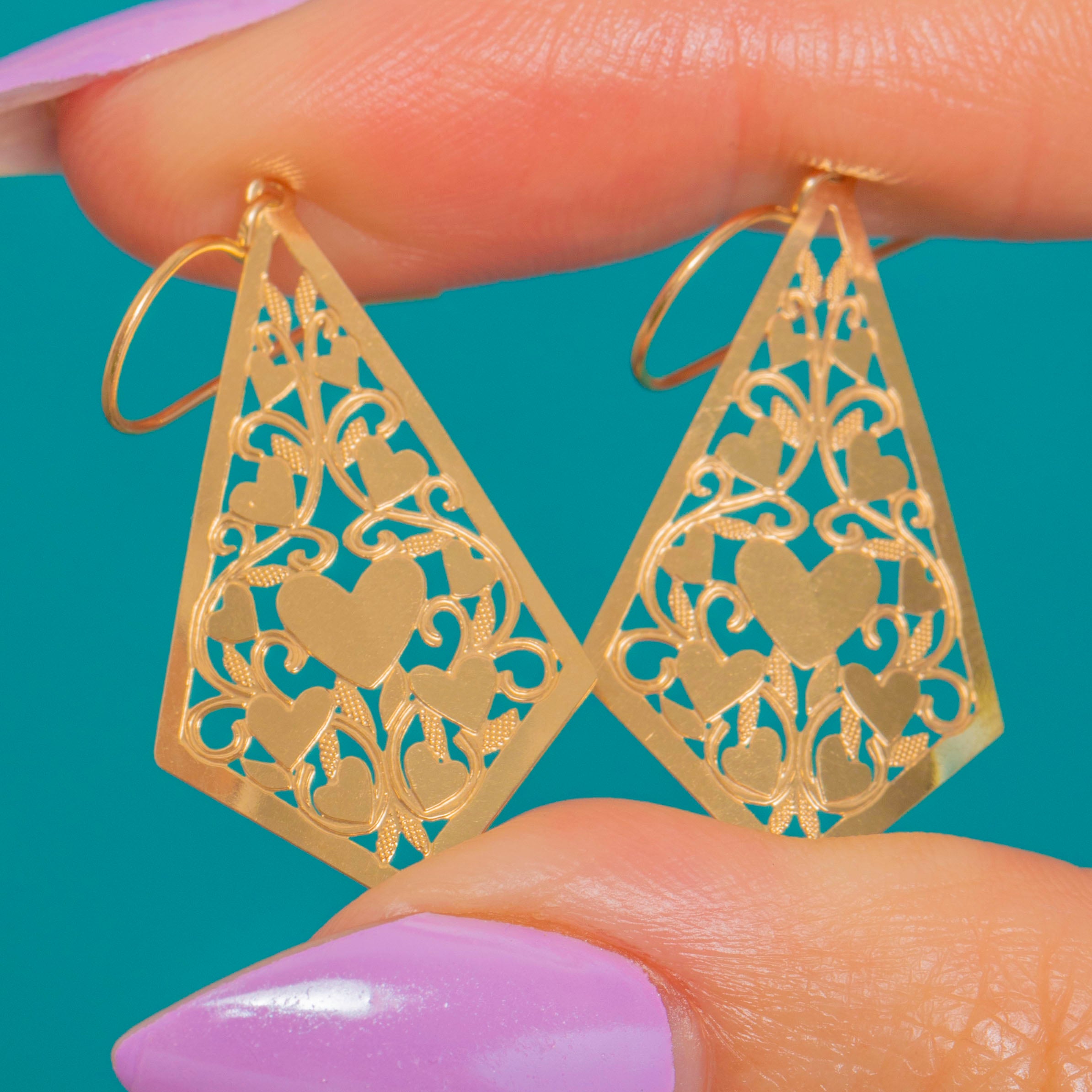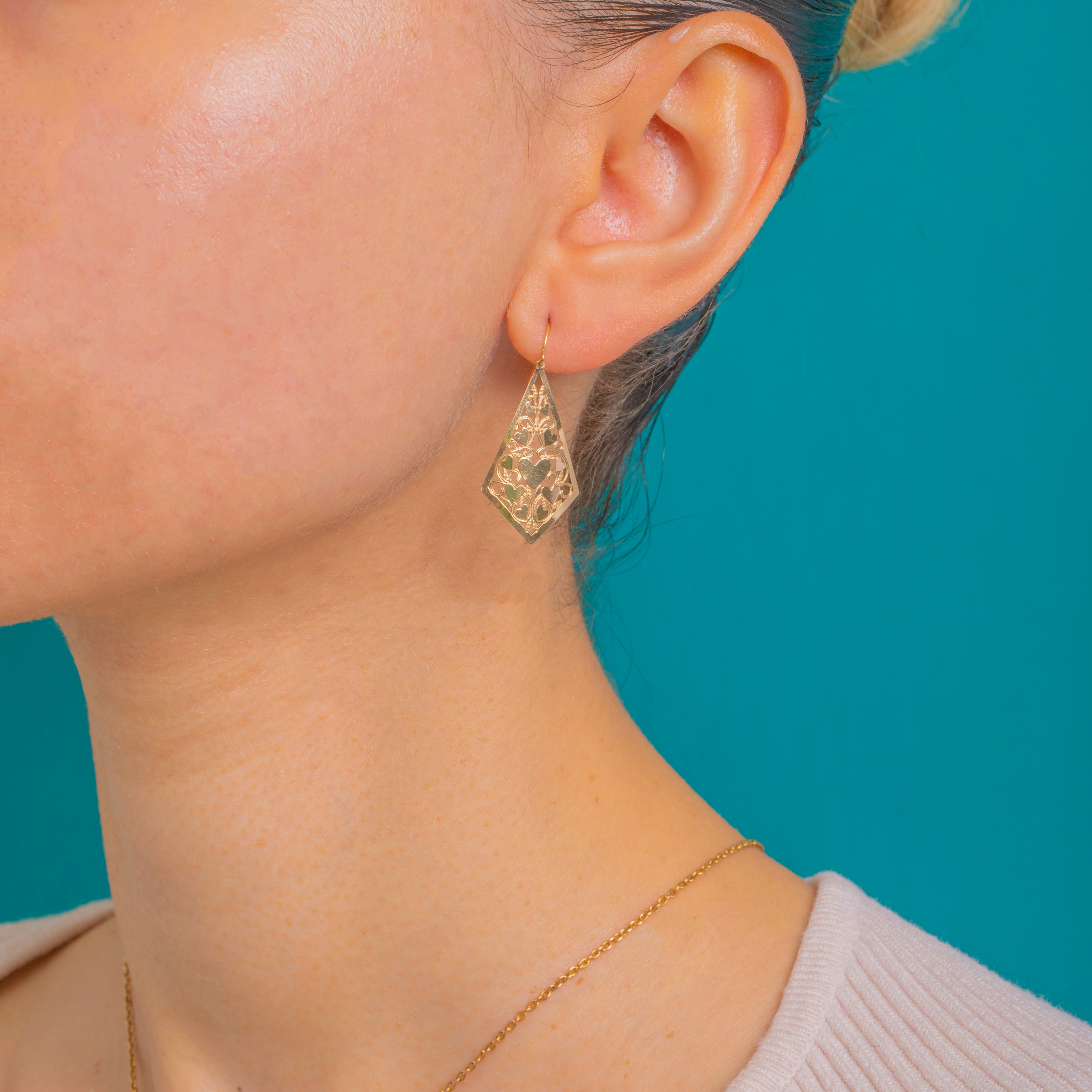Romantic and refined, these vintage 14ct Gold drop earrings are intricately pierced with a symphony of hearts and flowing foliate scrolls, arranged within an elegant kite silhouette. The openwork creates a delicate, lace-like play of light across the highly polished surfaces for an effortlessly feminine finish.