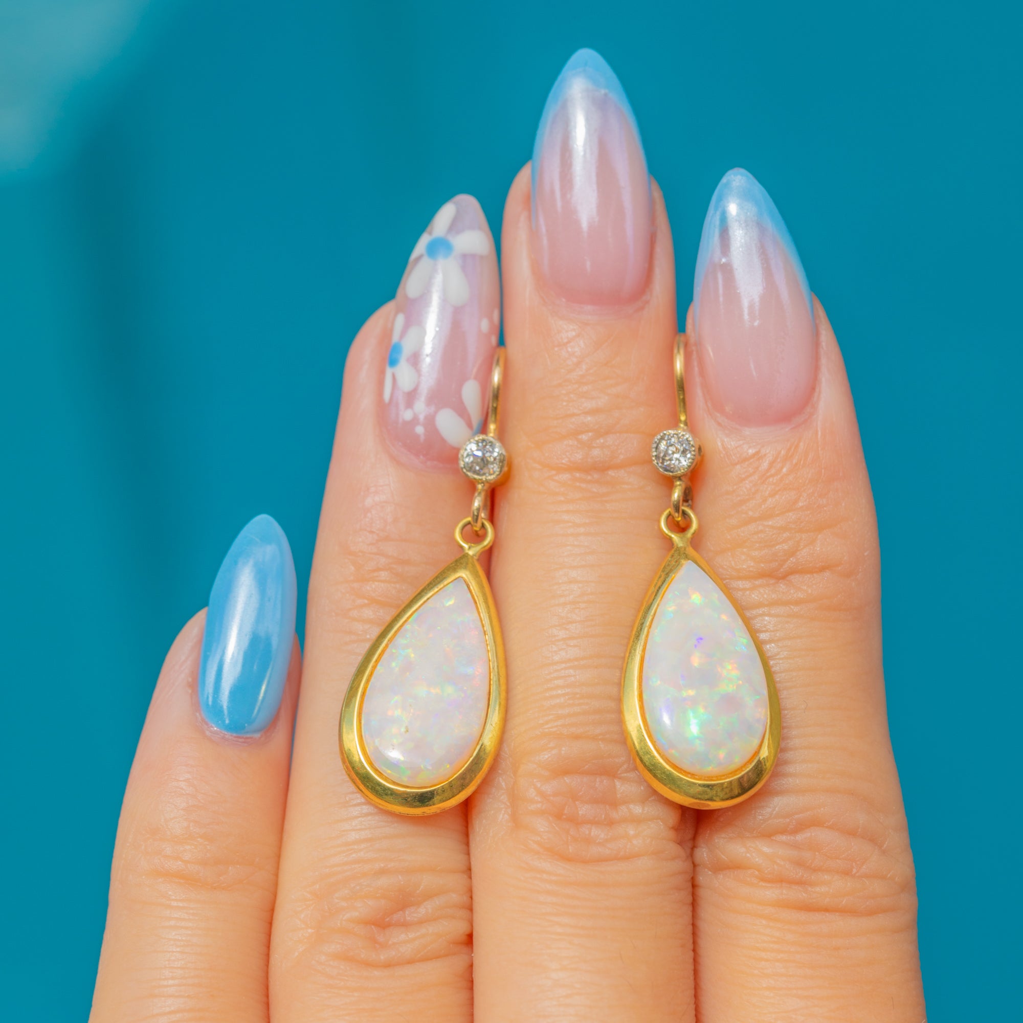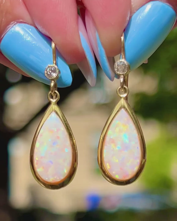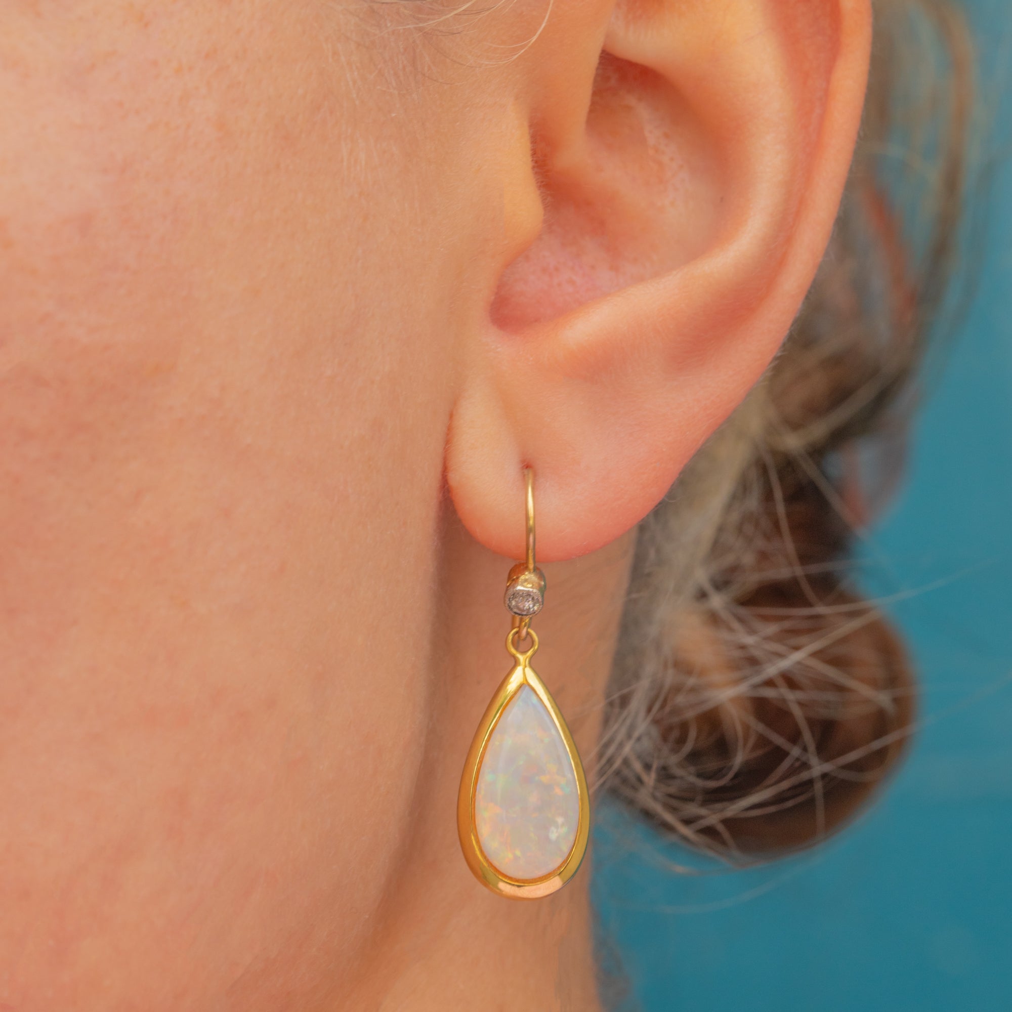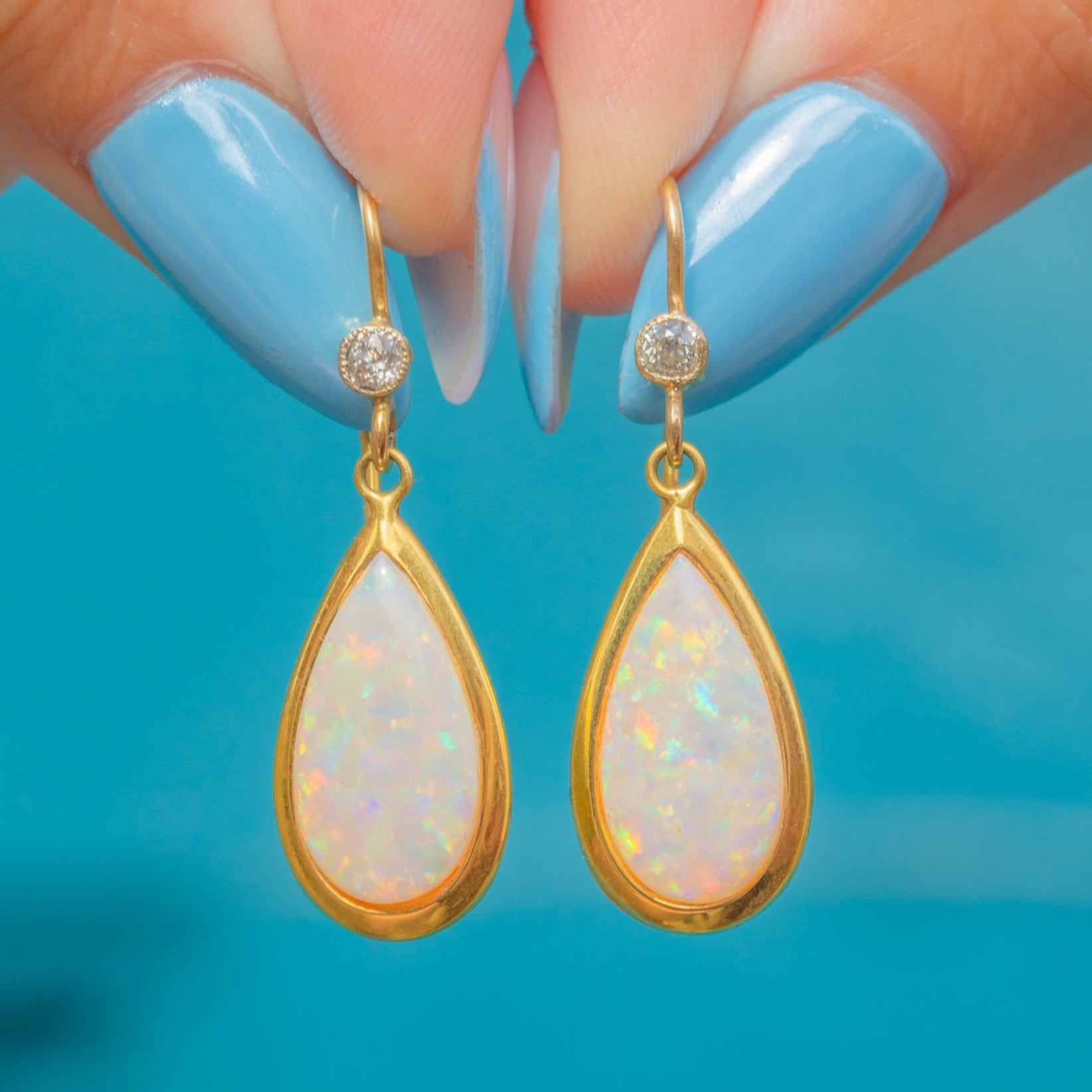 EXCELLENT: The Opals are in fabulous condition and are free from any scuffs or nibbles, as are the Diamonds. The 14ct Gold is bright and glossy, with only some minor scratches to the back of the earrings, which are difficult to spot without a jeweller's loupe. With securely soldered hooks, these vintage drop earrings can be worn with utmost confidence.