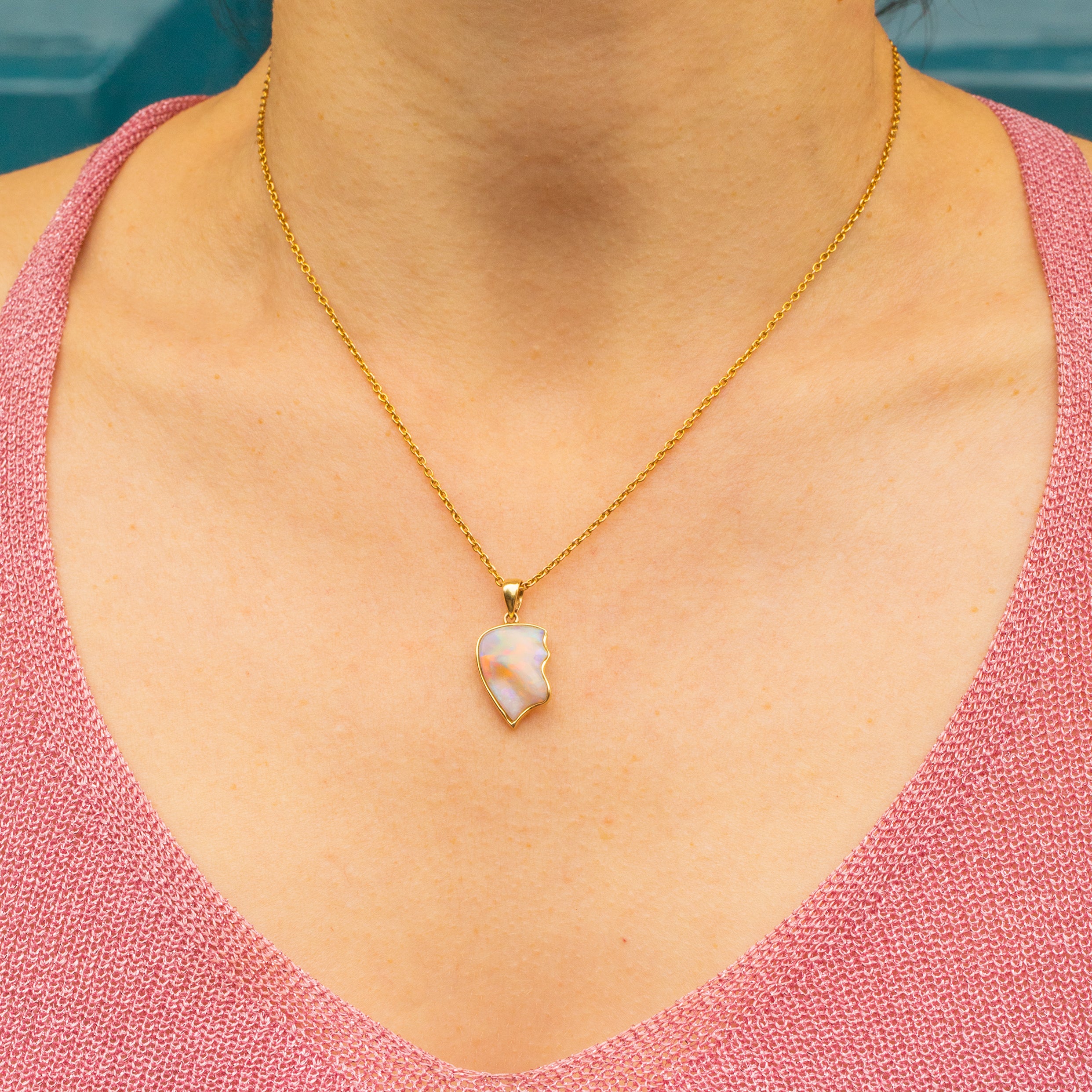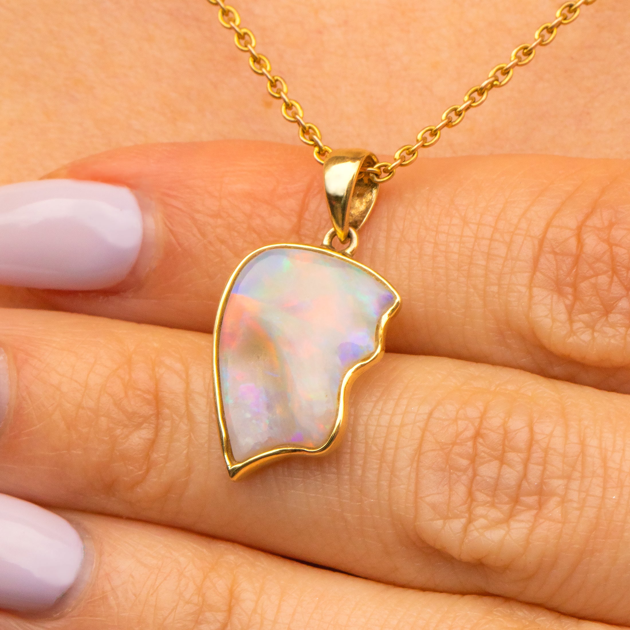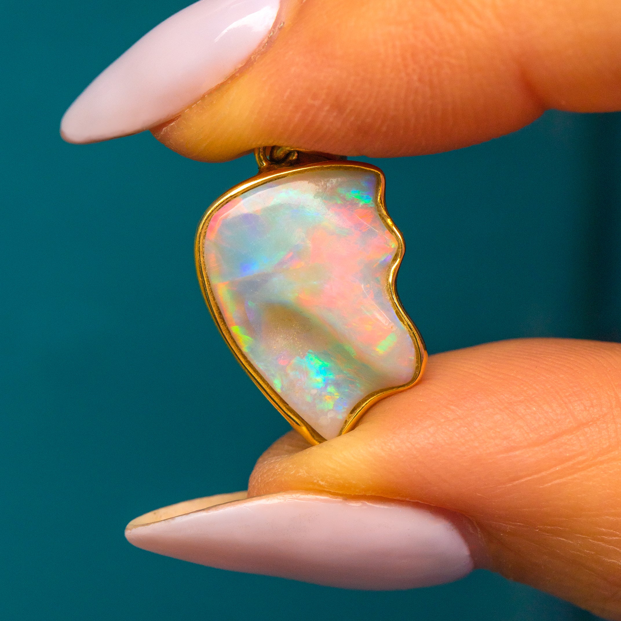 This 14ct Gold Opal pendant would make a unique addition to your jewellery collection. Praising the natural form of the Opal, her organic form is filled with a myriad of iridescent flashes, formed of every colour of the rainbow.